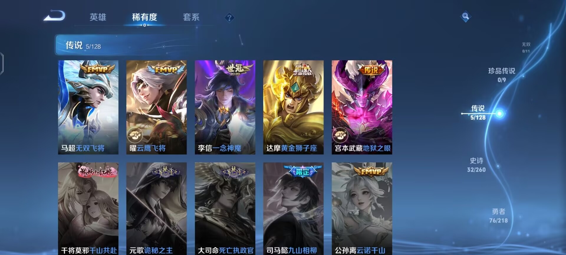 夏侯惇朔风刀,老夫子醍醐杖,沈梦溪大漠名商,盾山御銮,苏烈千军破阵,典韦穷奇,达摩沙漠行僧,牛魔御旌,兰陵王金庭之子,裴擒虎擒涛扼浪,鲁班大师探海日志,明世隐疑决卦,马可波罗暗影游猎,鬼谷子原初探秘者,桑启海盐诗旅,狄仁杰万华元夜,芈月重明,程咬金演武夺筹,李元芳云中旅人,弈星混沌棋,米莱狄御霄,钟馗驱傩正仪,狂铁御狮