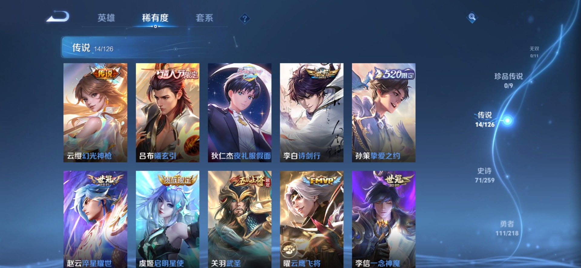 刘备时之恋人,赵云淬星耀世,干将莫邪久胜战神,李信一念神魔,孙策挚爱之约,达摩黄金狮子座,吕布曦玄引,狄仁杰夜礼服假面,曜云鹰飞将,云缨幻光神枪