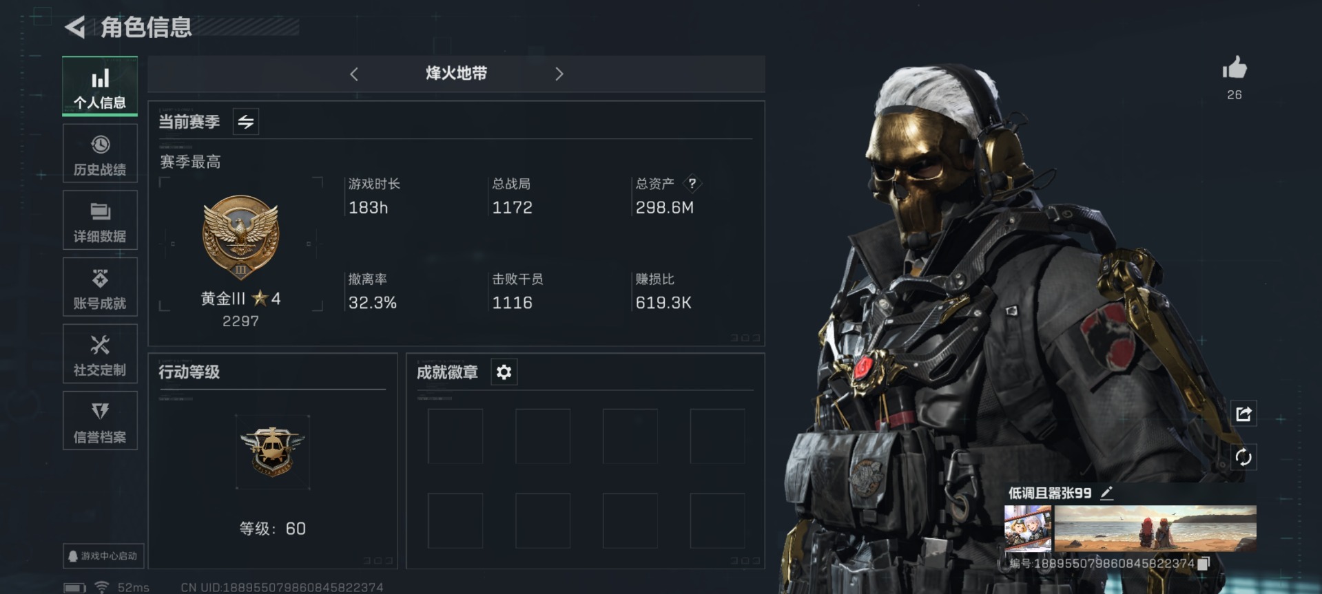 - [11685407]总资产:43.4M 哈夫币:13.064K 可二次 可修改实名 烽火地带段位:青铜 全面战场段位:无段位