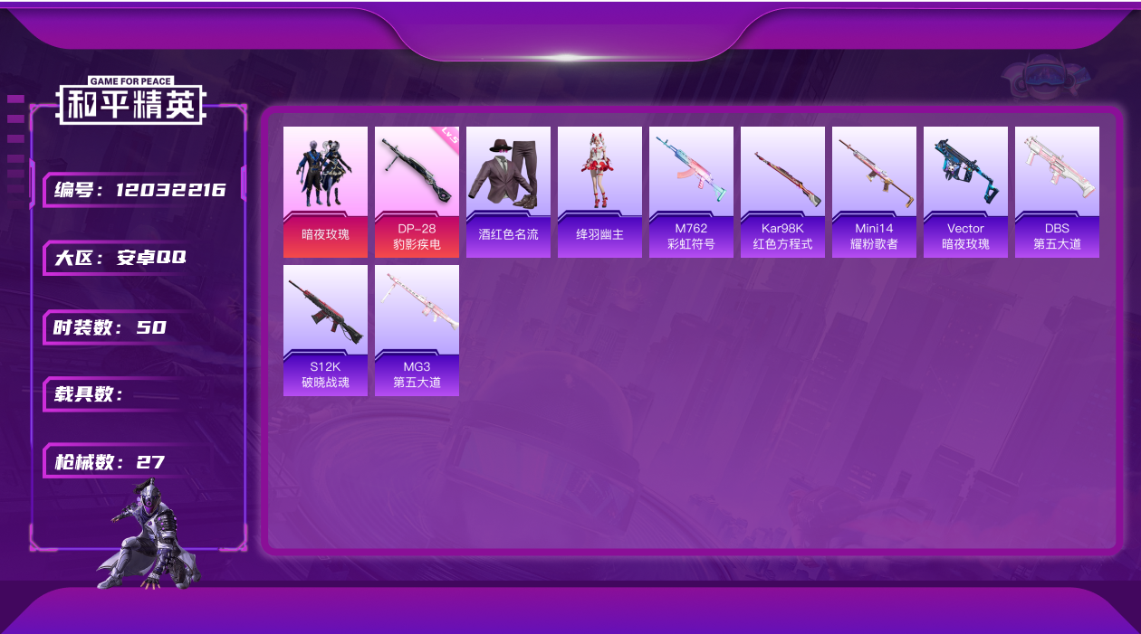 [12032216]1粉装 1特效枪 可二次 可修改实名 热门装扮:暗夜玫瑰 稀有枪皮:DP-28-豹影疾电 五级特效枪:五级DP-28-豹影疾电 紫色装扮:酒红色名流,绛羽幽主