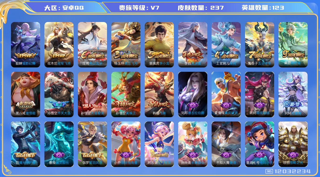[12032234]V7 5传说 123英雄 237皮肤 可修改实名 优质装备:冠军飞将,猫影幻舞 珍宝阁皮:优雅恋人,蔷薇恋人 限定皮:鸣野蒿,凤求凰(白切鸡),飞衡(韩信年限),遇见飞天,高山流水,齐天大圣,五谷丰年,梁祝,李小龙,猪悟能,大圣娶亲,美猴王 史诗皮:化蝶舞,龙之律动,苍穹之光,电玩小子(小书包),黄金分割率,特工魅影,千年之狐,江河有灵,百解令(蒙犽),偶像歌手,暗夜猫娘,魅语,冰冠公主,末日机甲-吕布,女仆咖啡,水果甜心,绅士熊喵,星夜王子,心灵骇客,德古拉伯爵,幽灵船长,鬼剑武藏,心灵战警,舞动绿茵,纤云弄巧,繁星吟游(呼啦呼啦),拒霜思,缤纷独角兽,乘风破浪,水晶猎龙者,曙光守护者,箭羽风息,金属风暴,圣诞恋歌,鹰眼统帅,魅力维加斯,无心