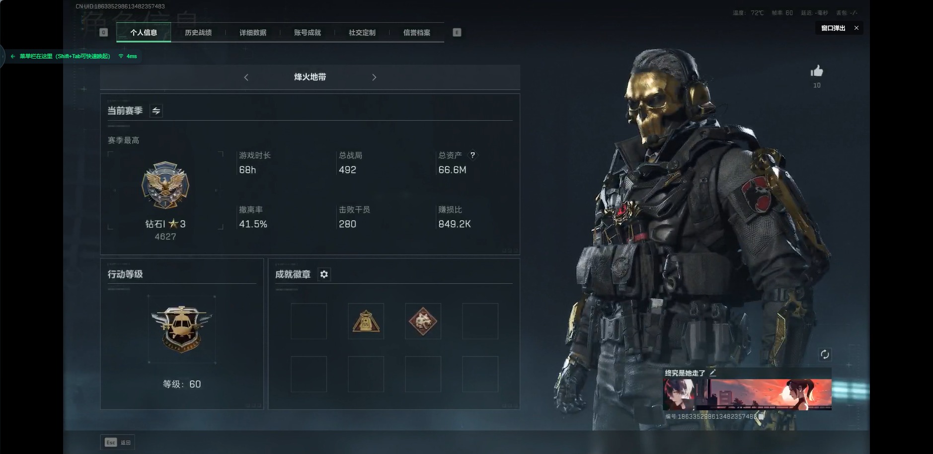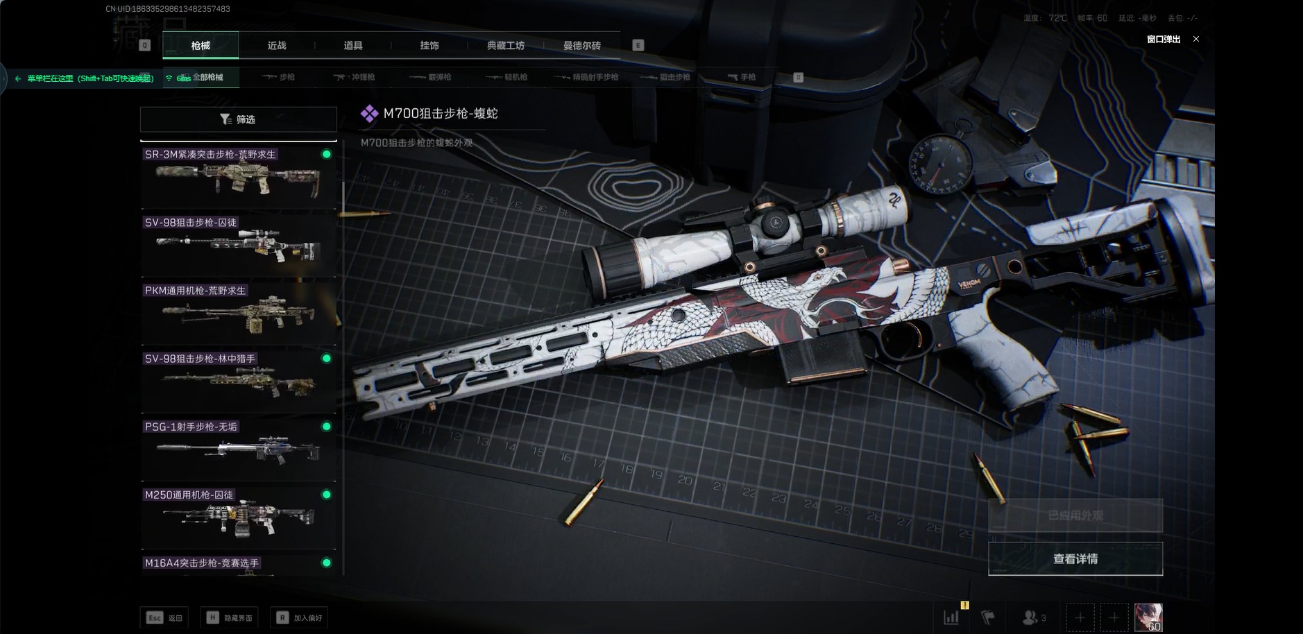 [12032246]总资产:66.6M 1近战传说 10传说枪械 哈夫币:1.310K 可二次 可修改实名 优质装备:近战-黑海,K416突击步枪-命运(典藏) 烽火地带段位:钻石 全面战场段位:上等兵 传说武器皮肤:SR-25射手步枪-水墨云图,复合弓-黑-天际线,725双管霰弹枪-送葬人-无题密令,CAR-15突击步枪-阿米娅,AK-12突击步枪-夜鹰,M4A1突击步枪-蚀金玫瑰,MP5冲锋枪-黑海,QJB201轻机枪-黑海 史诗武器皮肤:勇士冲锋枪-私人定制(典藏),SR-3M紧凑突击步枪-英雄,M700狙击步枪-蝮蛇,SG552突击步枪-尖端治疗,M1014霰弹枪-林中猎手,PKM通用机枪-守夜人,AS Val突击步枪-尖端治疗,M700狙击步枪-守夜人,Ash-12战斗步枪-守夜人,SR-25射手步枪-尖端治疗,MP5冲锋枪-深海恐惧,勇士冲锋枪-深海恐惧,AKM突击步枪-林中猎手,M16A4突击步枪-竞赛选手,M250通用机枪-囚徒,SV-98狙击步枪-林中猎手,PTR-32突击步枪-英雄,SV-98狙击步枪-囚徒,SVD狙击步枪-暗夜猎手,PSG-1射手步枪-无垢,SVD狙击步枪-荒野求生,SR-3M紧凑突击步枪-荒野求生,PKM通用机枪-荒野求生