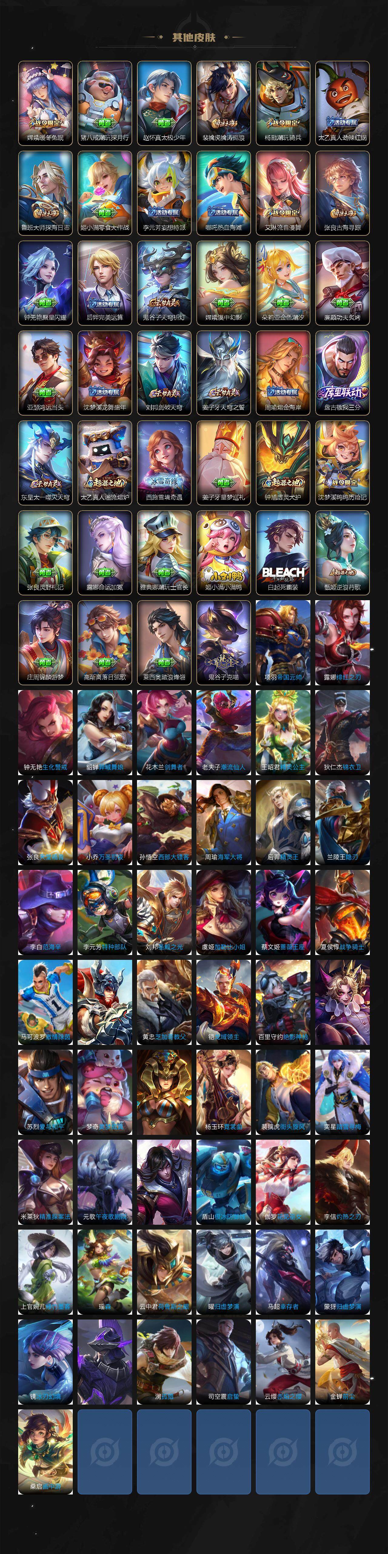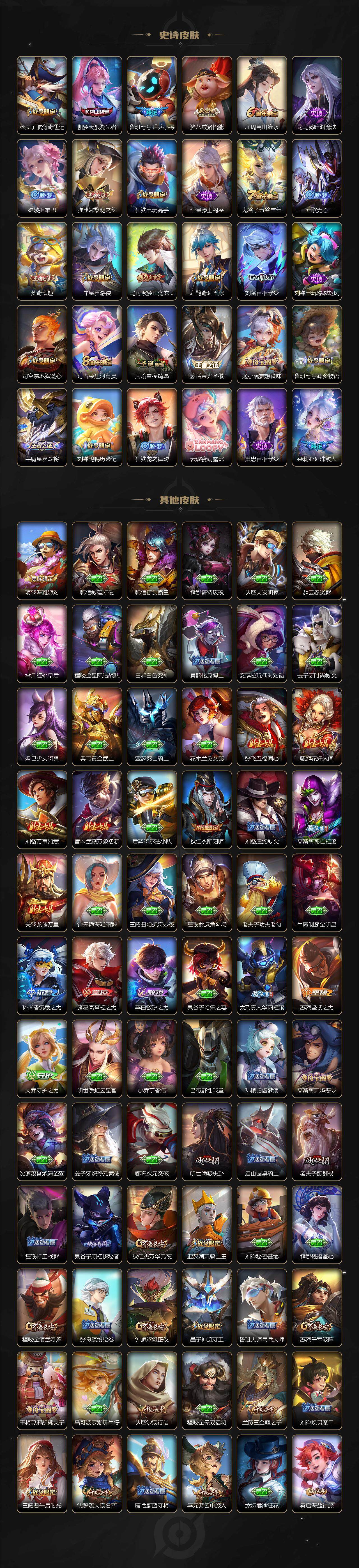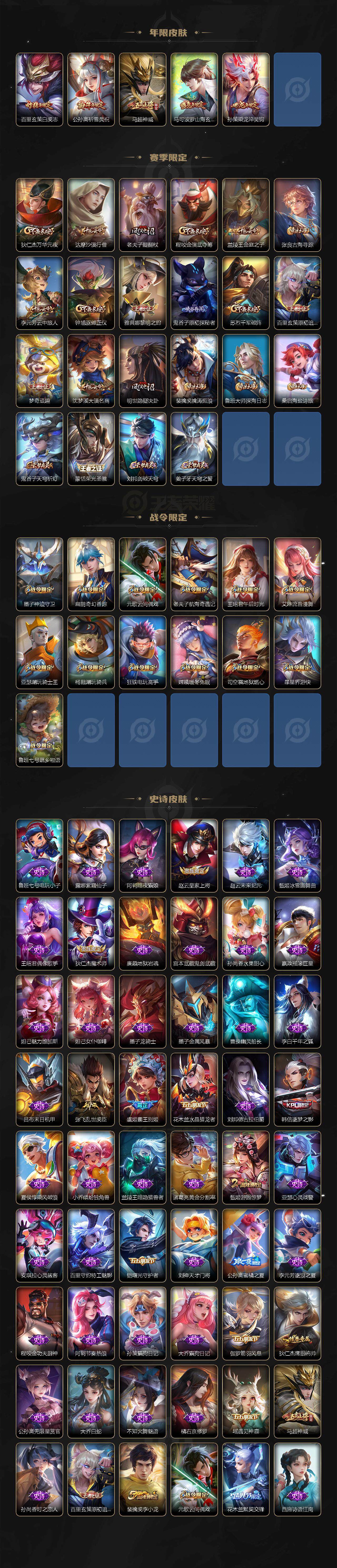 【限定皮肤】:姜子牙天穹之誓,狄仁杰阴阳师,赵云皇家上将,墨子神迹守卫,鲁班七号乒乒小将,庄周高山流水,高渐离死亡摇滚,高渐离玩趣恶龙,扁鹊奇幻香踪,元歌云间偶戏,元歌无心,甄姬游园惊梦,马可波罗山海玄木吟,狄仁杰魔术师,狄仁杰万华元夜,达摩沙漠行僧,项羽海滩派对,老夫子醍醐杖,老夫子航海奇遇记,程咬金演武夺筹,韩信逐梦之影,王昭君午后时光,兰陵王金庭之子,花木兰默契交锋,亚瑟潮玩骑士王,刘备百相守梦,李元芳云中旅人,虞姬霸王别姬,虞姬启明星使,钟馗驱傩正仪,杨戬潮玩骑兵,干将莫邪胡桃夹子,雅典娜黎明之约,太乙真人华丽摇滚,鬼谷子原初探秘者,鬼谷子五谷丰年,苏烈千军破阵,百里玄策白虎志,百里玄策原初追逐者,梦奇顽趣,公孙离蜜橘之夏,公孙离祈雪灵祝,沈梦溪大漠名商,明世隐疑决卦,裴擒虎李小龙,裴擒虎擒涛扼浪,狂铁电玩高手,伽罗天狼溯光者,猪八戒猪悟能,嫦娥拒霜思,嫦娥暖冬兔眠,鲁班大师探海日志,桑启海盐诗旅,暃星界游侠,艾琳流音漫舞,司空震地狱燃心,阿古朵江河有灵,张良古海寻踪,蒙恬荣光圣徽,鬼谷子天穹祈灯,姬小满妄想食味,孙策乘龙淬吴钩,沈梦溪龙舞盛年,鲁班七号蔬乡物语,刘邦剑破天穹,周瑜熔金海岸