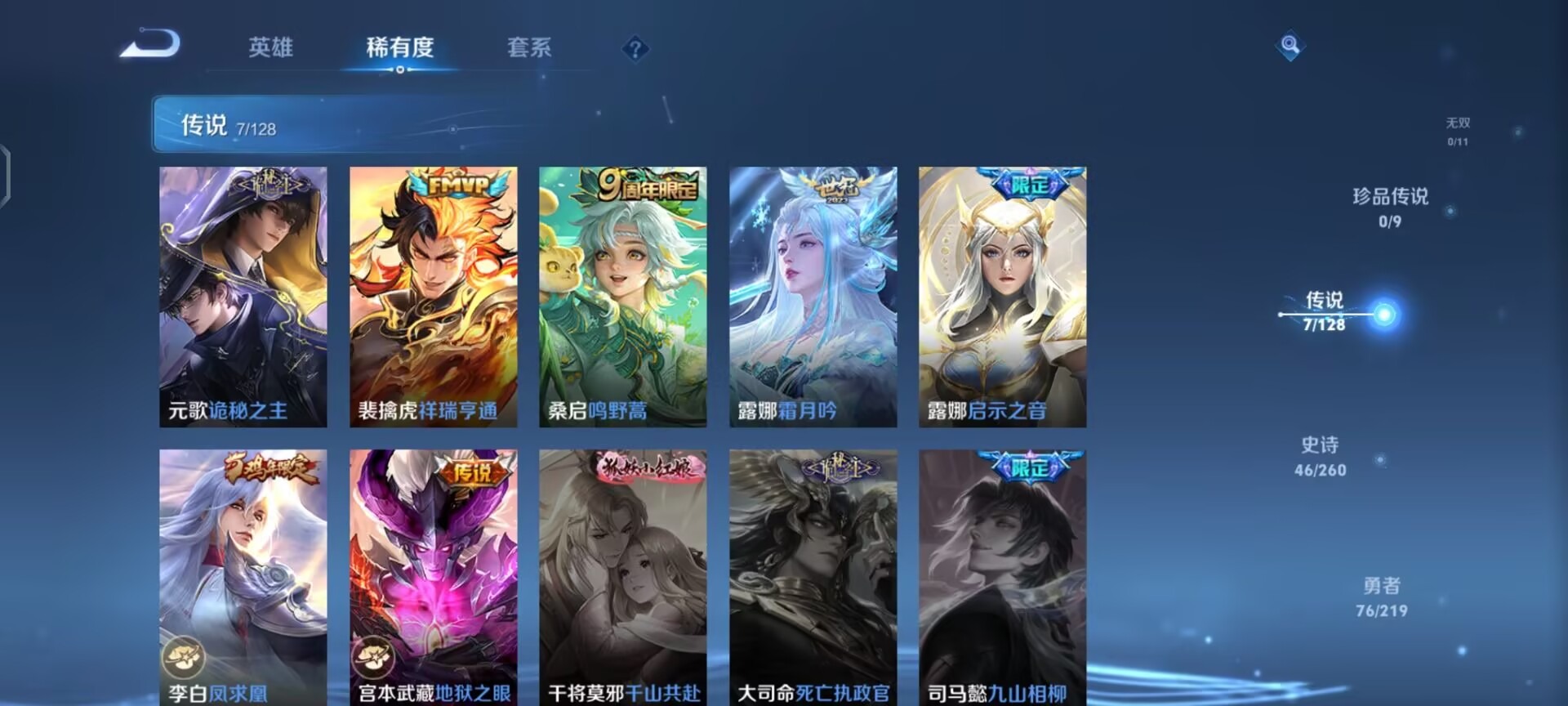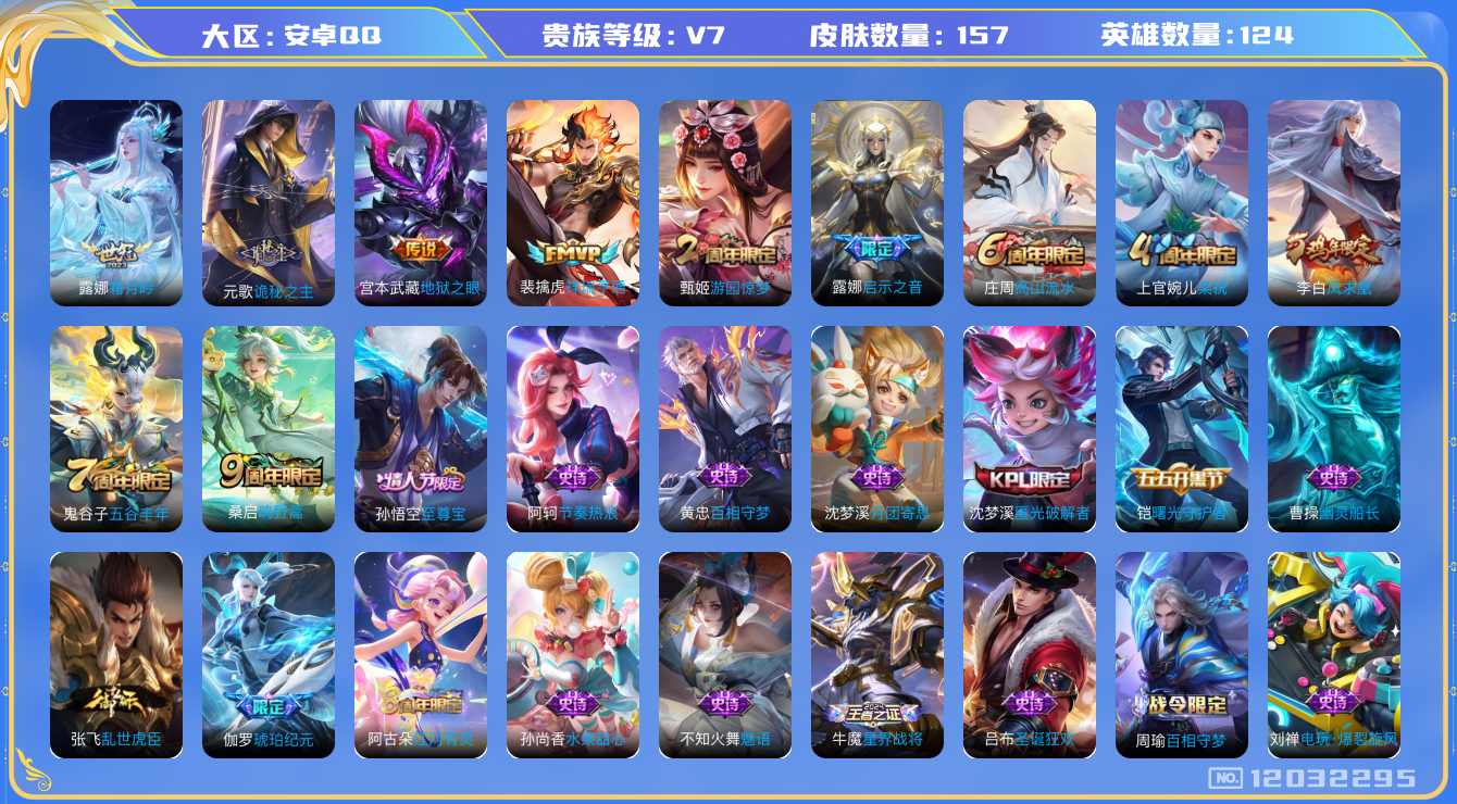 [12032295]V7 7传说 124英雄 157皮肤 可修改实名 优质装备:地狱之眼,霜月吟,诡秘之主,涂山容容 传说皮:祥瑞亨通 珍宝阁皮:蔷薇恋人 限定皮:鸣野蒿,至尊宝,凤求凰(白切鸡),高山流水,五谷丰年,游园惊梦,梁祝,启示之音 史诗皮:赞萌露比,星界战将,龙之律动,百相守梦-周瑜,东方月初,琥珀纪元伽罗,百相守梦-黄忠,千年之狐,江河有灵,魅语,蒙恬荣光圣徽,匿光破解者,冰冠公主,电玩·爆裂旋风,龙骑士(小龙虾),乱世虎臣,节奏热浪,女仆咖啡,水果甜心,绅士熊喵,天才门将,心灵骇客,幽灵船长,鬼剑武藏,舞动绿茵,月团寄思,水晶猎龙者,曙光守护者,金属风暴,原初追逐者,圣诞狂欢,圣诞恋歌,鹰眼统帅,魅力维加斯