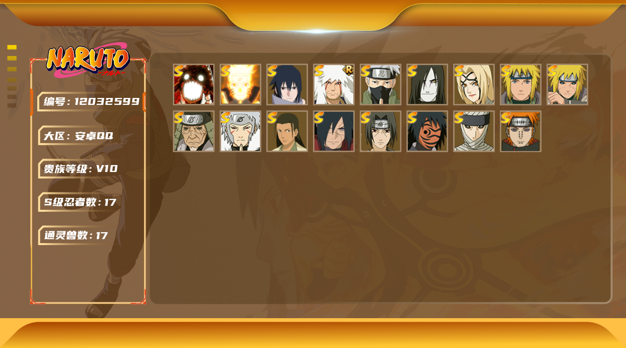 [12032599]V10 17S忍 40A忍 17通灵 929W战力 可二次 可修改实名 优质装备:纲手「百豪」,无「二代目土影」,波风水门「秽土转生」,猿飞日斩「秽土转生」,千手扉间,漩涡鸣人 「九喇嘛连结」,神秘面具男 「红夜之刃」,宇智波佐助「永恒万花筒」,千手柱间·木叶创立,宇智波斑「秽土转生·解」,旗木卡卡西「须佐能乎」,漩涡鸣人 「暴怒·第六尾」 S级忍者:自来也 「舞之豪杰」,宇智波鼬 「须佐能乎」,佩恩「天道」,波风水门,大蛇丸