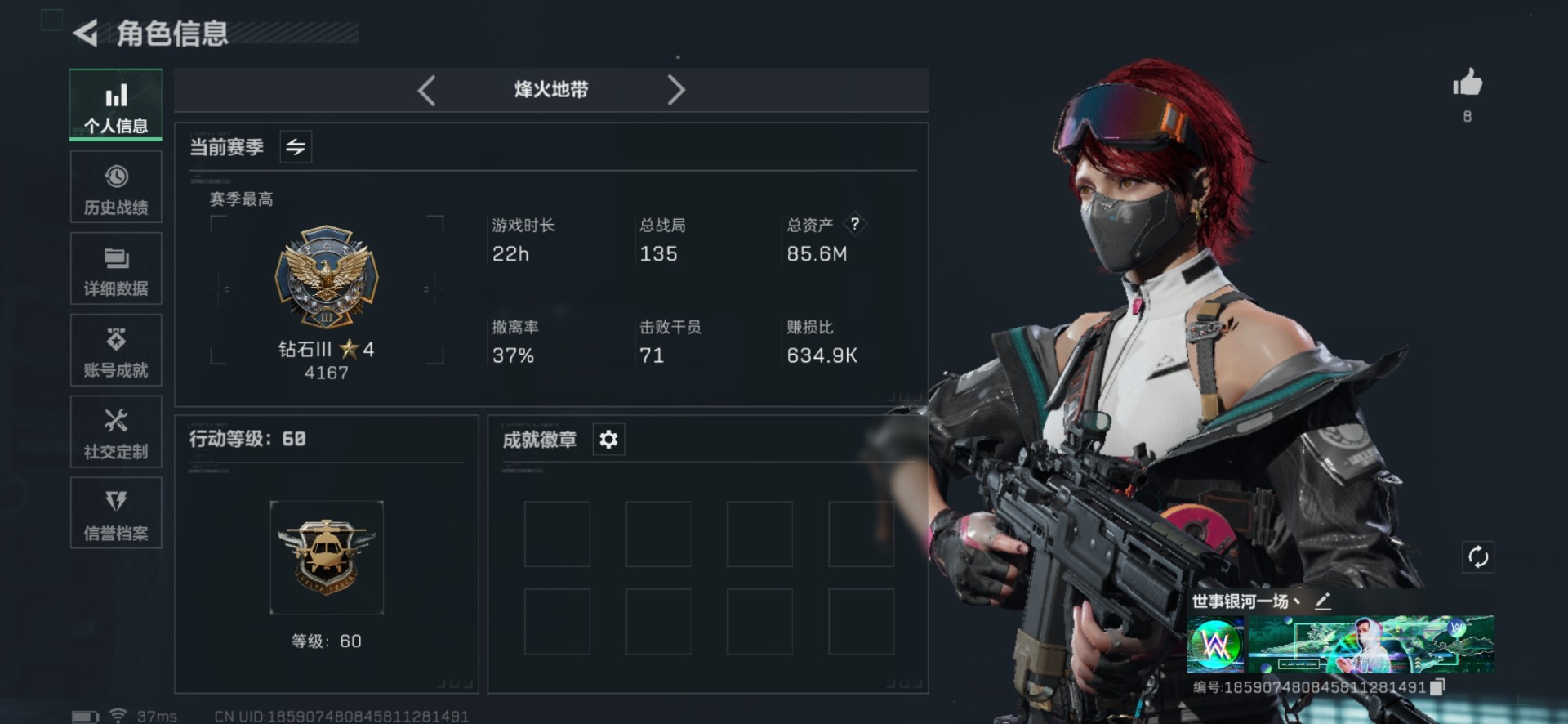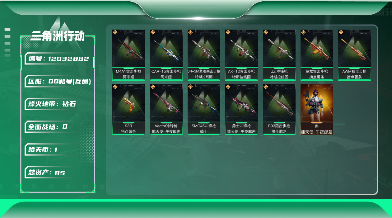 [12032882]总资产:85.6M 1干员外观 12传说枪械 哈夫币:1.981K 可二次 可修改实名 烽火地带段位:钻石 全面战场段位:上等兵 传说武器皮肤:AK-12突击步枪-特斯拉线圈,SR-3M紧凑突击步枪-特斯拉线圈,UZI冲锋枪-特斯拉线圈,勇士冲锋枪-能天使-午夜邮差,Vector冲锋枪-能天使-午夜邮差,腾龙突击步枪-捞点薯条,93R-捞点薯条,AWM狙击步枪-捞点薯条,SMG45冲锋枪-骑士,M4A1突击步枪-阿米娅,CAR-15突击步枪-阿米娅,R93狙击步枪-维什戴尔 干员外观:蛊-能天使·午夜邮差