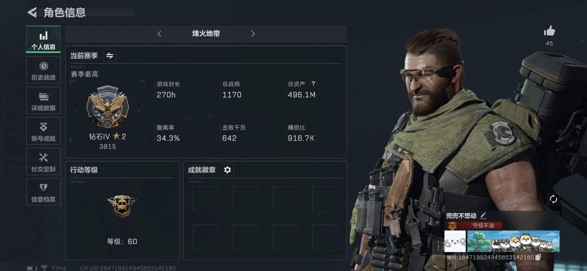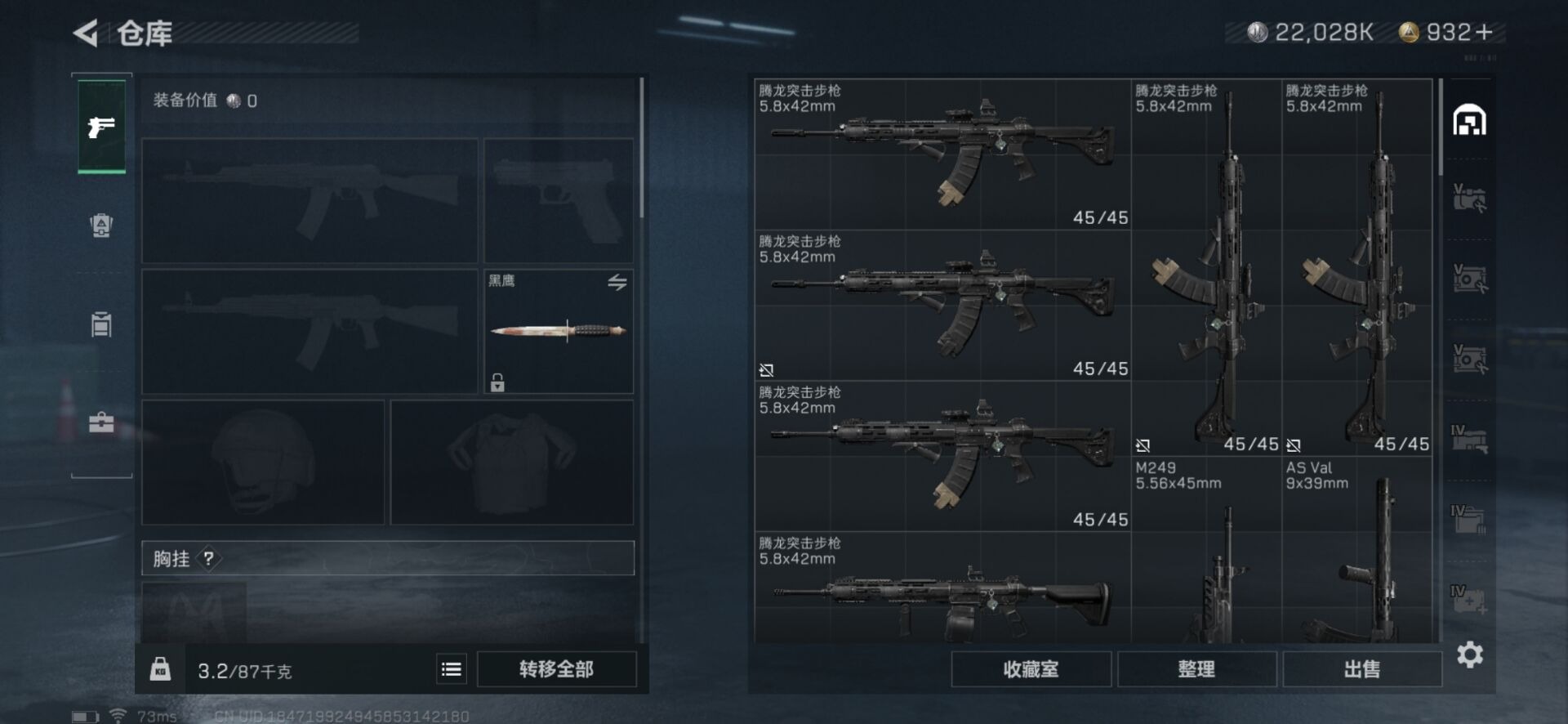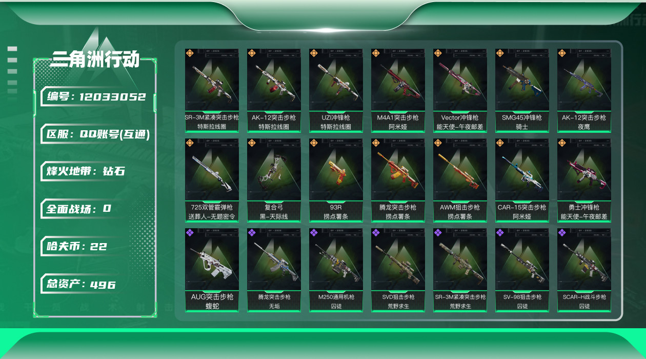[12033052]总资产:496.1M 14传说枪械 哈夫币:22.028K 可二次 可修改实名 优质装备:顶级安全箱(3x3) 烽火地带段位:钻石 全面战场段位:校官 传说武器皮肤:SMG45冲锋枪-骑士,UZI冲锋枪-特斯拉线圈,AWM狙击步枪-捞点薯条,腾龙突击步枪-捞点薯条,93R-捞点薯条,AK-12突击步枪-特斯拉线圈,SR-3M紧凑突击步枪-特斯拉线圈,勇士冲锋枪-能天使-午夜邮差,Vector冲锋枪-能天使-午夜邮差,复合弓-黑-天际线,725双管霰弹枪-送葬人-无题密令,M4A1突击步枪-阿米娅,CAR-15突击步枪-阿米娅,AK-12突击步枪-夜鹰 史诗武器皮肤:AUG突击步枪-蝮蛇,Ash-12战斗步枪-守夜人,M16A4突击步枪-竞赛选手,PKM通用机枪-守夜人,M700狙击步枪-守夜人,SG552突击步枪-尖端治疗,SR-25射手步枪-尖端治疗,M1014霰弹枪-林中猎手,SG552突击步枪-深海恐惧,AKM突击步枪-林中猎手,SVD狙击步枪-暗夜猎手,SV-98狙击步枪-林中猎手,PTR-32突击步枪-英雄,PKM通用机枪-荒野求生,M250通用机枪-囚徒,SV-98狙击步枪-囚徒,SCAR-H战斗步枪-囚徒,腾龙突击步枪-无垢,PSG-1射手步枪-无垢,SVD狙击步枪-荒野求生,SR-3M紧凑突击步枪-荒野求生,QBZ95-1突击步枪-曙光,S12K霰弹枪-曙光,M700狙击步枪-竞技风