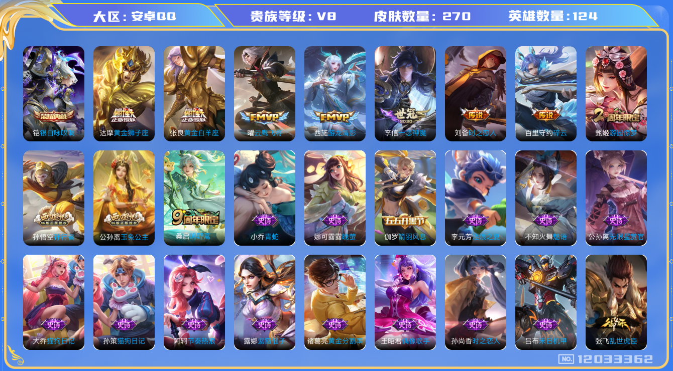 [12033362]【商品标题】:安卓Q-V8-最强王者段位-124英雄-270皮肤-1典藏-0珍品无双-0无双-0珍品传说-9传说-77史诗