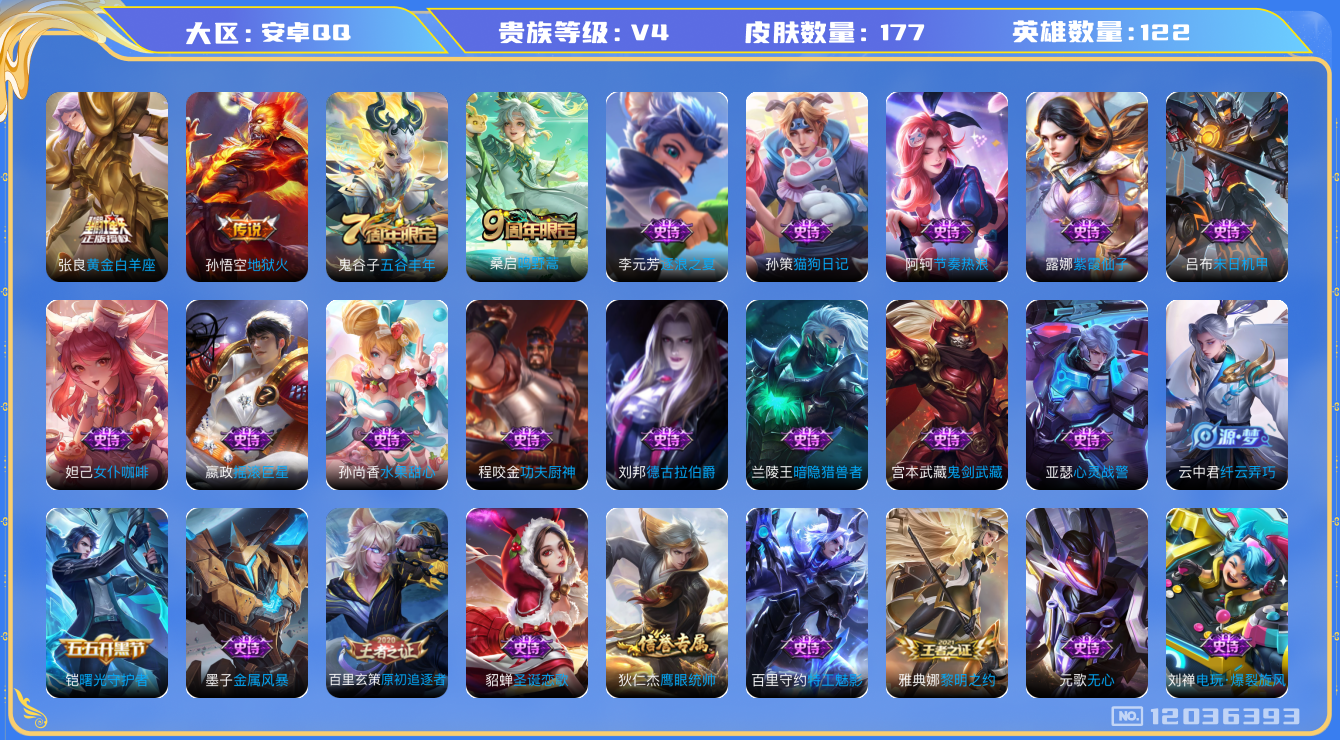 [12036393]【商品标题】:安卓Q-V3-最强王者段位-122英雄-177皮肤-0典藏-0珍品无双-0无双-0珍品传说-3传说-35史诗