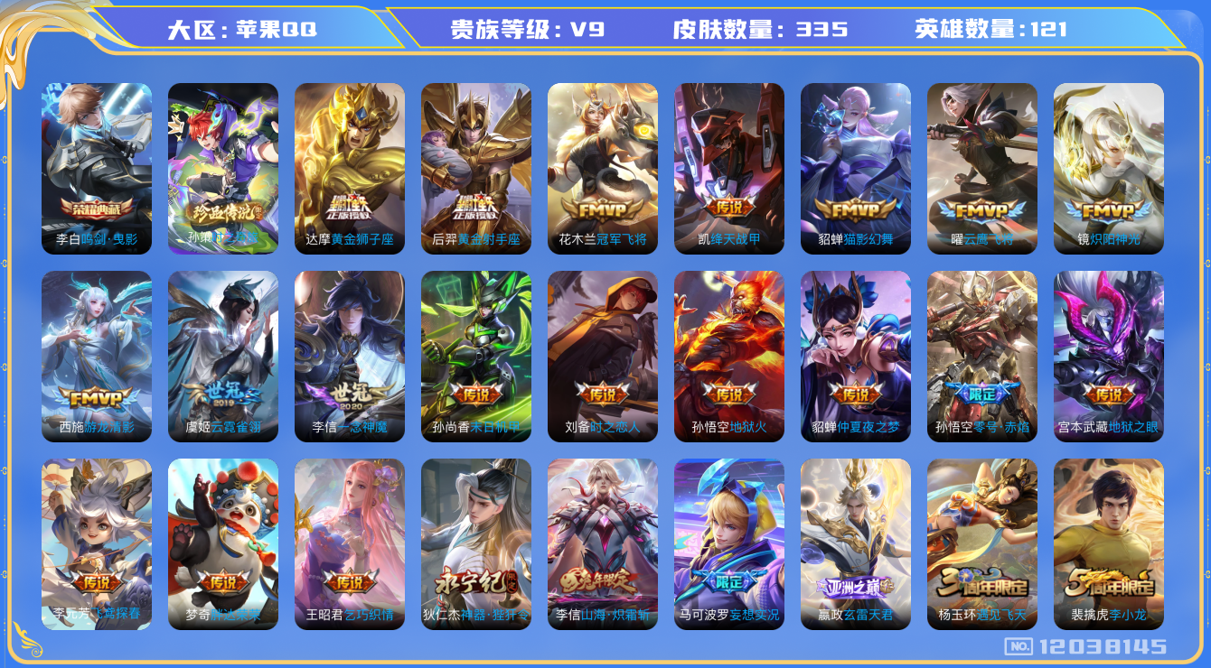 [12038145]【商品标题】:苹果Q-V9-荣耀黄金II段位-121英雄-335皮肤-1典藏-0珍品无双-0无双-1珍品传说-34传说-101史诗