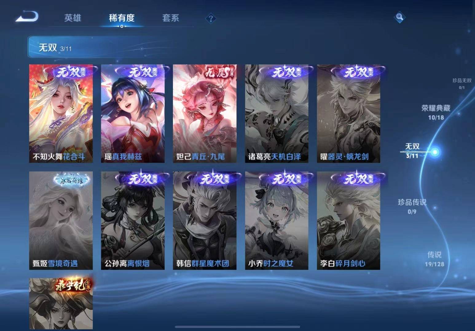 - PX_2086721-60 安卓QQ/至尊星耀/271皮肤/123英雄/1典藏/0珍品无双/0无双/2珍品传说/10传说/75史诗/9稀有英雄 【2 珍品传说】怪盗基德 马可波罗,江户川柯南 鲁班七号, 【1 典藏皮肤】幻阙歌 貂蝉, 【10 传说皮肤】逐花归海 澜,游龙清影 西施,炽阳神光 镜,黄金射手座 后羿,久胜战神 干将莫邪,音你心动 小乔,冠军飞将 花木兰,幻光神枪 云缨,愿照·千秋盛