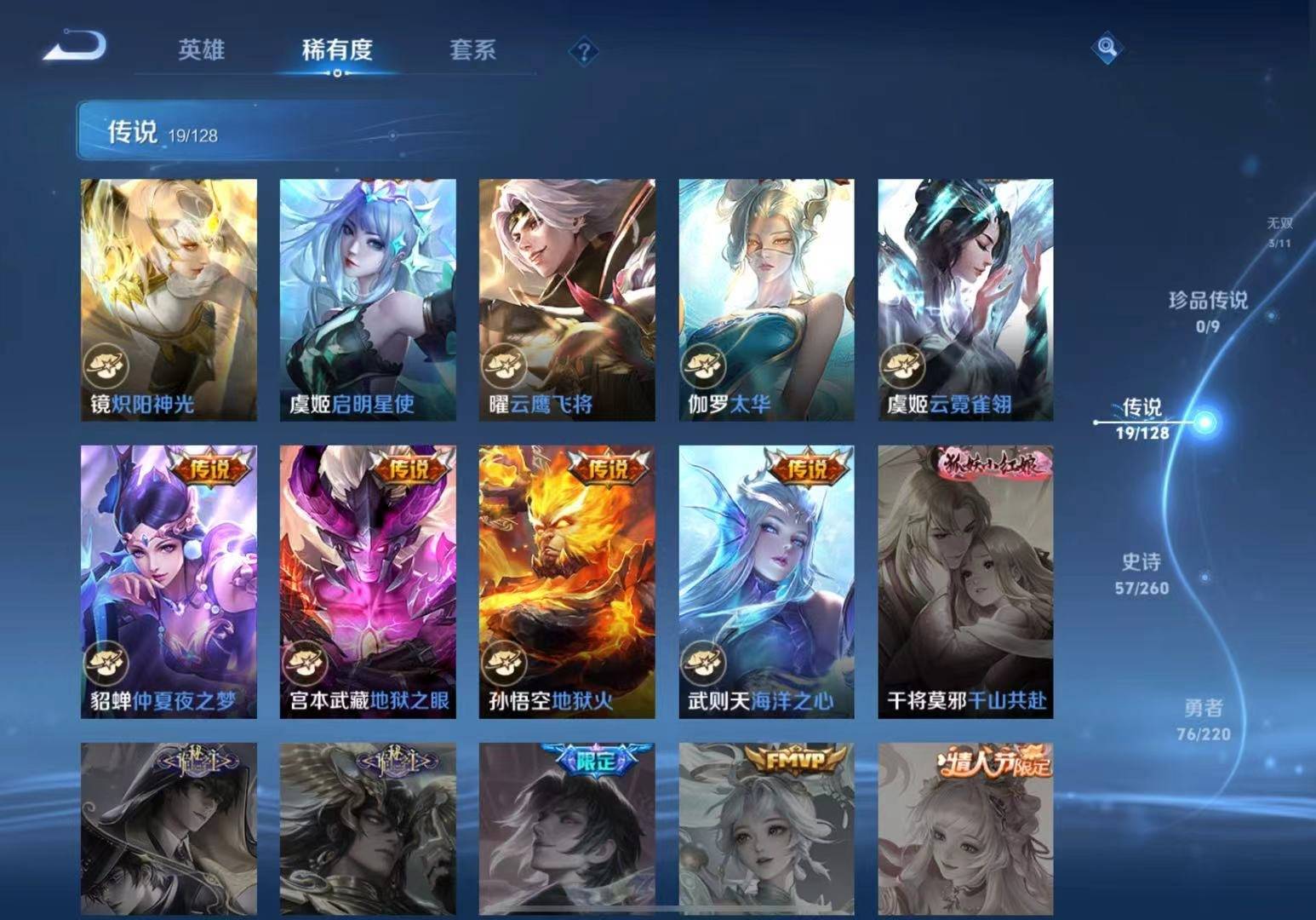 - PX_2082080-贵族等级: V7 英雄数: 122 皮肤数: 211 荣耀水晶: 全息碎影,弑枪猎影 传说皮: 黄金狮子座,云鹰飞将,时之恋人-刘备,澜逐花归海,乘龙·问璇玑,乘龙·淬吴钩,落雪白狼 限定皮: 李小龙,梁祝,大圣娶亲,寅虎·赤拳,五谷丰年,山海·玄木吟,齐天大圣,鸣野蒿,逐霄战戟