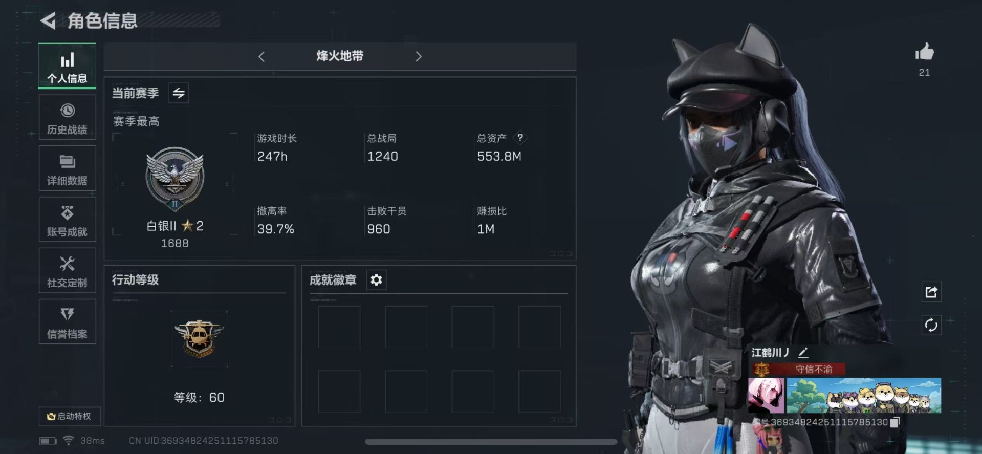 [12039388]总资产:553.8M 1近战传说 16传说枪械 哈夫币:91.426K 可二次 可修改实名 优质装备:近战-北极星,SCAR-H战斗步枪-电玩高手,顶级安全箱(3x3) 烽火地带段位:白银 全面战场段位:尉官 传说武器皮肤:UZI冲锋枪-特斯拉线圈,AWM狙击步枪-捞点薯条,腾龙突击步枪-捞点薯条,93R-捞点薯条,AK-12突击步枪-特斯拉线圈,SR-3M紧凑突击步枪-特斯拉线圈,勇士冲锋枪-能天使-午夜邮差,Vector冲锋枪-能天使-午夜邮差,K437突击步枪-北极星,QCQ171冲锋枪-北极星,725双管霰弹枪-送葬人-无题密令,M4A1突击步枪-阿米娅,CAR-15突击步枪-阿米娅,AK-12突击步枪-夜鹰