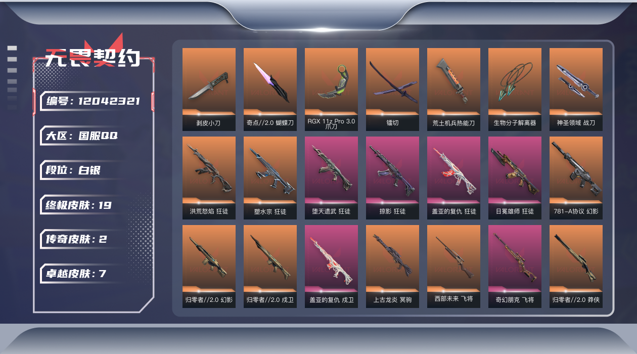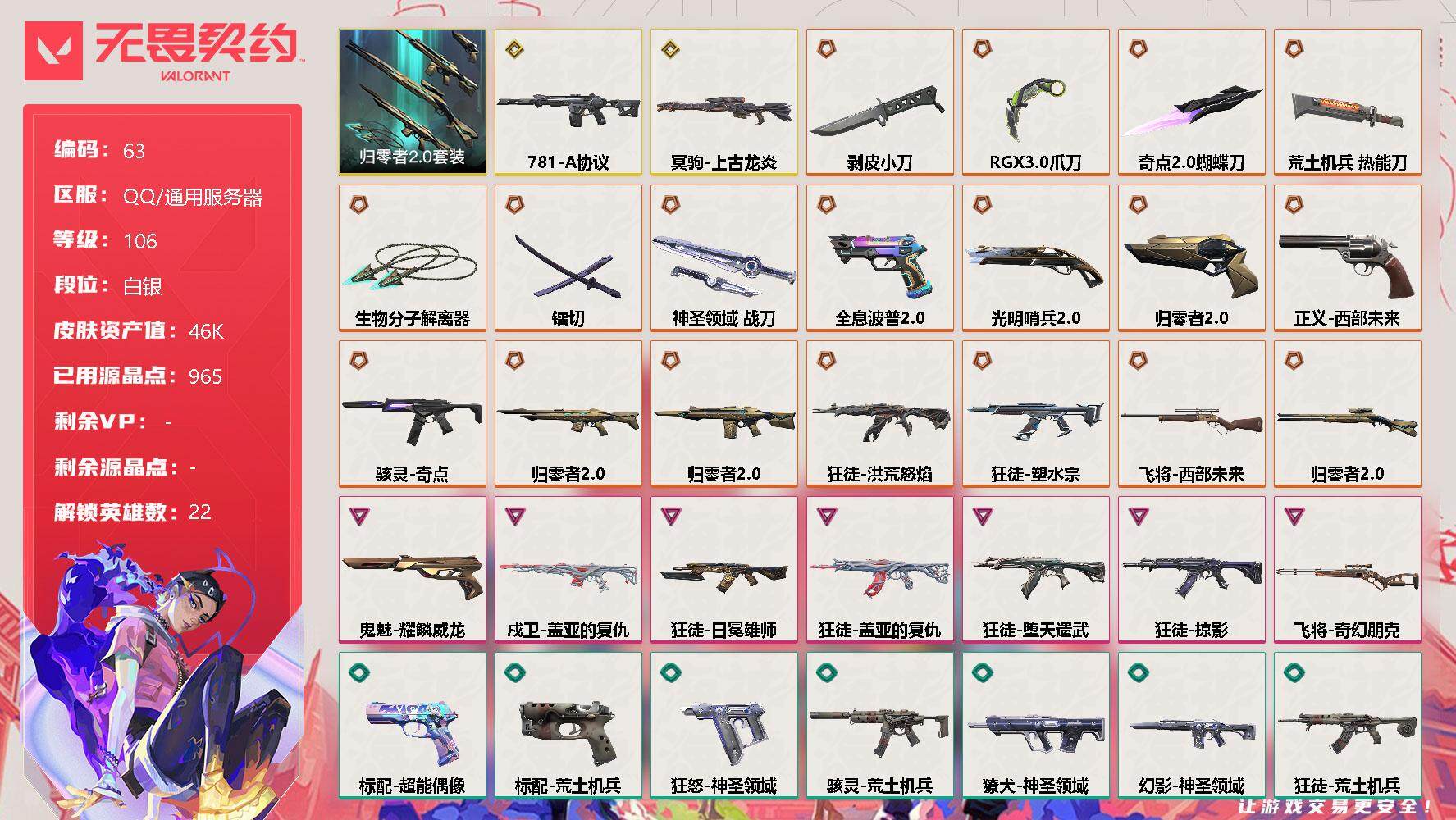 [12042321]【套装】:归零者//2.0套装 【英雄】:幻棱,炼狱,暮蝶,钛狐,壹决,铁臂,捷风,雷兹,幽影,不死鸟,贤者,猎枭,零,芮娜,尚勃勒,霓虹,斯凯,夜露,星礈,K/O,盖可,钢锁 【近战 武器】:近战武器-剥皮小刀,近战武器-奇点//2.0 蝴蝶刀,近战武器-RGX 11z Pro//3.0 爪刀,近战武器-镭切,近战武器-荒土机兵 热能刀,近战武器-生物分子解离器,近战武器-神圣领域 战刀 【狂徒】:狂徒-洪荒怒焰,狂徒-塑水宗,狂徒-堕天遗武,狂徒-掠影,狂徒-盖亚的复仇,狂徒-日冕雄师,狂徒-荒土机兵 【幻影】:幻影-781-A协议,幻影-归零者//2.0,幻影-神圣领域,幻影-纳米打击 【戍卫】:戍卫-归零者//2.0,戍卫-盖亚的复仇,戍卫-逆冲蛮牛,戍卫-月球哨兵 【獠犬】:獠犬-神圣领域,獠犬-逆冲蛮牛 【冥驹】:冥驹-上古龙炎,冥驹-荒土机兵,冥驹-星云暗涌 【飞将】:飞将-西部未来,飞将-奇幻朋克,飞将-末日之翼 【莽侠】:莽侠-归零者//2.0,莽侠-月球哨兵 【战神】:战神-神圣领域 【奥丁】:奥丁-纳米打击 【判官】:判官-诡秘蛇影,判官-纳米打击x 【雄鹿】:雄鹿-逆冲蛮牛,雄鹿-月球哨兵 【骇灵】:骇灵-奇点,骇灵-荒土机兵,骇灵-星云暗涌 【蜂刺】:蜂刺-星云暗涌,蜂刺-折光棱晶 【标配】:标配-全息波普//2.0,标配-超能偶像,标配-荒土机兵,标配-折光棱晶 【正义】:正义-归零者//2.0,正义-西部未来,正义-传奇制造,正义-纳米打击,正义-月球哨兵 【鬼魅】:鬼魅-耀鳞威龙,鬼魅-星云暗涌 【狂怒】:狂怒-神圣领域,狂怒-逆冲蛮牛 【短炮】:短炮-光明哨兵//2.0,短炮-末日之翼 【卡面】:终章:激斗汉堡 卡面,进入射程 卡面,分崩离析 卡面,纳米打击 卡面,抑制技术 卡面,激斗汉堡 卡面,瓦娃脸雪糕 P2 卡面,从黄昏到黎明 卡面,荒土机兵 卡面,银弹猎手 卡面,逆冲蛮牛 卡面,《双城之战》拥抱 卡面,精灵大战 卡面,欢迎来到底城 卡面,南瓜盛典 卡面,热舞环节 卡面,正义的化身 卡面,终章:生意人麦宝 卡面,铁之华 卡面,时间到 卡面,最高舞台 卡面,声感陷阱设计图 卡面,梦幻奶茶 卡面,源能反应 卡面,零点嗅探设计图 卡面,沙雕爆能器 卡面,无畏契约GO!第一卷:芮娜 卡面,清除名单 卡面,无畏契约GO!第一卷:零 卡