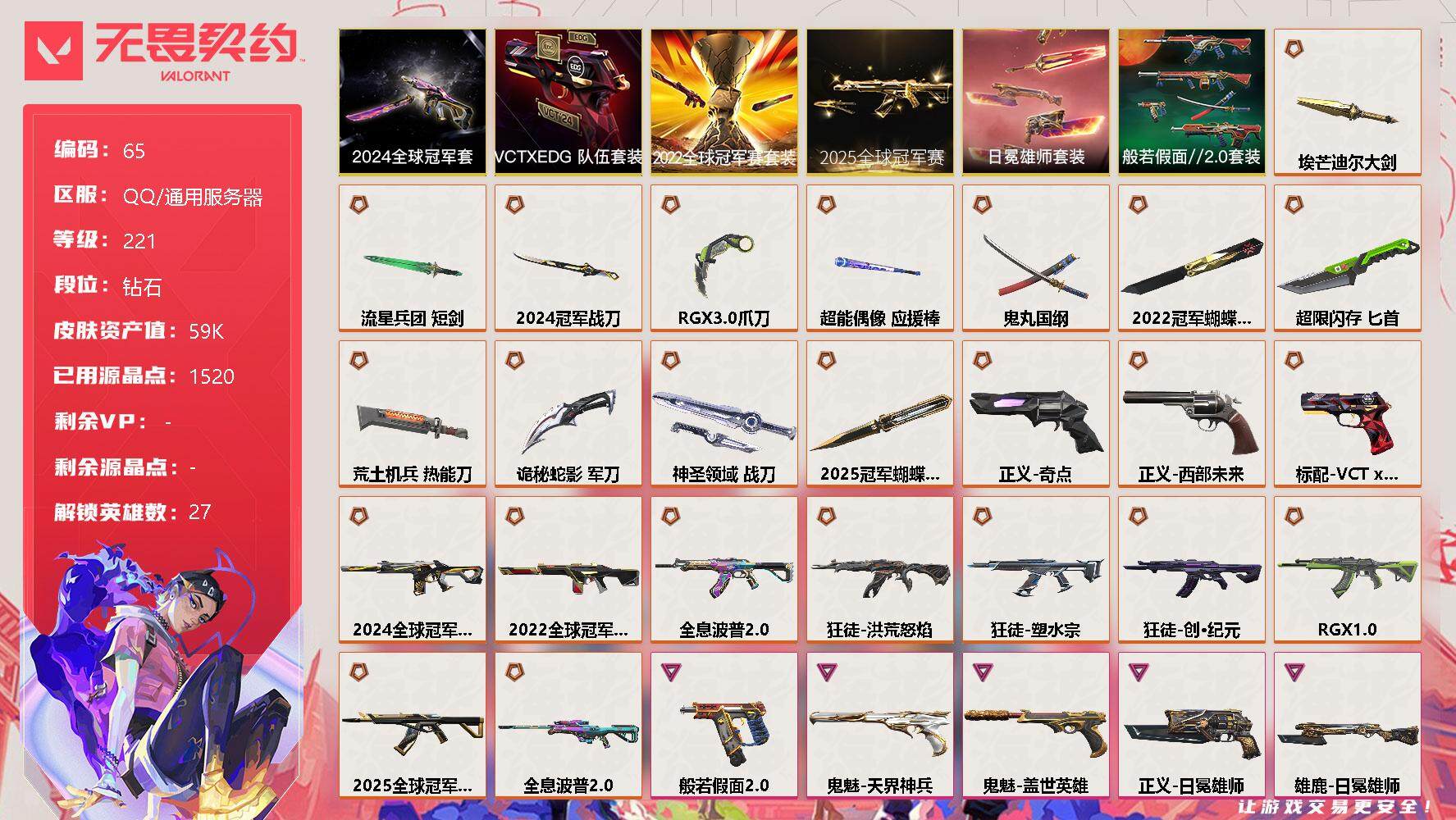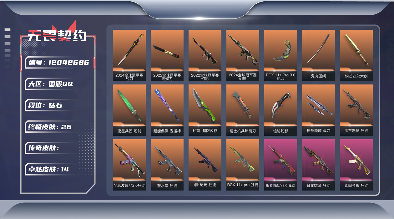 [12042686]【套装】:2025全球冠军赛套装,2024全球冠军赛套装,2022全球冠军赛套装,VCTxEDG 队伍套装,般若假面//2.0套装,日冕雄师套装 【英雄】:幻棱,炼狱,维斯,暮蝶,钛狐,壹决,铁臂,捷风,雷兹,幽影,不死鸟,贤者,猎枭,蝰蛇,零,芮娜,奇乐,尚勃勒,霓虹,斯凯,夜露,星礈,K/O,海神,盖可,黑梦,钢锁 【近战 武器】:近战武器-2025全球冠军赛 蝴蝶刀,近战武器-2024全球冠军赛 战刀,近战武器-2022全球冠军赛 蝴蝶刀,近战武器-RGX 11z Pro//3.0 爪刀,近战武器-鬼丸国纲,近战武器-埃芒迪尔大剑,近战武器-流星兵团 短剑,近战武器-超能偶像 应援棒,近战武器-超限闪存 匕首,近战武器-荒土机兵 热能刀,近战武器-诡秘蛇影 军刀,近战武器-神圣领域 战刀 【狂徒】:狂徒-2025全球冠军赛,狂徒-洪荒怒焰,狂徒-全息波普//2.0,狂徒-塑水宗,狂徒-创·纪元,狂徒-RGX 11z Pro,狂徒-般若假面//2.0,狂徒-日冕雄师,狂徒-紫阙金琅,狂徒-超能偶像,狂徒-荒土机兵,狂徒-流星兵团,狂徒-诡秘蛇影 【幻影】:幻影-2022全球冠军赛,幻影-2024全球冠军赛,幻影-侦察力量,幻影-超限闪存,幻影-神圣领域,幻影-聚合之力,幻影-纳米打击,幻影-末日之翼 【戍卫】:戍卫-天界神兵,戍卫-超能偶像,戍卫-浮光跃金,戍卫-逆冲蛮牛,戍卫-战术熊与伙伴们,戍卫-月球哨兵,戍卫-折光棱晶 【獠犬】:獠犬-般若假面//2.0,獠犬-日冕雄师,獠犬-神圣领域,獠犬-采蜜小蜂队,獠犬-模拟赫兹,獠犬-逆冲蛮牛 【冥驹】:冥驹-全息波普//2.0,冥驹-荒土机兵,冥驹-模拟赫兹,冥驹-星云暗涌 【飞将】:飞将-天界神兵,飞将-聚合之力,飞将-战术熊与伙伴们,飞将-末日之翼 【莽侠】:莽侠-超限闪存,莽侠-诡秘蛇影,莽侠-纤云弄巧,莽侠-月球哨兵 【战神】:战神-般若假面//2.0,战神-神圣领域,战神-采蜜小蜂队,战神-浮光跃金 【奥丁】:奥丁-流星兵团,奥丁-纳米打击,奥丁-末日之翼 【判官】:判官-超能偶像,判官-诡秘蛇影,判官-采蜜小蜂队,判官-纳米打击x 【雄鹿】:雄鹿-日冕雄师,雄鹿-模拟赫兹,雄鹿-逆冲蛮牛,雄鹿-月球哨兵 【骇灵】:骇灵-荒土机兵,骇灵-流星兵团,骇灵-浮光跃金,骇灵-星云暗涌 【蜂刺】:蜂刺-超限闪