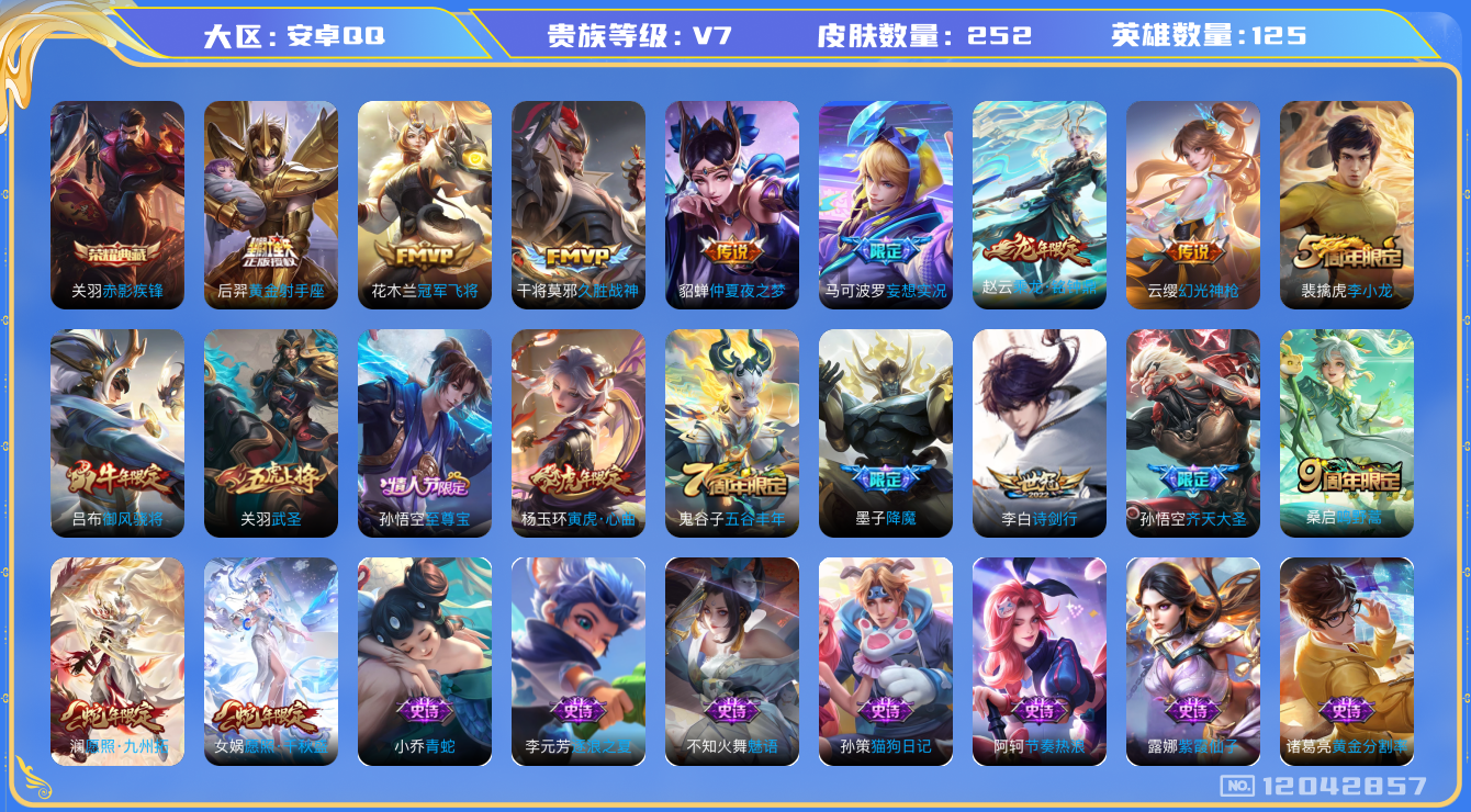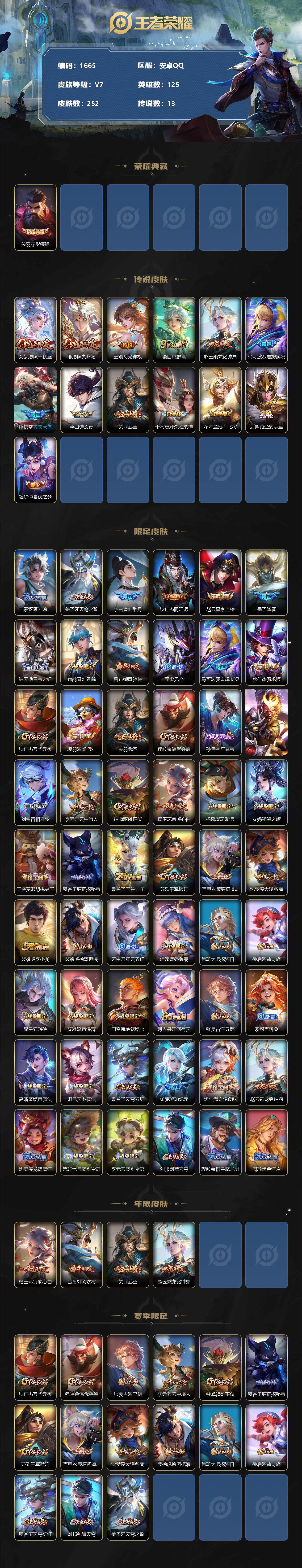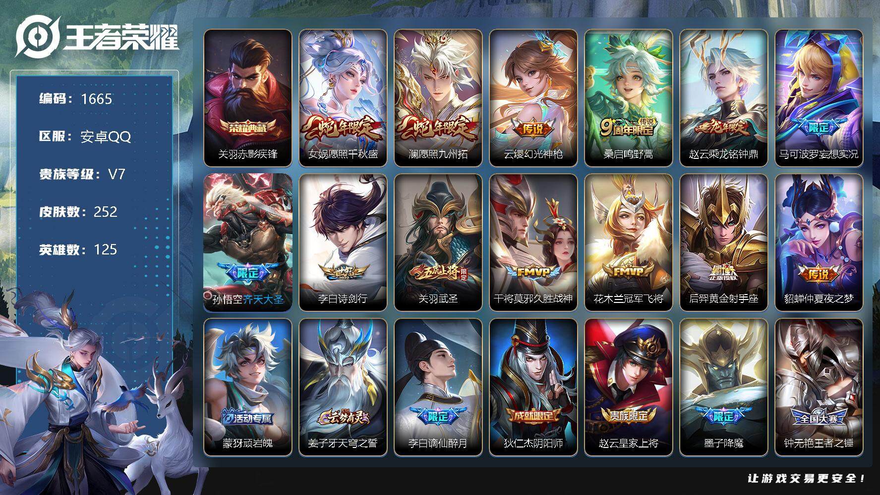 [12042857]【商品标题】:安卓Q-V7-最强王者段位-125英雄-252皮肤-1典藏-0珍品无双-0无双-0珍品传说-13传说-79史诗