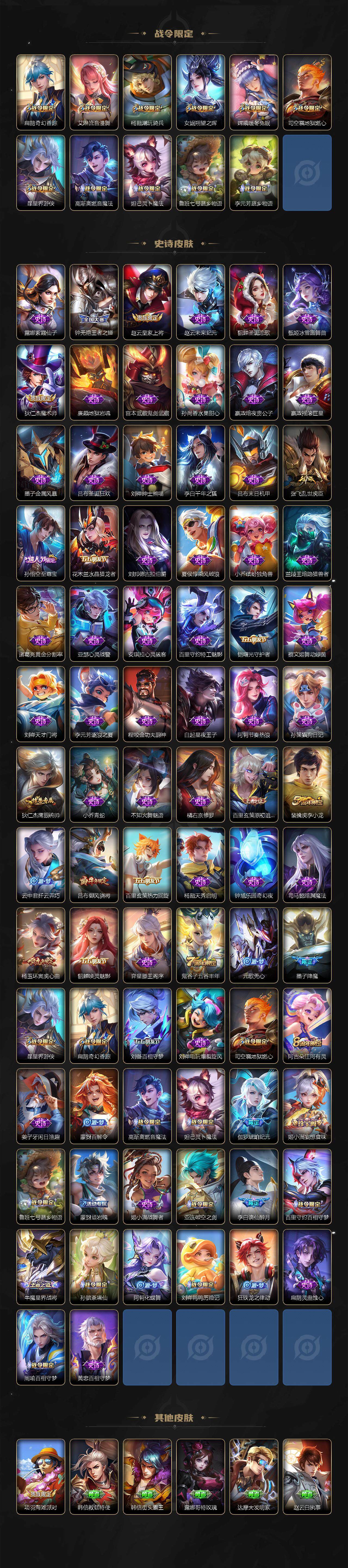 【限定皮肤】:蒙犽顽岩魄,姜子牙天穹之誓,李白谪仙醉月,狄仁杰阴阳师,赵云皇家上将,墨子降魔,钟无艳王者之锤,扁鹊奇幻香踪,吕布御风骁将,元歌无心,马可波罗妄想实况,狄仁杰魔术师,狄仁杰万华元夜,项羽海滩派对,关羽武圣,程咬金演武夺筹,孙悟空至尊宝,孙悟空齐天大圣,刘备百相守梦,李元芳云中旅人,钟馗驱傩正仪,杨玉环寅虎心曲,杨戬潮玩骑兵,女娲朔望之晖,干将莫邪胡桃夹子,鬼谷子原初探秘者,鬼谷子五谷丰年,苏烈千军破阵,百里玄策原初追逐者,沈梦溪大漠名商,裴擒虎李小龙,裴擒虎擒涛扼浪,云中君纤云弄巧,嫦娥暖冬兔眠,鲁班大师探海日志,桑启海盐诗旅,暃星界游侠,艾琳流音漫舞,司空震地狱燃心,阿古朵江河有灵,张良古海寻踪,蒙犽百解令,高渐离燃音魔法,妲己灵卜魔法,鬼谷子天穹祈灯,伽罗琥珀纪元,姬小满妄想食味,赵云乘龙铭钟鼎,沈梦溪龙舞盛年,鲁班七号蔬乡物语,李元芳蔬乡物语,刘邦剑破天穹,程咬金群星魔术团,周瑜熔金海岸