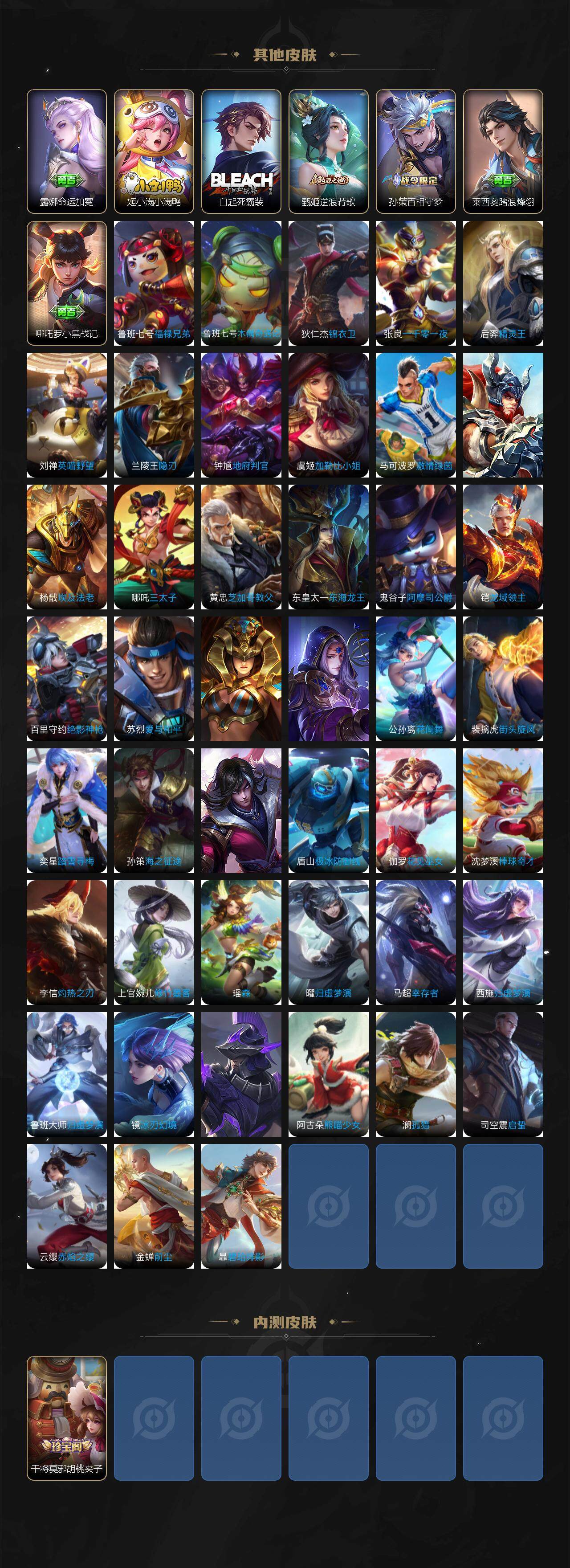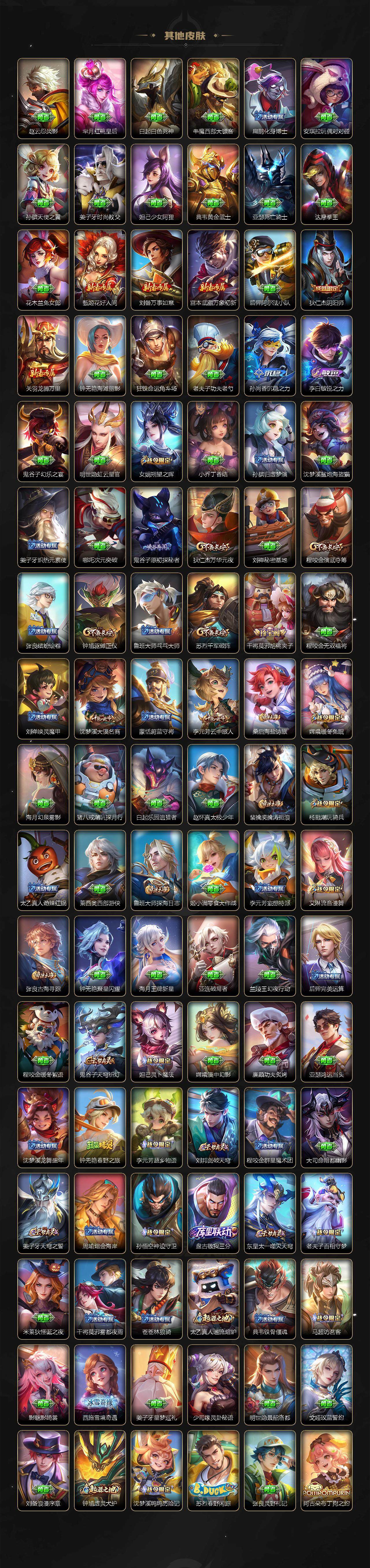 小乔青蛇,李元芳逐浪之夏,不知火舞魅语,孙策猫狗日记,阿轲节奏热浪,露娜紫霞仙子,诸葛亮黄金分割率,吕布末日机甲,橘右京修罗,嬴政摇滚巨星,刘禅绅士熊喵,刘禅天才门将,白起星夜王子,安琪拉心灵骇客,程咬金功夫厨神,刘邦德古拉伯爵,兰陵王暗隐猎兽者,宫本武藏鬼剑武藏,司马懿暗渊魔法,亚瑟心灵战警,钟馗乐园奇幻夜,杨戬天秀·启明,蔡文姬舞动绿茵,廉颇地狱岩魂,小乔缤纷独角兽,夏侯惇乘风破浪,花木兰水晶猎龙者,铠曙光守护者,百里玄策热力回旋,墨子金属风暴,百里玄策原初追逐者,吕布圣诞狂欢,貂蝉圣诞恋歌,百里守约特工魅影,嬴政暗夜贵公子,李白千年之狐,貂蝉唤灵魅影,弈星滕王阁序,刘备百相守梦,刘禅电玩·爆裂旋风,姜子牙闲日渔趣,蒙犽百解令,高渐离燃音魔法,伽罗琥珀纪元,李白谪仙醉月