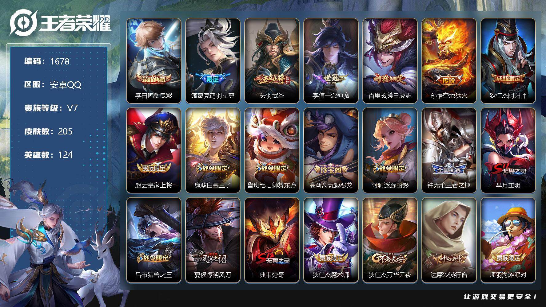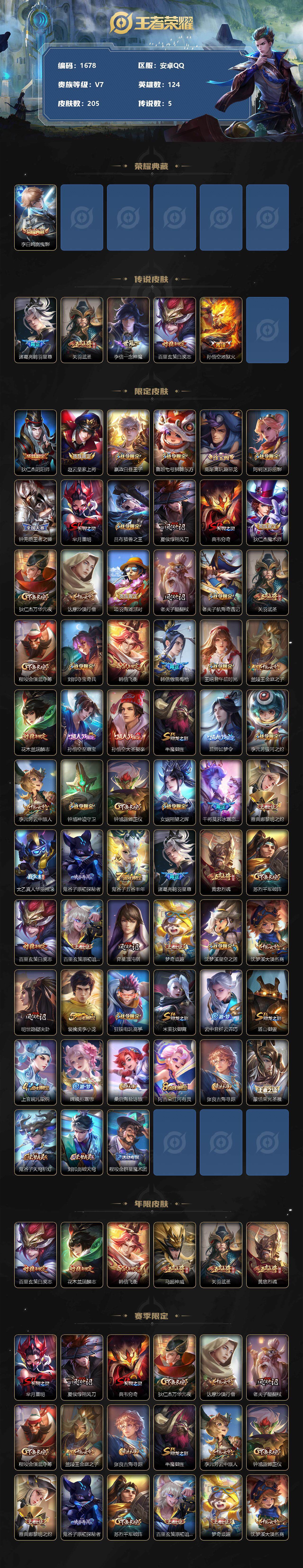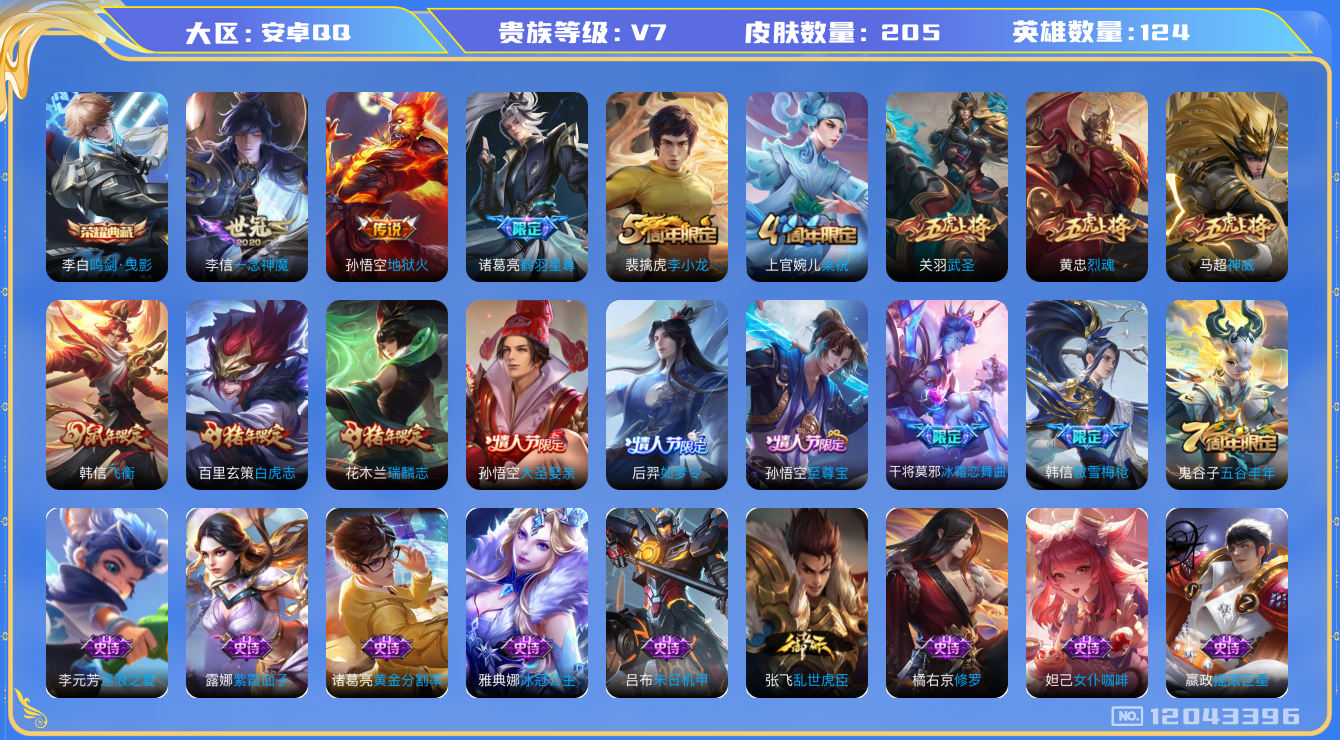 [12043396]【商品标题】:安卓Q-V5-最强王者段位-124英雄-205皮肤-1典藏-0珍品无双-0无双-0珍品传说-5传说-60史诗