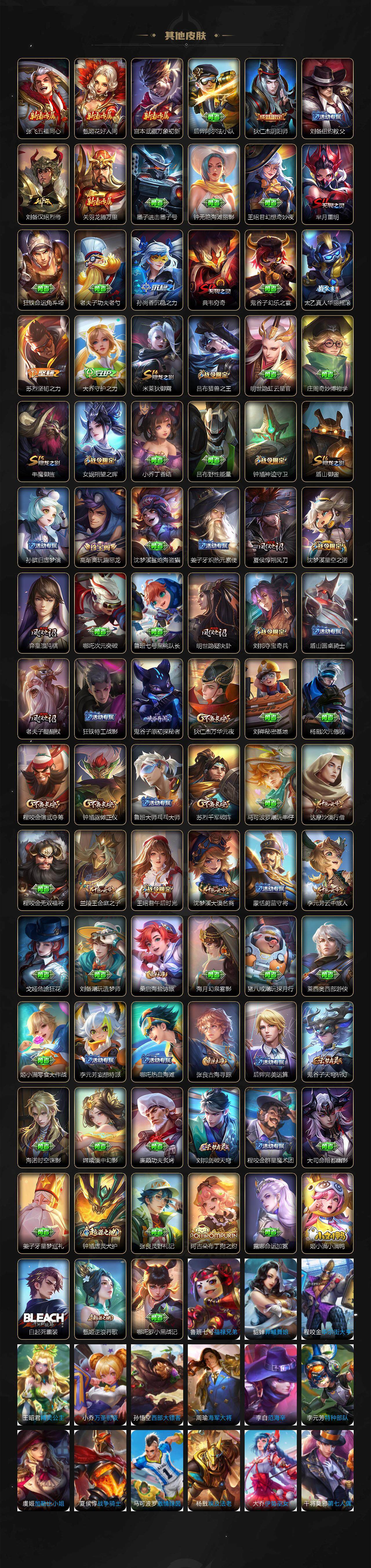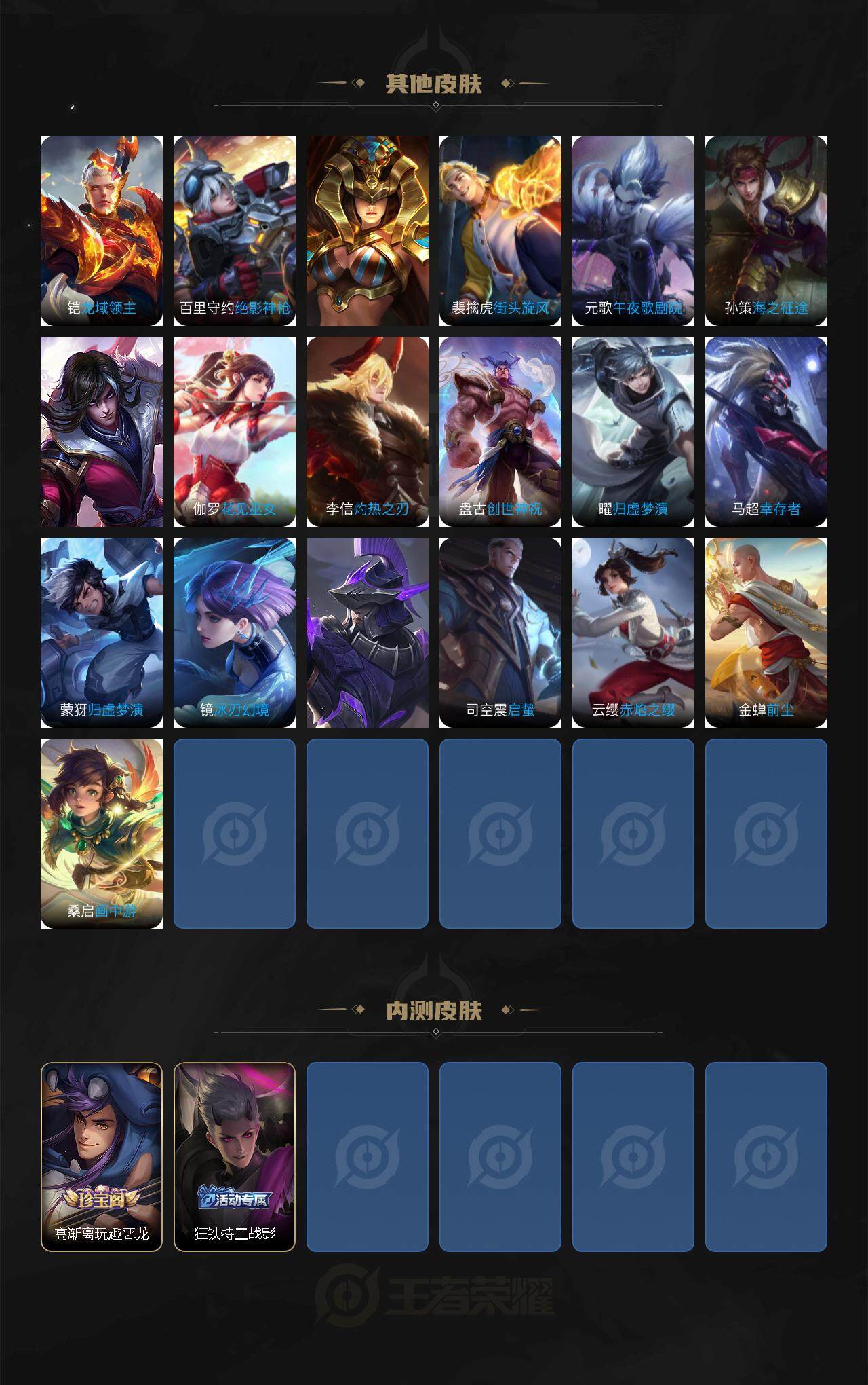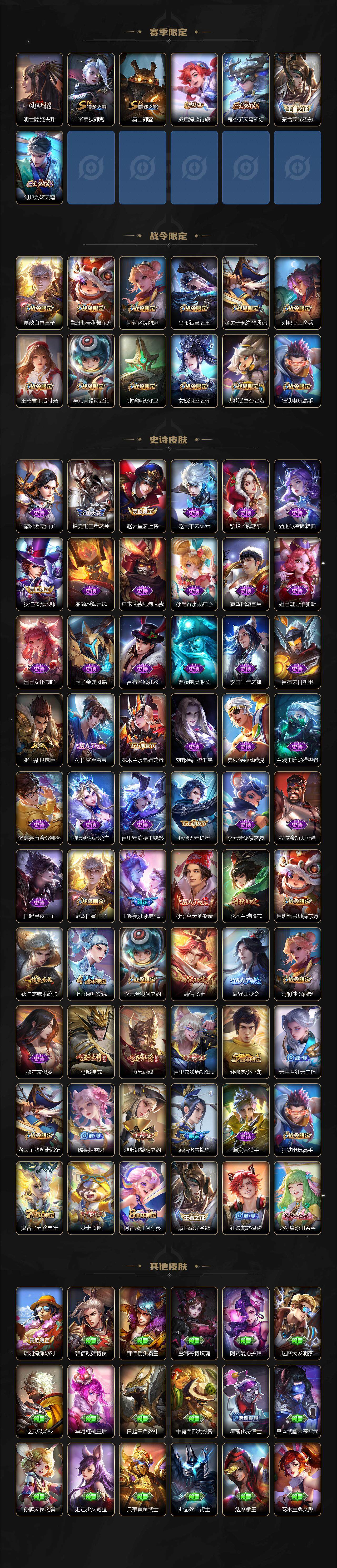 【限定皮肤】:狄仁杰阴阳师,赵云皇家上将,嬴政白昼王子,鲁班七号狮舞东方,高渐离玩趣恶龙,阿轲迷踪丽影,钟无艳王者之锤,芈月重明,吕布猎兽之王,夏侯惇朔风刀,典韦穷奇,狄仁杰魔术师,狄仁杰万华元夜,达摩沙漠行僧,项羽海滩派对,老夫子醍醐杖,老夫子航海奇遇记,关羽武圣,程咬金演武夺筹,刘邦夺宝奇兵,韩信飞衡,韩信傲雪梅枪,王昭君午后时光,兰陵王金庭之子,花木兰瑞麟志,孙悟空至尊宝,孙悟空大圣娶亲,牛魔御旌,后羿如梦令,李元芳银河之约,李元芳云中旅人,钟馗神迹守卫,钟馗驱傩正仪,女娲朔望之晖,干将莫邪冰霜恋舞曲,雅典娜黎明之约,太乙真人华丽摇滚,鬼谷子原初探秘者,鬼谷子五谷丰年,诸葛亮鹤羽星尊,黄忠烈魂,苏烈千军破阵,百里玄策白虎志,百里玄策原初追逐者,弈星混沌棋,梦奇顽趣,沈梦溪星空之诺,沈梦溪大漠名商,明世隐疑决卦,裴擒虎李小龙,狂铁电玩高手,米莱狄御霄,云中君纤云弄巧,盾山御銮,上官婉儿梁祝,嫦娥拒霜思,桑启海盐诗旅,阿古朵江河有灵,张良古海寻踪,蒙恬荣光圣徽,鬼谷子天穹祈灯,刘邦剑破天穹,程咬金群星魔术团