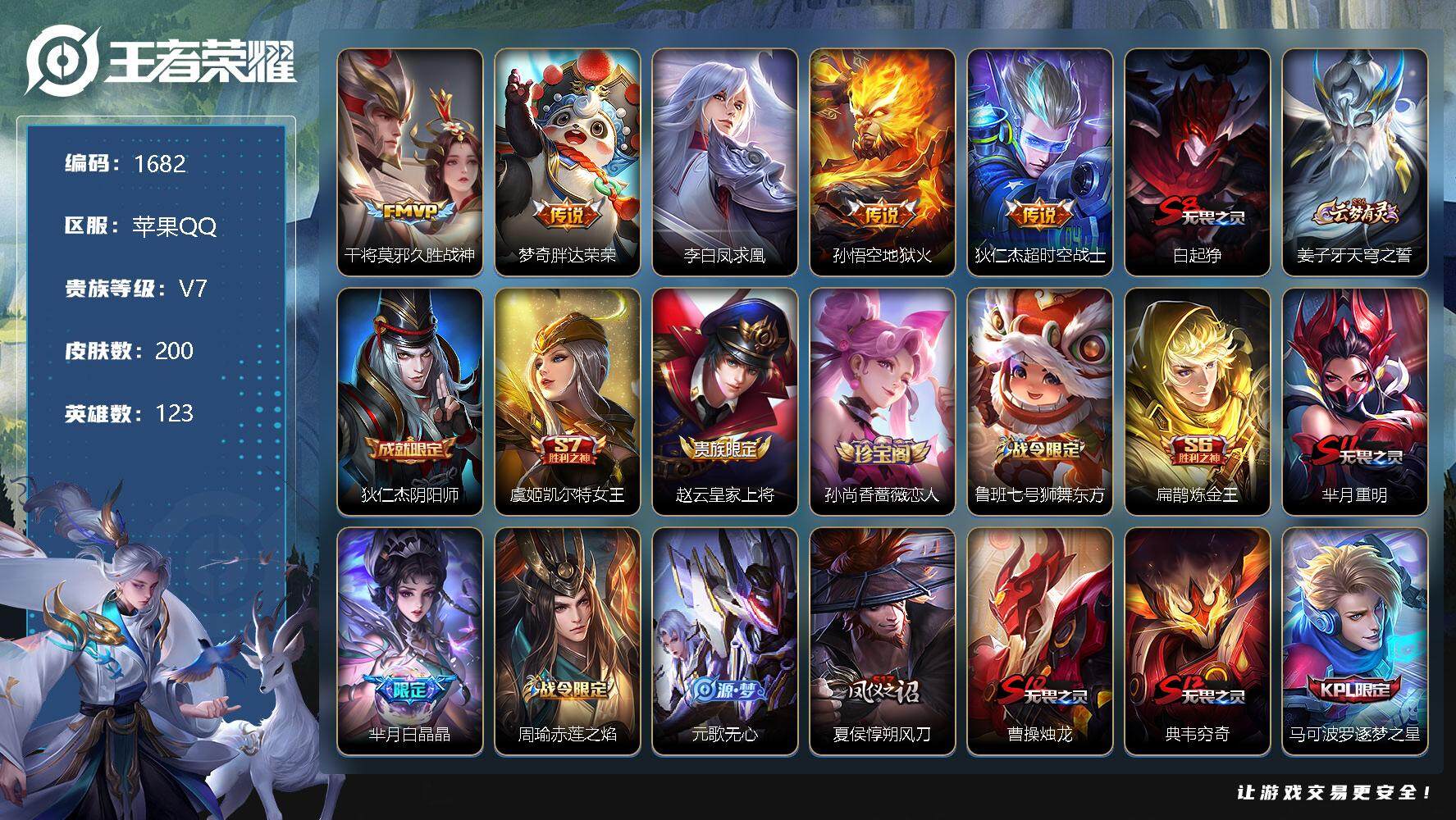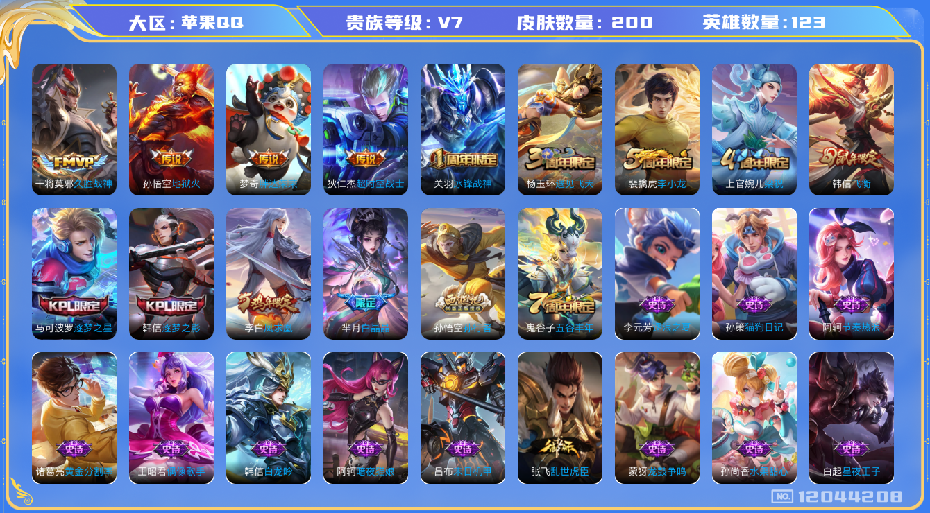 [12044208]【商品标题】:苹果Q-V7-永恒钻石III段位-123英雄-200皮肤-0典藏-0珍品无双-0无双-0珍品传说-5传说-48史诗