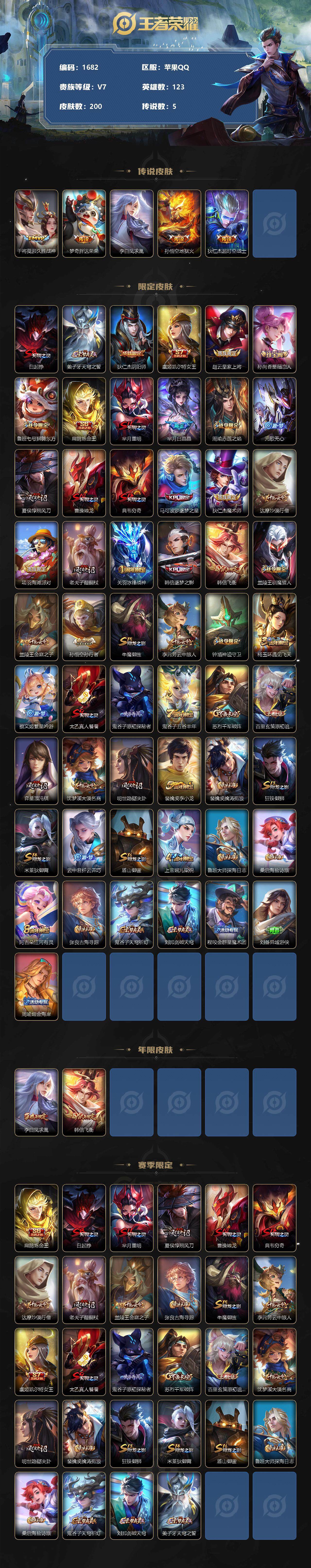 - [11497609]V7 6传说 123英雄 242皮肤 可修改实名 传说皮:典韦战鼓燎原,淬星耀世,久胜战神,浮生妄,记忆之芯(机甲兔) 珍宝阁皮:妄想食味,女武神 限定皮:鸣野蒿,至尊宝,高山流水,五谷丰年,游园惊梦,梁祝,天狼溯光者,李小龙,孙行者,大圣娶亲,乒乒小将,玉兔公主 史诗皮:龙之律动,江河有灵,高渐离燃音魔法,蒙恬荣光圣徽,偶像歌手,晚萤,电玩·爆裂旋风,猫狗日记-孙策,乱世虎臣,修罗,女仆咖啡,摇滚巨星,水果甜心,天才门将,星夜王子,心灵骇客,功夫厨神,暗隐猎兽者,幽灵船长,鬼剑武藏,天秀·启明,纤云弄巧,繁星吟游(呼啦呼啦),拒霜思,缤纷独角兽,乘风破浪,逐浪之夏,月团寄思,水晶猎龙者,金属风暴,原初追逐者,圣诞狂欢,圣诞恋歌,鹰眼统帅,暗夜贵公子,魅力维加斯,黎明之约,无心