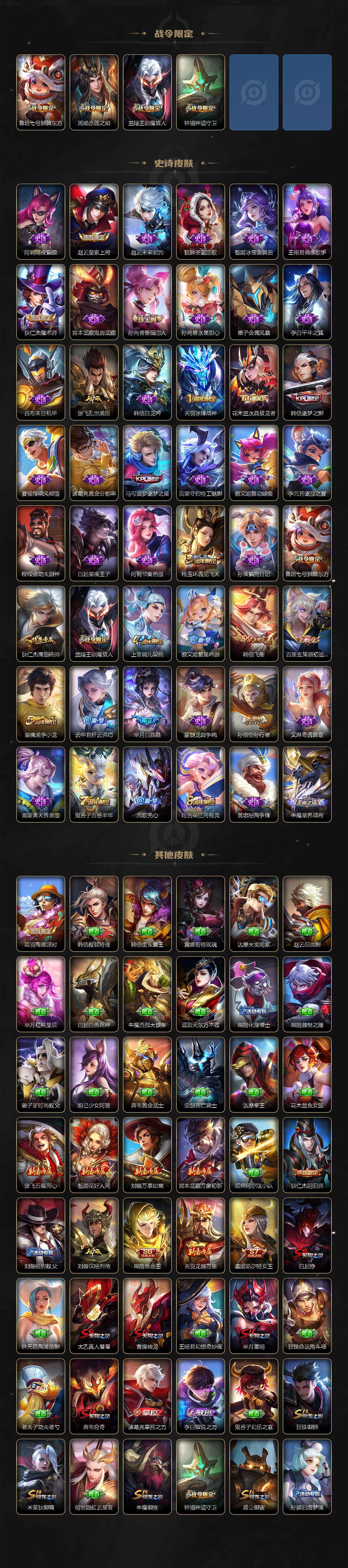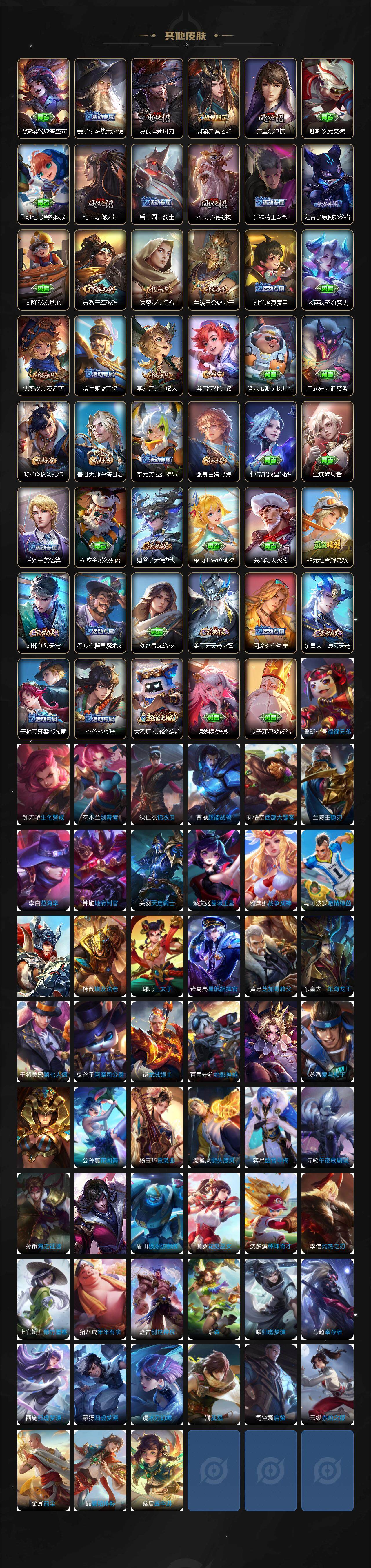 【限定皮肤】:白起狰,姜子牙天穹之誓,狄仁杰阴阳师,虞姬凯尔特女王,赵云皇家上将,孙尚香蔷薇恋人,鲁班七号狮舞东方,扁鹊炼金王,芈月重明,芈月白晶晶,周瑜赤莲之焰,元歌无心,夏侯惇朔风刀,曹操烛龙,典韦穷奇,马可波罗逐梦之星,狄仁杰魔术师,达摩沙漠行僧,项羽海滩派对,老夫子醍醐杖,关羽冰锋战神,韩信逐梦之影,韩信飞衡,兰陵王驯魔猎人,兰陵王金庭之子,孙悟空孙行者,牛魔御旌,李元芳云中旅人,钟馗神迹守卫,杨玉环遇见飞天,蔡文姬繁星吟游,太乙真人饕餮,鬼谷子原初探秘者,鬼谷子五谷丰年,苏烈千军破阵,百里玄策原初追逐者,弈星混沌棋,沈梦溪大漠名商,明世隐疑决卦,裴擒虎李小龙,裴擒虎擒涛扼浪,狂铁御狮,米莱狄御霄,云中君纤云弄巧,盾山御銮,上官婉儿梁祝,鲁班大师探海日志,桑启海盐诗旅,阿古朵江河有灵,张良古海寻踪,鬼谷子天穹祈灯,刘邦剑破天穹,程咬金群星魔术团,刘备异域游侠,周瑜熔金海岸