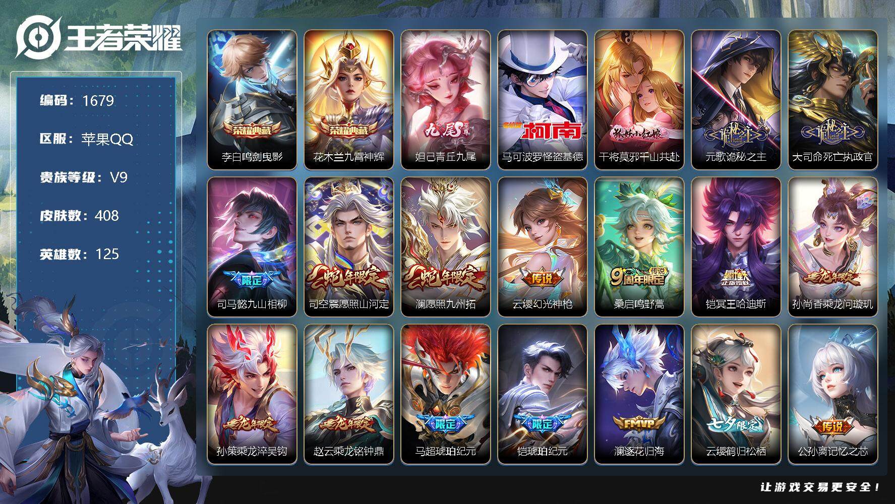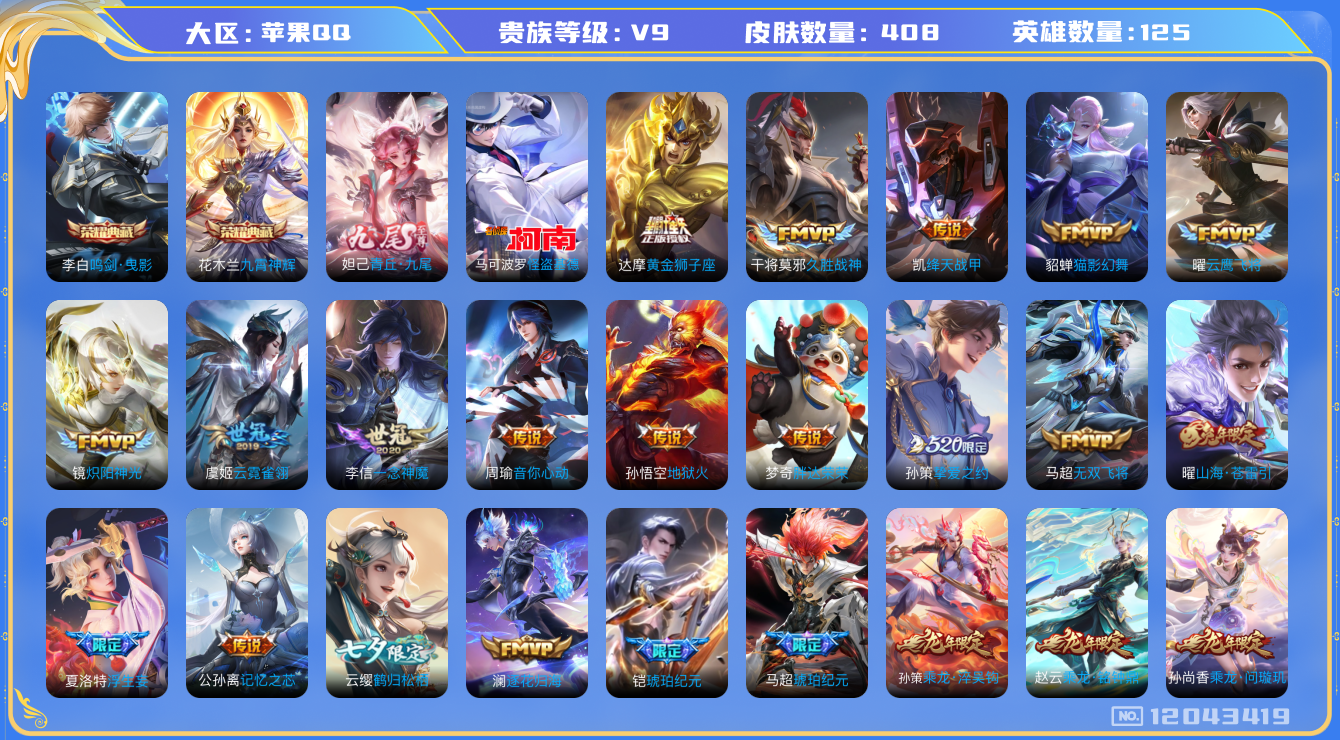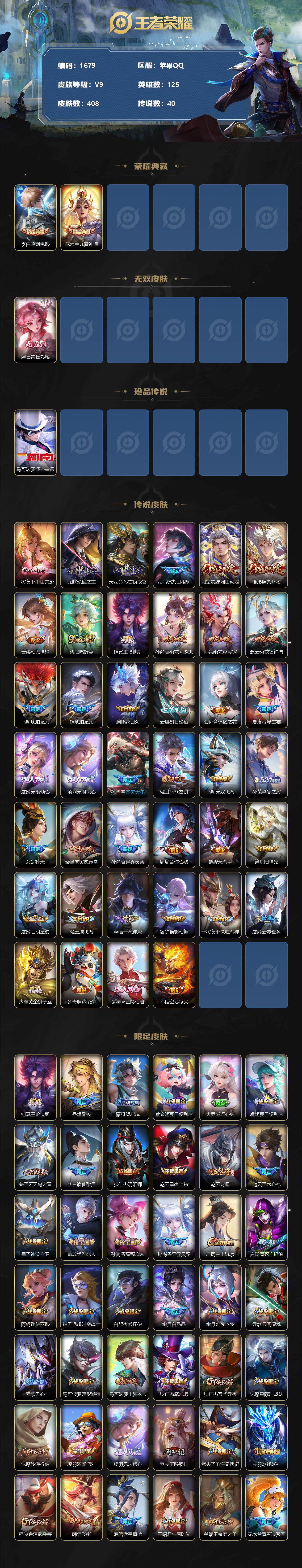 [12043419]【商品标题】:苹果Q-V9-最强王者段位-125英雄-408皮肤-2典藏-0珍品无双-1无双-1珍品传说-40传说-136史诗