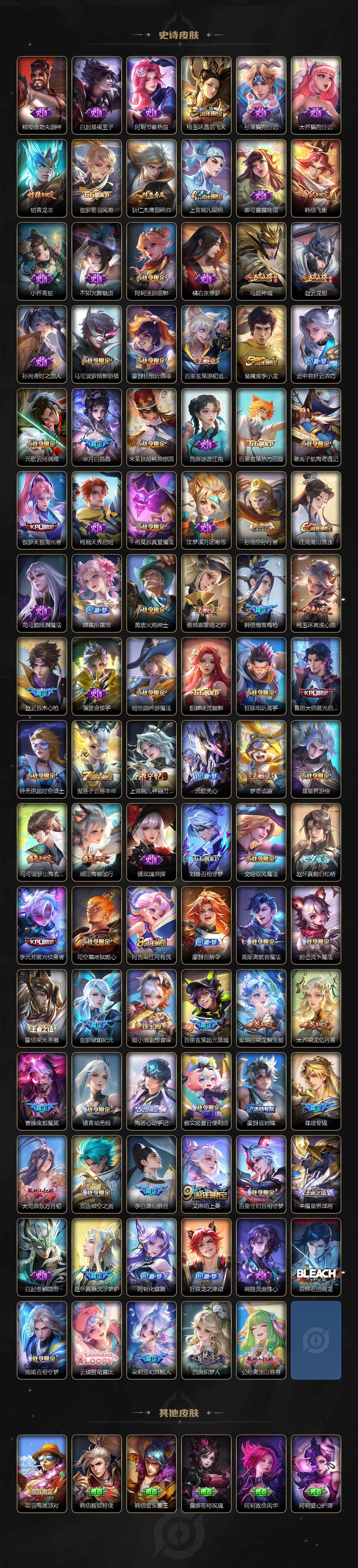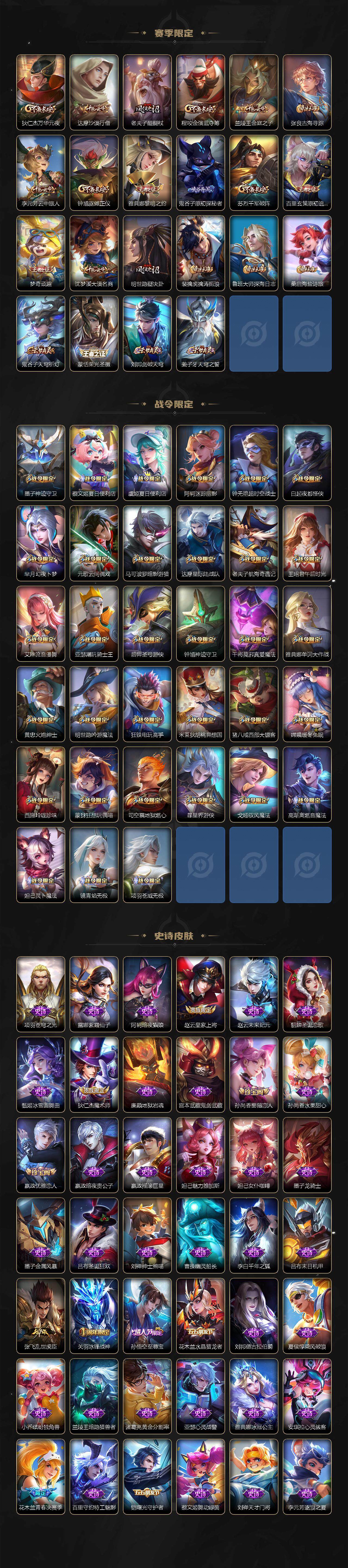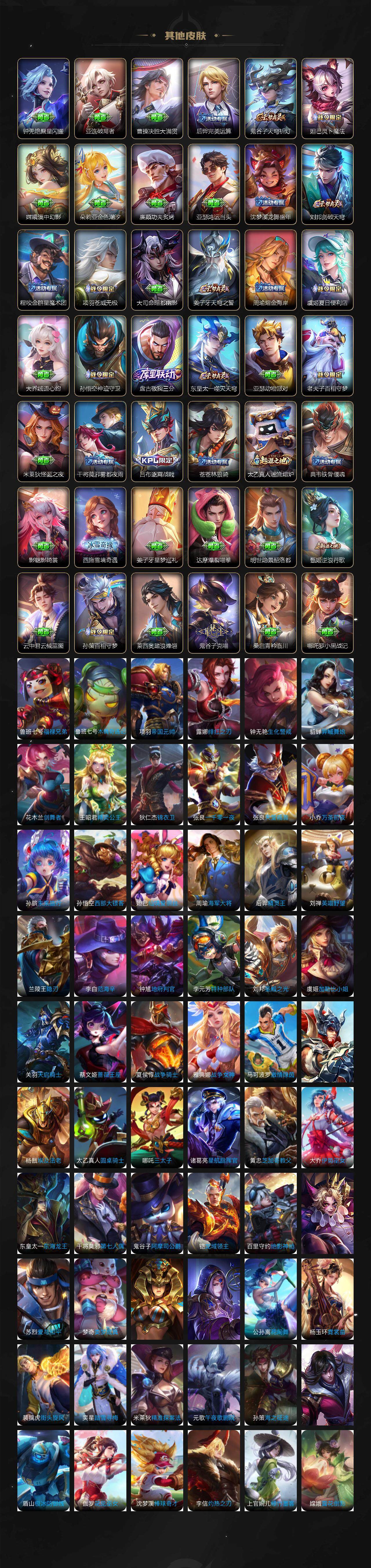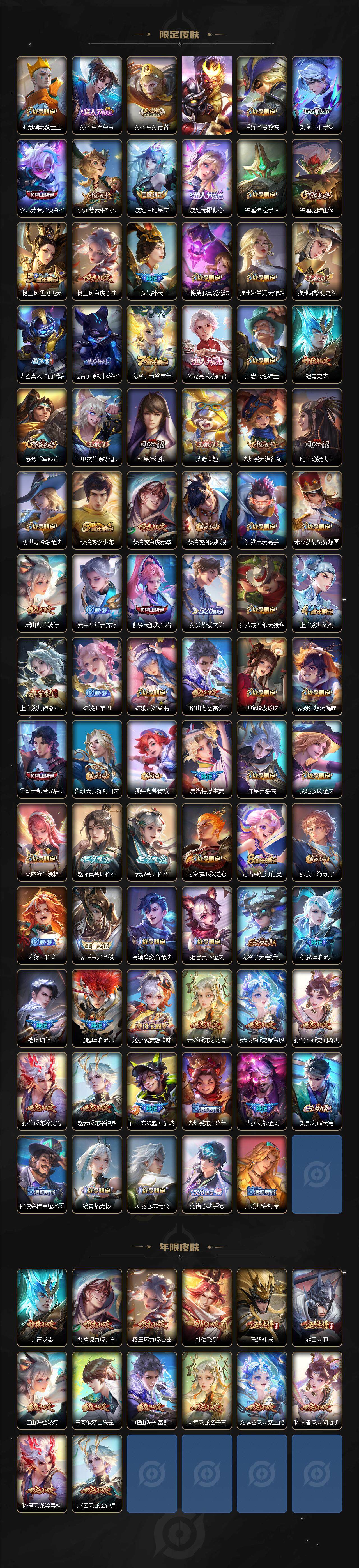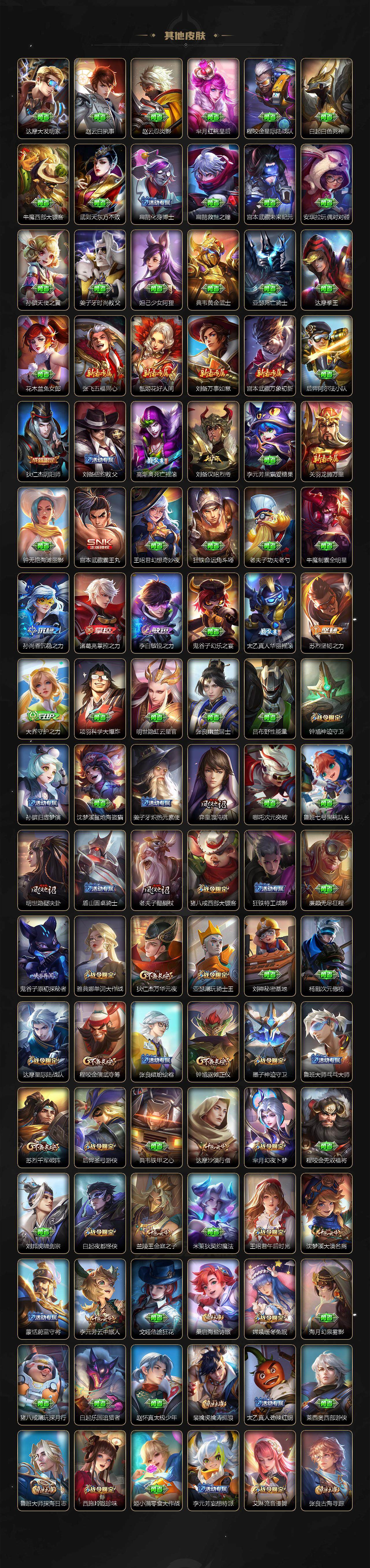 【限定皮肤】:铠冥王哈迪斯,暃埋骨钱,蒙犽顽岩魄,蔡文姬夏日便利店,大乔绒语心约,虞姬夏日便利店,姜子牙天穹之誓,李白谪仙醉月,狄仁杰阴阳师,赵云皇家上将,赵云龙胆,赵云百木心枪,墨子神迹守卫,嬴政优雅恋人,孙尚香蔷薇恋人,孙尚香异界灵契,庄周高山流水,高渐离死亡摇滚,阿轲迷踪丽影,钟无艳超时空战士,白起夜都怪侠,芈月白晶晶,芈月幻夜卜梦,元歌云间偶戏,元歌无心,马可波罗暗影游猎,马可波罗山海玄木吟,狄仁杰魔术师,狄仁杰万华元夜,达摩星际陆战队,达摩沙漠行僧,项羽海滩派对,项羽无限倾心,老夫子醍醐杖,老夫子航海奇遇记,关羽冰锋战神,程咬金演武夺筹,韩信飞衡,韩信傲雪梅枪,王昭君午后时光,兰陵王金庭之子,花木兰青春决赛季,亚瑟潮玩骑士王,孙悟空至尊宝,孙悟空孙行者,孙悟空齐天大圣,后羿圣弓游侠,刘备百相守梦,李元芳匿光侦查者,李元芳云中旅人,虞姬启明星使,虞姬无限倾心,钟馗神迹守卫,钟馗驱傩正仪,杨玉环遇见飞天,杨玉环寅虎心曲,女娲补天,干将莫邪真爱魔法,雅典娜单词大作战,雅典娜黎明之约,太乙真人华丽摇滚,鬼谷子原初探秘者,鬼谷子五谷丰年,诸葛亮武陵仙君,黄忠火炮绅士,铠青龙志,苏烈千军破阵,百里玄策原初追逐者,弈星混沌棋,梦奇顽趣,沈梦溪大漠名商,明世隐疑决卦,明世隐吟游魔法,裴擒虎李小龙,裴擒虎寅虎赤拳,裴擒虎擒涛扼浪,狂铁电玩高手,米莱狄胡桃异想国