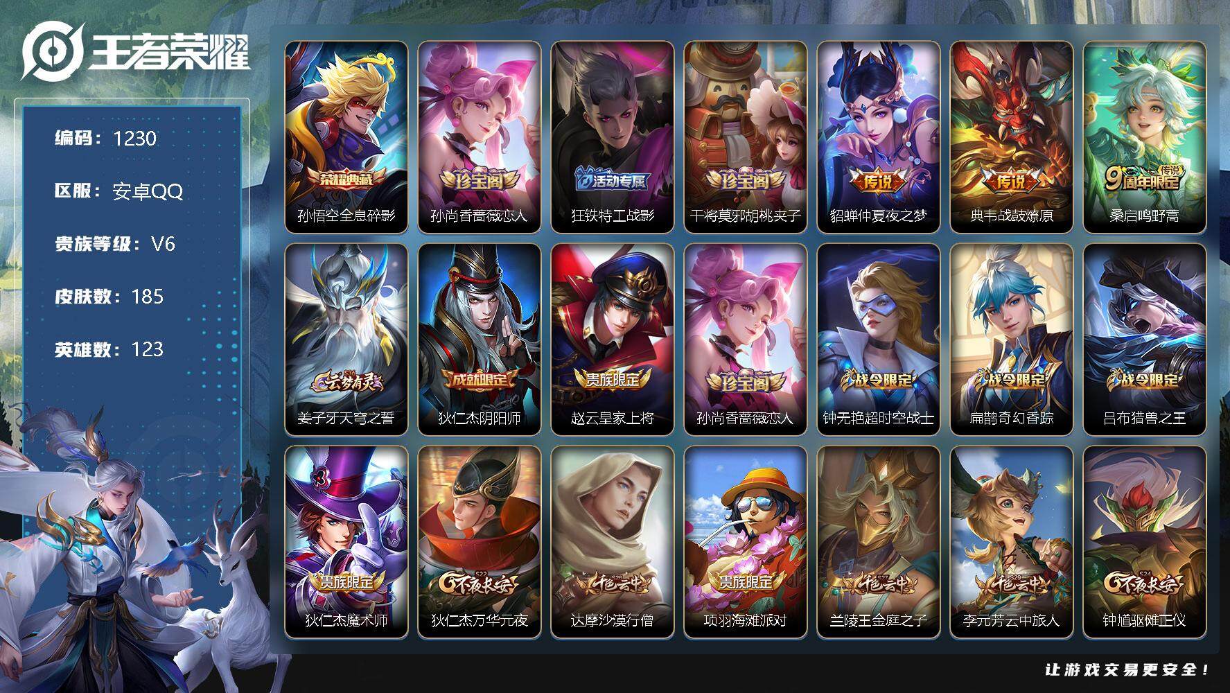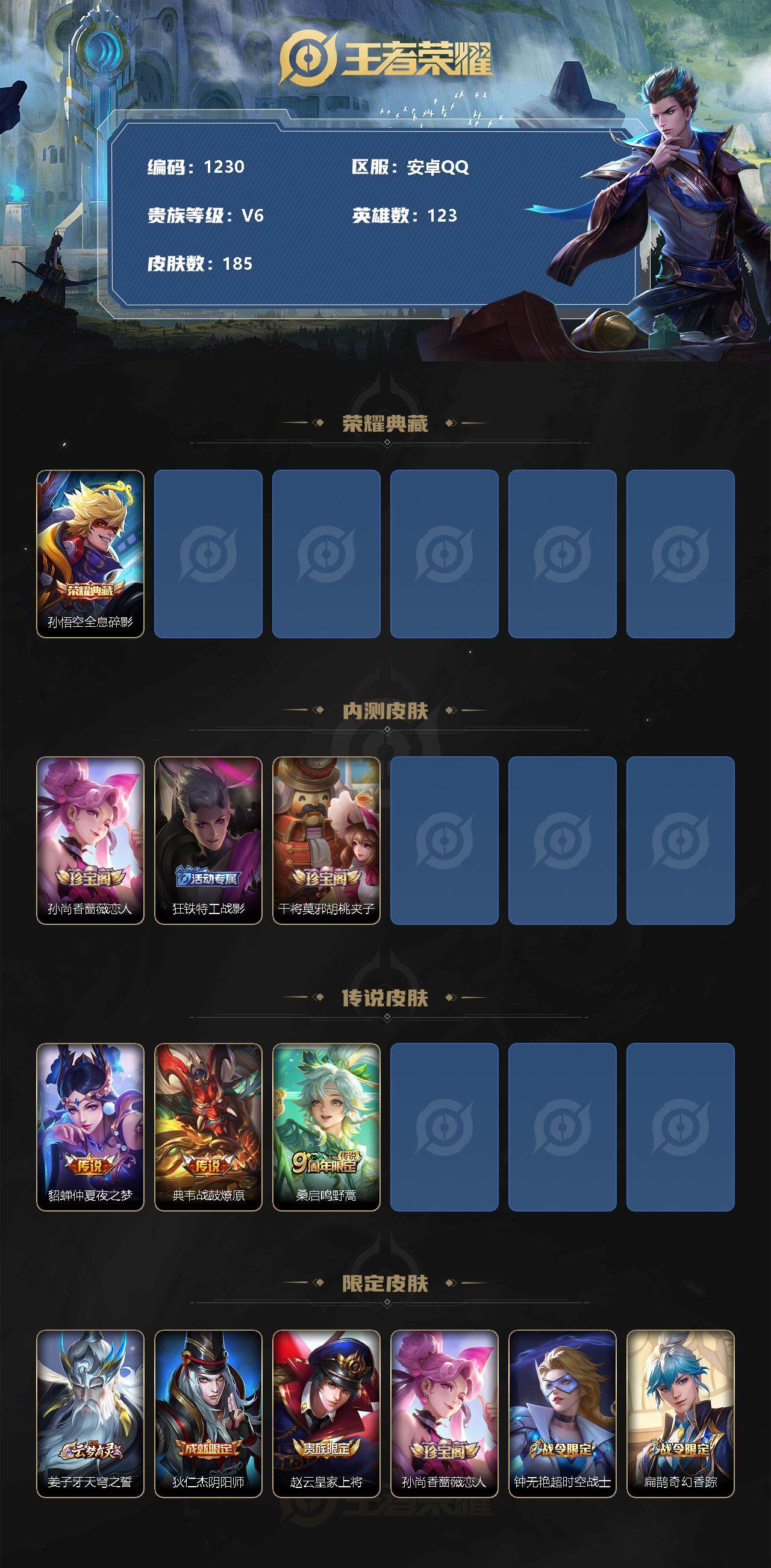 [12046538]【商品标题】:安卓Q-V6-最强王者段位-123英雄-185皮肤-1典藏-0珍品无双-0无双-0珍品传说-3传说-45史诗