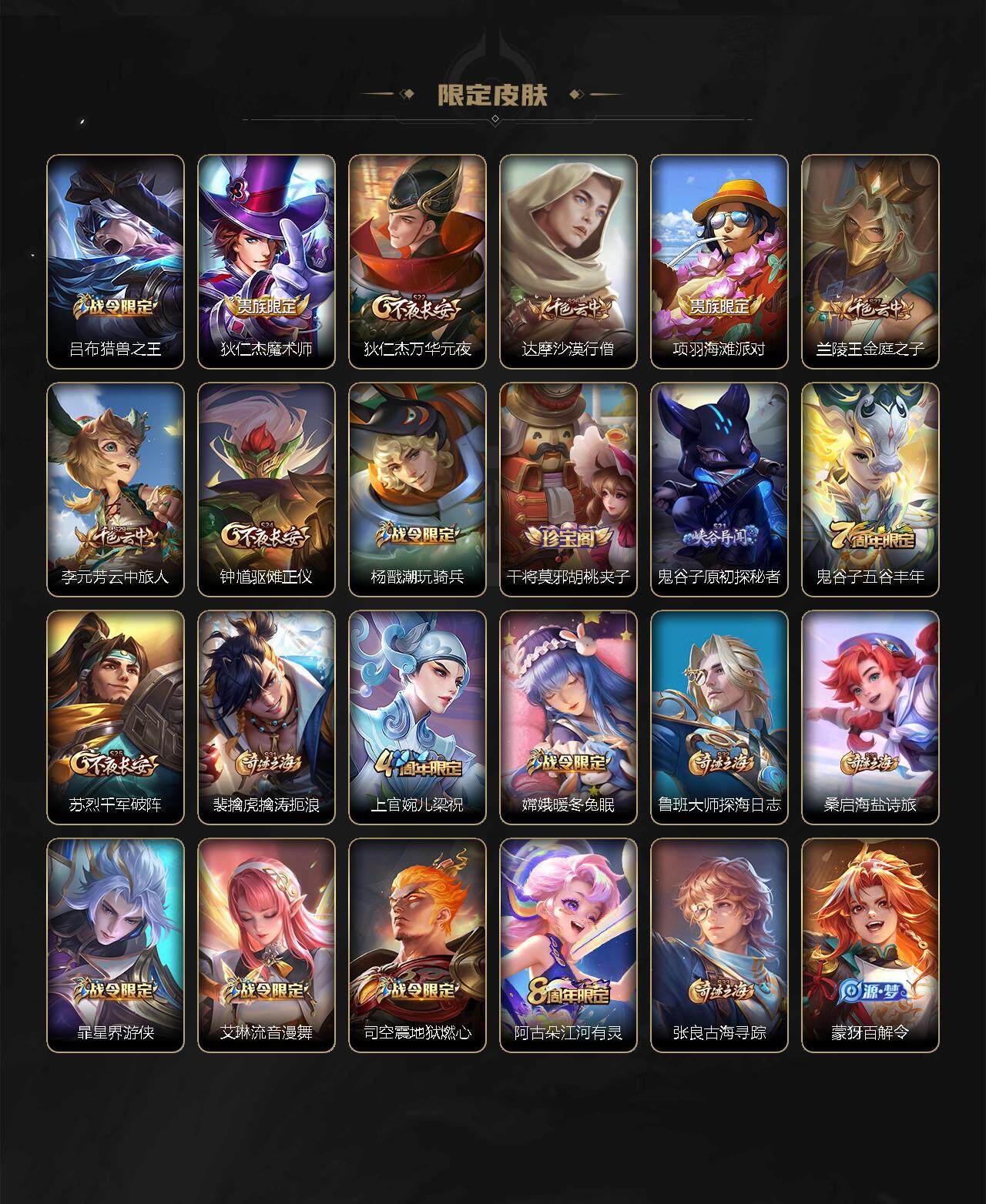 【限定皮肤】:姜子牙天穹之誓,狄仁杰阴阳师,赵云皇家上将,孙尚香蔷薇恋人,钟无艳超时空战士,扁鹊奇幻香踪,吕布猎兽之王,狄仁杰魔术师,狄仁杰万华元夜,达摩沙漠行僧,项羽海滩派对,兰陵王金庭之子,李元芳云中旅人,钟馗驱傩正仪,杨戬潮玩骑兵,干将莫邪胡桃夹子,鬼谷子原初探秘者,鬼谷子五谷丰年,苏烈千军破阵,裴擒虎擒涛扼浪,上官婉儿梁祝,嫦娥暖冬兔眠,鲁班大师探海日志,桑启海盐诗旅,暃星界游侠,艾琳流音漫舞,司空震地狱燃心,阿古朵江河有灵,张良古海寻踪,蒙犽百解令,高渐离燃音魔法,妲己灵卜魔法,鬼谷子天穹祈灯,沈梦溪龙舞盛年,刘邦剑破天穹,程咬金群星魔术团