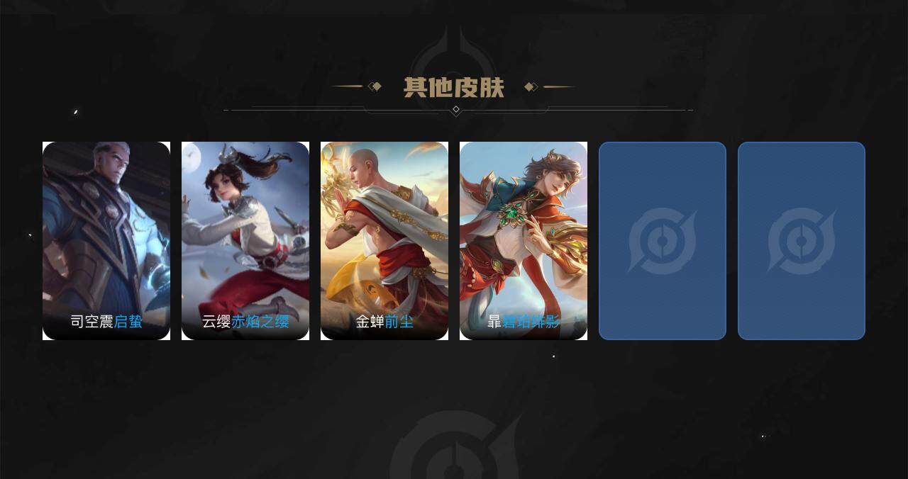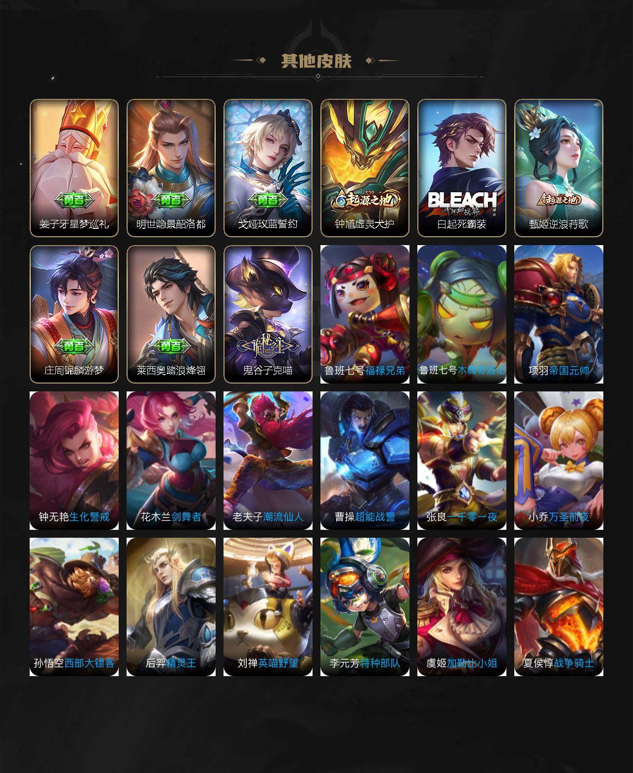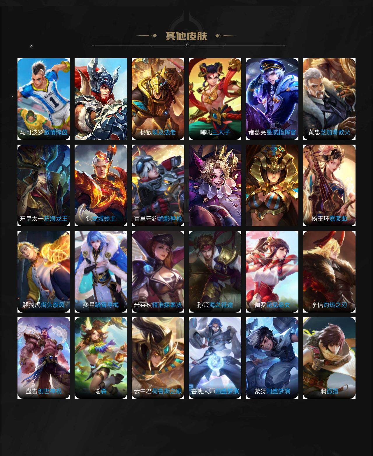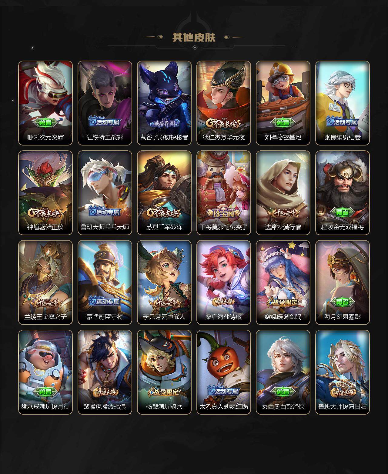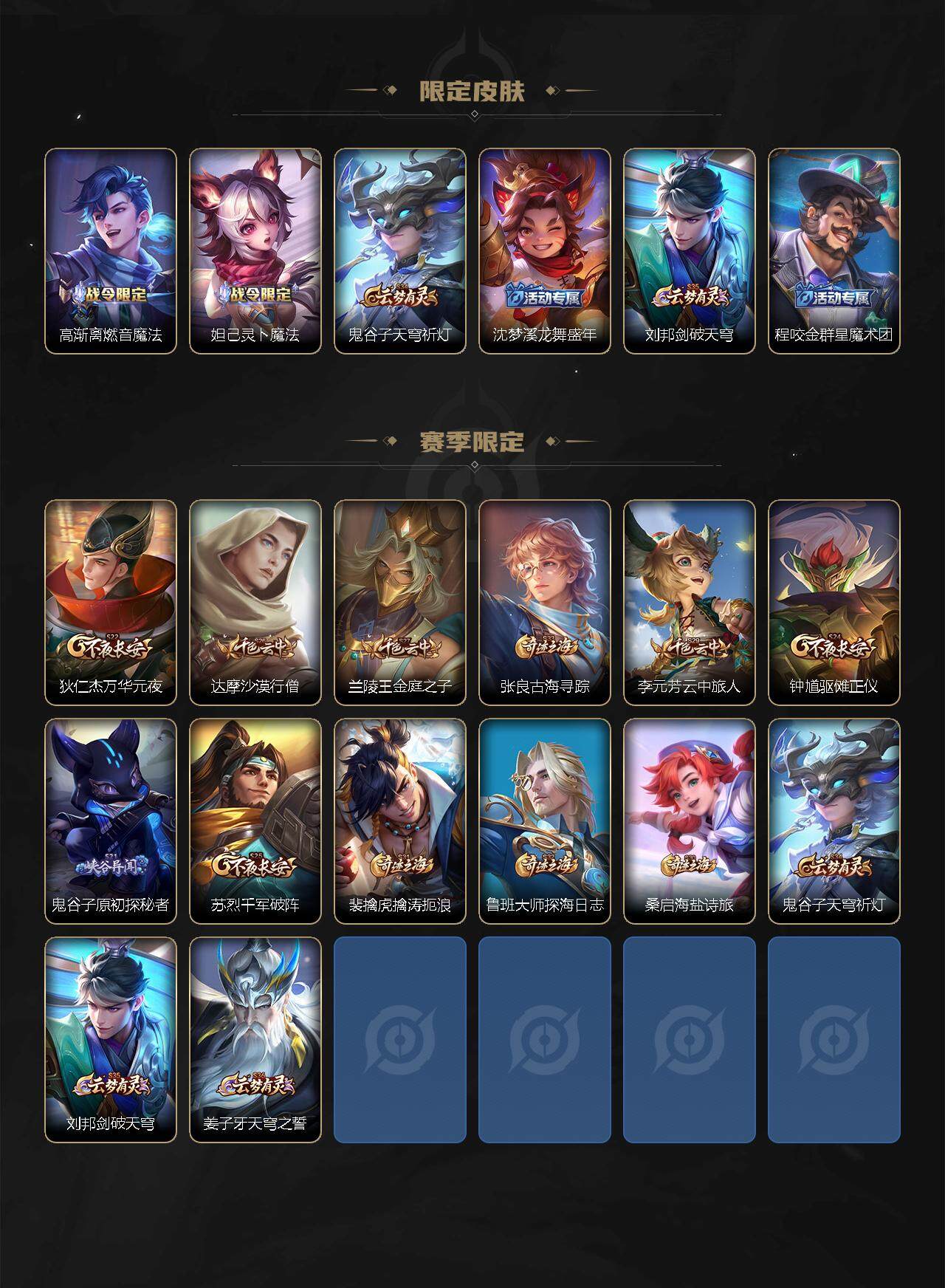 【赛季限定】:狄仁杰万华元夜,达摩沙漠行僧,兰陵王金庭之子,张良古海寻踪,李元芳云中旅人,钟馗驱傩正仪,鬼谷子原初探秘者,苏烈千军破阵,裴擒虎擒涛扼浪,鲁班大师探海日志,桑启海盐诗旅,鬼谷子天穹祈灯,刘邦剑破天穹,姜子牙天穹之誓