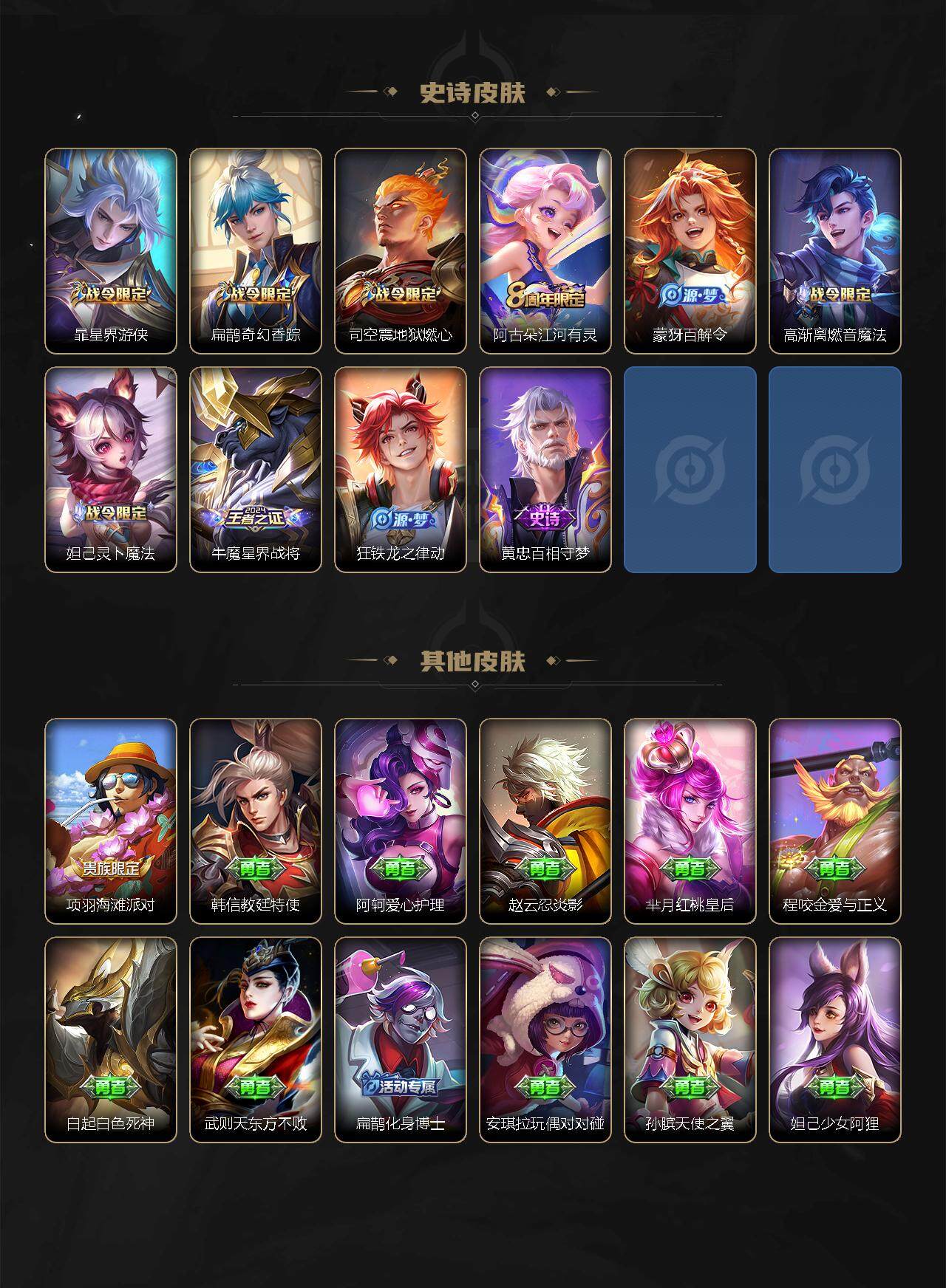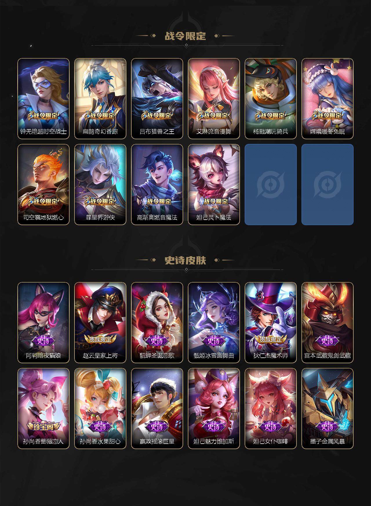 【史诗皮肤】:阿轲暗夜猫娘,赵云皇家上将,貂蝉圣诞恋歌,甄姬冰雪圆舞曲,狄仁杰魔术师,宫本武藏鬼剑武藏,孙尚香蔷薇恋人,孙尚香水果甜心,嬴政摇滚巨星,妲己魅力维加斯,妲己女仆咖啡,墨子金属风暴,吕布圣诞狂欢,曹操幽灵船长,吕布末日机甲,刘邦德古拉伯爵,夏侯惇乘风破浪,小乔缤纷独角兽,兰陵王暗隐猎兽者,亚瑟心灵战警,雅典娜冰冠公主,安琪拉心灵骇客,铠曙光守护者,蔡文姬舞动绿茵,刘禅天才门将,李元芳逐浪之夏,程咬金功夫厨神,白起星夜王子,孙策猫狗日记,狄仁杰鹰眼统帅,上官婉儿梁祝,西施诗语江南,安琪拉时之奇旅,貂蝉唤灵魅影,钟无艳超时空战士,鬼谷子五谷丰年,暃星界游侠,扁鹊奇幻香踪,司空震地狱燃心,阿古朵江河有灵,蒙犽百解令,妲己灵卜魔法,高渐离燃音魔法,牛魔星界战将,狂铁龙之律动,黄忠百相守梦