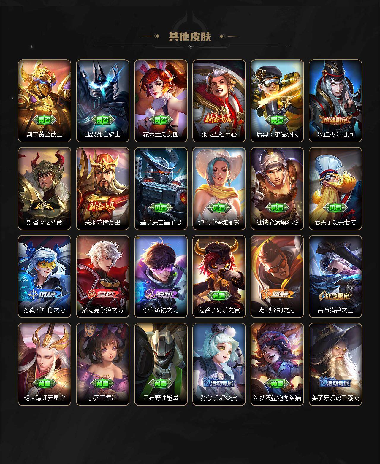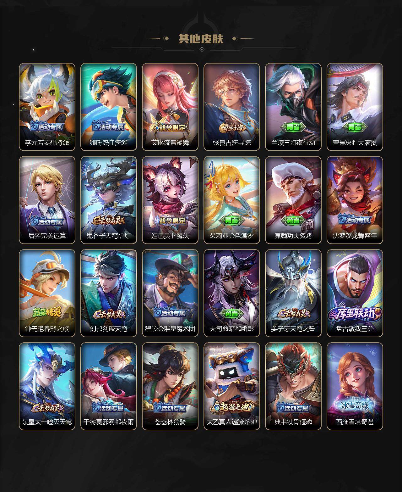 李元芳逐浪之夏,孙策猫狗日记,阿轲暗夜猫娘,雅典娜冰冠公主,吕布末日机甲,嬴政摇滚巨星,刘禅天才门将,白起星夜王子,安琪拉心灵骇客,安琪拉时之奇旅,程咬金功夫厨神,刘邦德古拉伯爵,兰陵王暗隐猎兽者,曹操幽灵船长,宫本武藏鬼剑武藏,亚瑟心灵战警,蔡文姬舞动绿茵,西施诗语江南,小乔缤纷独角兽,夏侯惇乘风破浪,铠曙光守护者,墨子金属风暴,吕布圣诞狂欢,貂蝉圣诞恋歌,貂蝉唤灵魅影,蒙犽百解令,高渐离燃音魔法