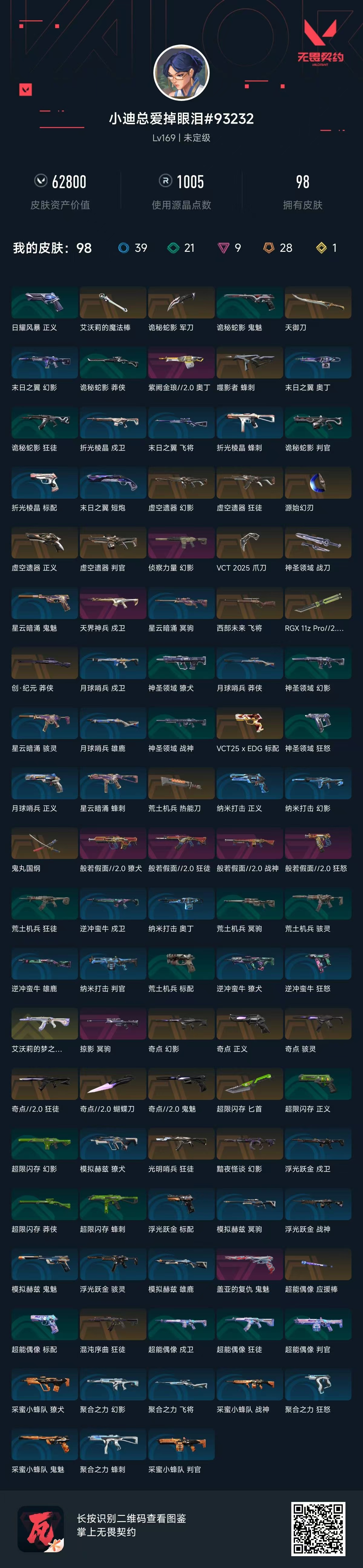 [12044393]段位: 未定级 近战武器皮肤: 天御刀,艾沃莉的魔法棒,超能偶像 应援棒,匕首-超限闪存,蝴蝶刀-奇点//2.0,荒土机兵热能刀,鬼丸国纲,神圣领域 战刀,RGX 11z Pro//2.0 蝴蝶刀,VCT 2025 爪刀,源始幻刃,诡秘蛇影 步枪皮肤: 幻影-奇点,幻影-侦察力量,戍卫-天界神兵,狂徒-艾沃莉的梦之翼,狂徒-混沌序曲,幻影-黯夜怪谈,狂徒-光明哨兵,狂徒-奇点//2.0,狂徒-般若假面//2.0,獠犬-般若假面//2.0,幻影-虚空遗器,狂徒-虚空遗器 佩枪皮肤: 正义-奇点,鬼魅-盖亚的复仇,鬼魅-奇点//2.0,狂怒-般若假面//2.0,标配-VCT25xEDG,正义-虚空遗器 狙击枪皮肤: 冥驹-掠影,莽侠-创·纪元,飞将-西部未来 冲锋枪皮肤: 骇灵-奇点,蜂刺-噬影者 霰弹枪皮肤: 判官-虚空遗器 机枪皮肤: 奥丁-紫阙金琅2.0,战神-般若假面//2.0