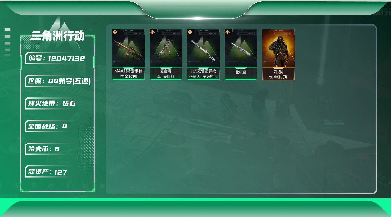 [12047132]总资产:127.9M 1干员外观 1近战传说 4传说枪械 哈夫币:6.783K 可二次 可修改实名 优质装备:近战-北极星 烽火地带段位:钻石 全面战场段位:无段位 传说武器皮肤:725双管霰弹枪-送葬人-无题密令,复合弓-黑-天际线,M4A1突击步枪-蚀金玫瑰 干员外观:红狼-蚀金玫瑰