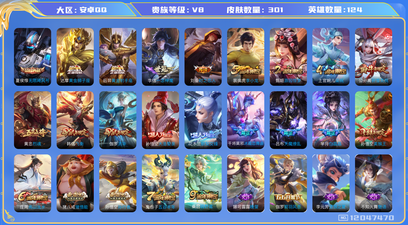 [12047470]【商品标题】:安卓Q-V0-永恒钻石II段位-124英雄-301皮肤-1典藏-0珍品无双-0无双-0珍品传说-9传说-80史诗