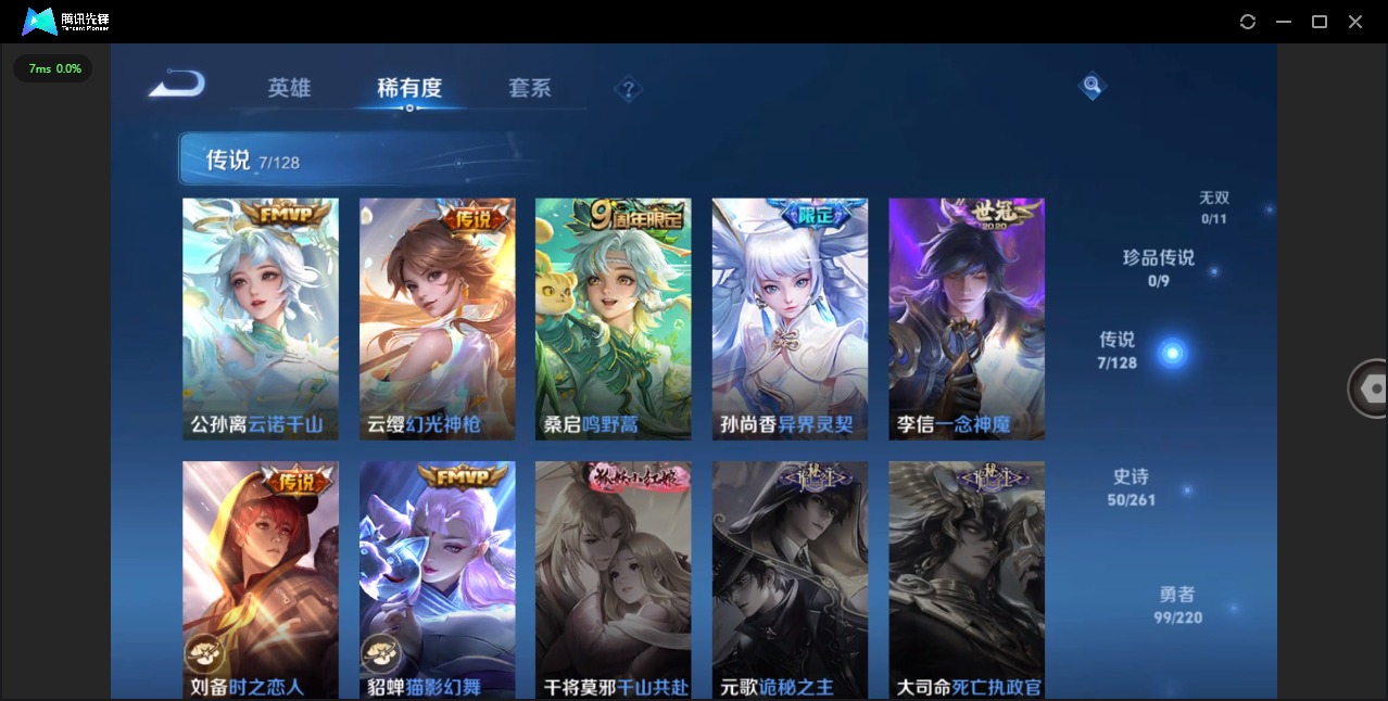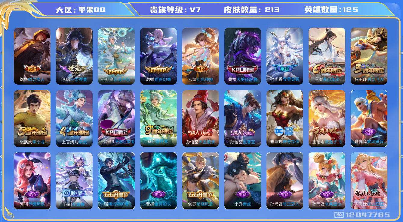 [12047785]V7 7传说 125英雄 213皮肤 可修改实名 优质装备:猫影幻舞,一念神魔,时之恋人-刘备(电焊工) 传说皮:云诺千山,幻光神枪 限定皮:鸣野蒿,至尊宝,凤凰于飞,异界灵契(白毛香),遇见飞天,高山流水,梁祝,天狼征服者,天狼绘梦者,李小龙,大圣娶亲,神奇女侠 史诗皮:鸭鸭历险记-刘禅,化蝶舞,龙之律动,百相守梦-周瑜,涂山红红,织梦人,无限星赏官,青蛇,时之恋人-孙尚香,节奏热浪,水果甜心,星夜王子,暗隐猎兽者,幽灵船长,鬼剑武藏,舞动绿茵,纤云弄巧,繁星吟游(呼啦呼啦),拒霜思,乘风破浪,曙光守护者,箭羽风息,金属风暴,圣诞恋歌,鹰眼统帅,魅力维加斯,未来纪元-赵云