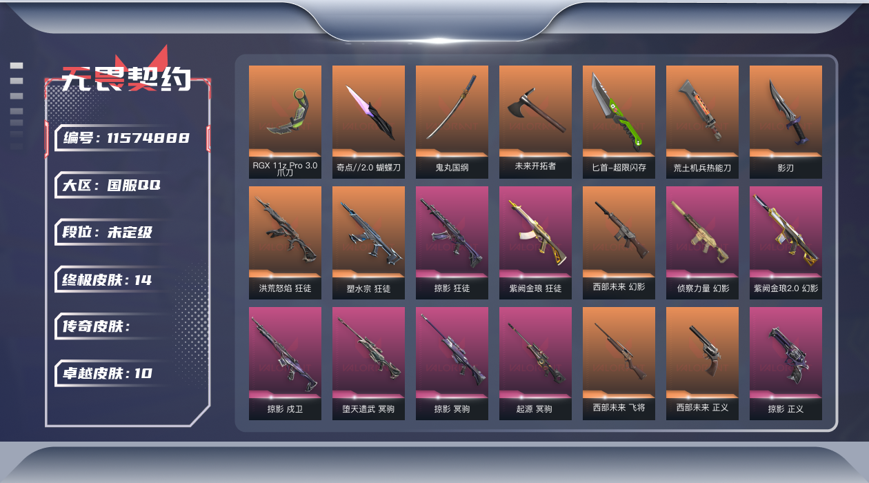 [11574888]【套装】:西部未来套装,掠影套装 【英雄】:幻棱,炼狱,维斯,暮蝶,钛狐,壹决,铁臂,捷风,雷兹,幽影,不死鸟,贤者,猎枭,蝰蛇,零,芮娜,奇乐,尚勃勒,霓虹,夜露,星礈,K/O,海神,盖可,黑梦 【近战 武器】:近战武器-RGX 11z Pro//3.0 爪刀,近战武器-奇点//2.0 蝴蝶刀,近战武器-鬼丸国纲,近战武器-未来开拓者,近战武器-超限闪存 匕首,近战武器-荒土机兵 热能刀,近战武器-影刃 【狂徒】:狂徒-洪荒怒焰,狂徒-塑水宗,狂徒-掠影,狂徒-紫阙金琅,狂徒-荒土机兵 【幻影】:幻影-西部未来,幻影-侦察力量,幻影-紫阙金琅//2.0,幻影-超限闪存,幻影-纳米打击,幻影-西部未来 【戍卫】:戍卫-掠影,戍卫-浮光跃金,戍卫-逆冲蛮牛,戍卫-折光棱晶 【獠犬】:獠犬-模拟赫兹,獠犬-逆冲蛮牛 【冥驹】:冥驹-堕天遗武,冥驹-掠影,冥驹-起源,冥驹-荒土机兵,冥驹-模拟赫兹 【飞将】:飞将-西部未来,飞将-末日之翼 【莽侠】:莽侠-超限闪存 【战神】:战神-奇点,战神-浮光跃金 【奥丁】:奥丁-西部未来,奥丁-纳米打击 【判官】:判官-诡秘蛇影,判官-纳米打击x 【雄鹿】:雄鹿-模拟赫兹,雄鹿-逆冲蛮牛 【骇灵】:骇灵-荒土机兵,骇灵-浮光跃金 【蜂刺】:蜂刺-超限闪存,蜂刺-折光棱晶 【标配】:标配-荒土机兵,标配-浮光跃金,标配-折光棱晶 【正义】:正义-西部未来,正义-掠影,正义-超限闪存,正义-纳米打击 【鬼魅】:鬼魅-天界神兵,鬼魅-模拟赫兹 【狂怒】:狂怒-逆冲蛮牛 【短炮】:短炮-末日之翼 【卡面】:进入射程 卡面,分崩离析 卡面,纳米打击 卡面,抑制技术 卡面,激斗汉堡 卡面,瓦娃脸雪糕 P2 卡面,从黄昏到黎明 卡面,荒土机兵 卡面,银弹猎手 卡面,逆冲蛮牛 卡面,《双城之战》拥抱 卡面,精灵大战 卡面,欢迎来到底城 卡面,南瓜盛典 卡面,VCT CN首冠 卡面,唱片的故事 卡面,钢弓与箭弦 卡面,排除故障 卡面,战术桌游 卡面,悠享食光 卡面,修车达人 卡面,模拟赫兹 卡面,浮光跃金 卡面,超限闪存 卡面,维斯工牌 卡面,正义的化身 卡面,时间到 卡面,最高舞台 卡面,梦幻奶茶 卡面,零点嗅探设计图 卡面,无畏契约GO!第一卷:芮娜 卡面,清除名单 卡面,无畏契约GO!第一卷:零 卡面,无垠星环 卡面,暗枪 卡面,钢锁vs盖可