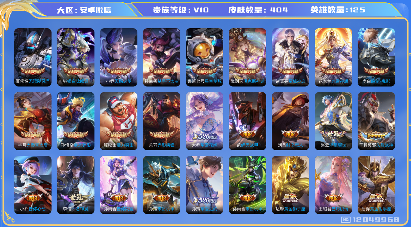 [12049968]V10 13典藏 50传说 125英雄 404皮肤 典藏英雄武则天 可修改实名 优质装备:天鹅之梦(小乔典藏),星空梦想(太空人),倪克斯神谕(宇宙婆娘),无限飓风号(高达),活力突击,杀手不太冷,大秦宣太后,鸣剑·曳影,全息碎影(猴子典藏),星域神启(倪克斯贼亮),九霄神辉(木兰典藏),赤影疾锋,银白咏叹调(倪克斯侍卫),黄金狮子座,黄金射手座,冠军飞将,云鹰飞将(小将军),绛天战甲(鸡嘴战神),黄金白羊座,猫影幻舞,久胜战神,炽阳神光,一念神魔,云霓雀翎,末日机甲-孙尚香(绿蚂蚱),地狱火,仲夏夜之梦(大飞蛾),音你心动-小乔,海洋之心,地狱之眼,飞鸢探春,音你心动-周瑜,胖达荣荣,乞巧织情,时之恋人-刘备(电焊工),游龙清影(小青龙),淬星耀世,超时空战士-狄仁杰,遇见胡旋,末日机甲-孙策,花朝如约(花篮子),挚爱之约,挚爱花嫁,无双飞将,音你闪耀(rap皮),碎云,天秀幻梦,神器·狴犴令,艾琳觅芳踪,涂山容容 珍宝阁皮:优雅恋人 限定皮:鸣野蒿,太华(伽罗年限),异界灵契(白毛香),傲雪梅枪,补天,寅虎·展翼(孙膑年限),星穹之声,绯月行,白鹤梁神女,时雨天司(水龙头),神威(电光马子),高山流水,诗剑行,怒海麟威,降魔,五谷丰年,青龙志(铠年限),武圣,梁祝,如梦令-嫦娥,如梦令-后羿,真爱至上,纯白花嫁,孙行者,猪悟能,一生所爱,天魔缭乱,神奇女侠,匿光追影者,女儿国国王,寅虎·御盾(廉颇年限),寅虎·瑞焰(虎皮蛋子),寅虎·心曲(虎婆),寅虎·赤拳(老虎年限),时之祈愿-云中君,时之祈愿-瑶(瑶传限),时之奇旅-妲己,神器·万象笔,梦圆繁星 史诗皮:灵蛊蚀心,百相守梦-黄忠,遇见神鹿,紫霞仙子,苍穹之光,电玩小子(小书包),白龙吟,黄金分割率,特工魅影,千年之狐,永昼,魅语,蒙恬荣光圣徽,无限星赏官,冰冠公主,青蛇,偶像歌手,白蛇,晚萤,暗夜猫娘,龙骑士(小龙虾),末日机甲-吕布,猫狗日记-孙策,猫狗日记-大乔,时之恋人-孙尚香,乱世虎臣,节奏热浪,修罗,女仆咖啡,摇滚巨星,水果甜心,绅士熊喵,天才门将,星夜王子,心灵骇客,时之奇旅-安琪拉,功夫厨神,德古拉伯爵,暗隐猎兽者,幽灵船长,鬼剑武藏,暗渊魔法,心灵战警,乐园奇幻夜,天秀·启明,舞动绿茵,地狱岩魂,诗语江南,拒霜思,缤纷独角兽,乘风破浪,逐浪之夏,龙鼓争鸣,月团寄思,水晶猎龙者,曙光守护者
