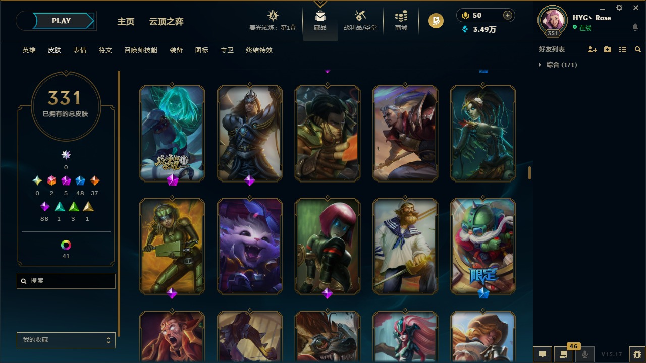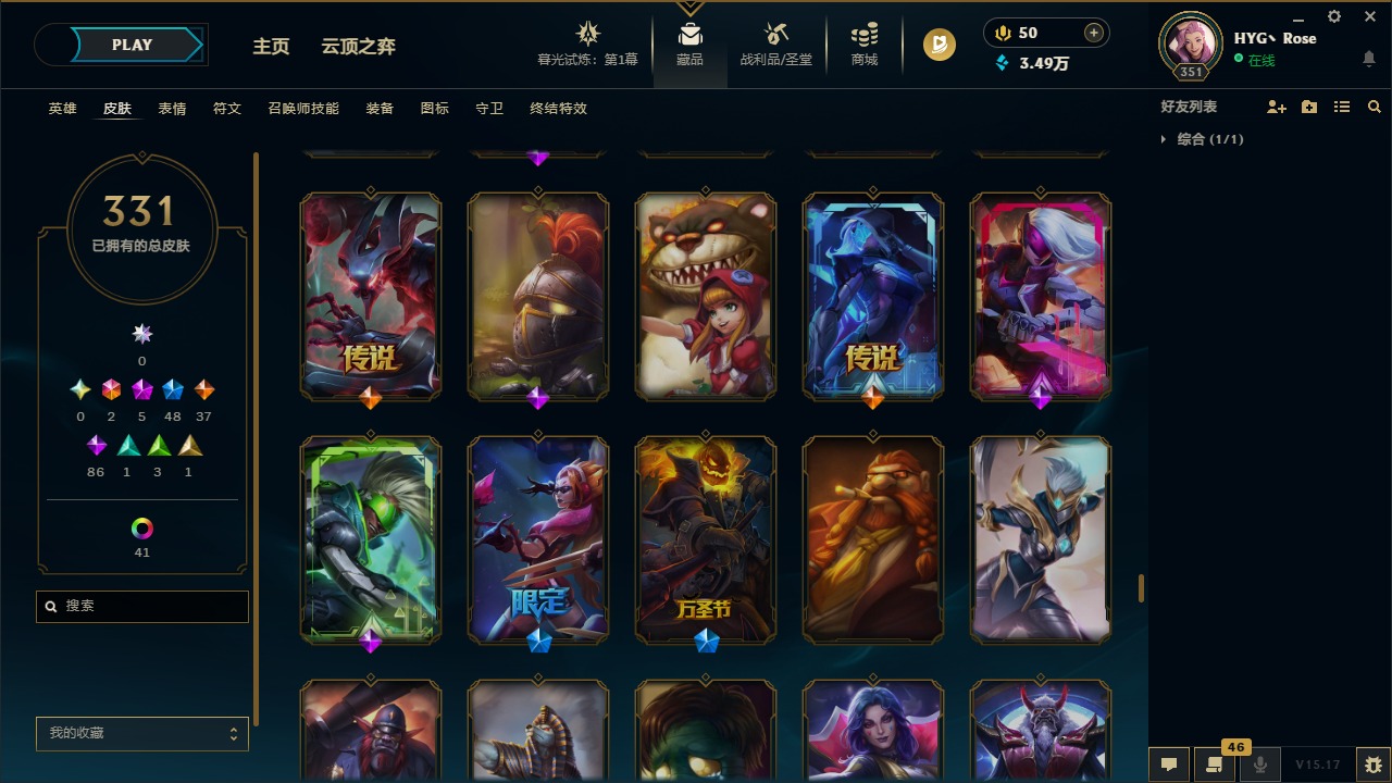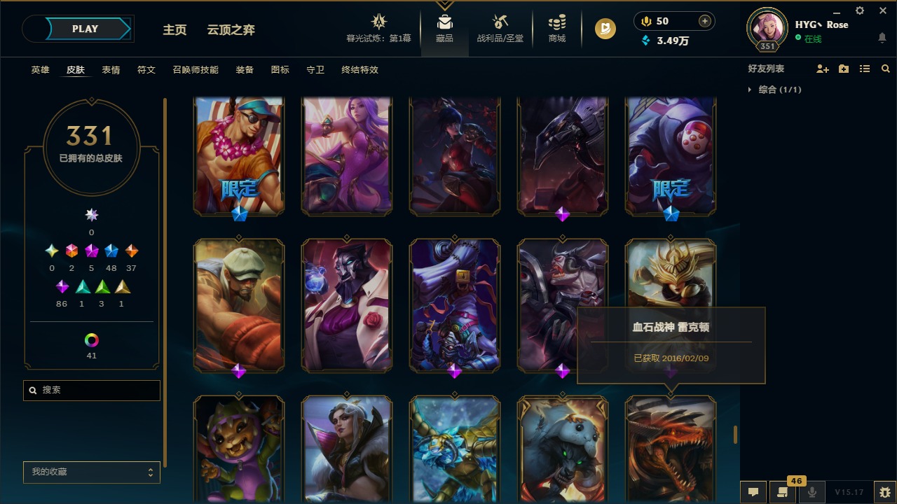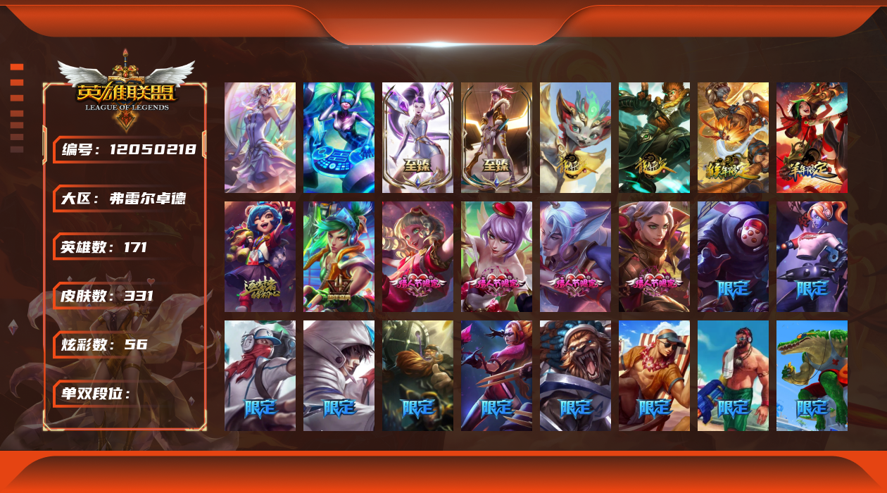 [12050218]2终极 5神话 48限定 37传说 86史诗 331皮肤 56炫彩 171英雄 可二次 可修改实名 优质装备:至臻 K/DA 阿卡丽,至臻 K/DA ALL OUT卡莎,黎明使者 卡尔玛,源代码 乐芙兰,防爆天使 凯尔,巧克力工坊 波比,都铎王朝 图奇,防爆机器人 布里茨,惊悚派对 阿木木,克格汪 克格莫,蒙多蒙多,密林猎手 提莫,送披萨的小姐姐 希维尔,永恒之森 乐芙兰,大元素使,DJ-娑娜,霸天巨兽·雪崩 墨菲特,天煞 劫 恒星游历者,无畏骑士 瑟庄妮 赤子初心,外星装甲 库奇,可爱可爱粉红红 布里茨,净雪之月 莫甘娜 冬虹,魔女 阿卡丽 虚荣,红莲之刃 锐雯,暗裔英雄 盖伦 情人节限定:觅心之翼 奎因,碎心之拳 蔚,甜心宝贝 安妮,甜心之翎 洛 赛季限定皮:胜利女神 娑娜,胜利巨口 克格莫,胜利枪神 格雷福斯,胜利女神 奥利安娜 冠军限定系列:S1FNC 酒桶,S2 暗杀星 发条,S3 SKT T1 贾克斯,S3 SKT T1 婕拉,S4 SSW 雷恩加尔,S4 SSW 泰隆,S4 SSW 炼金 冰雪节限定:冰雪节 炼金,胡桃夹子 小丑,魄罗骑士 瑟庄妮,圣诞狂欢 努努,圣诞老人 酒桶,圣诞糖果棒 厄运小姐,圣诞玩偶 波比,圣诞驯鹿 克格莫,邪恶圣诞老人 维迦,雪球也能爆炸 吉格斯,雪装 奈德丽,北极星猎人 斯维因 泳池派对:泳池派对 男枪,泳池派对 雷克顿,泳池派对 李青 万圣节限定:无头骑士 人马 年限:天龙之子 斯莫德,龙年 孙悟空,羊年 金克丝,猴年 孙悟空 周年:4周年 锐雯,10周年 安妮