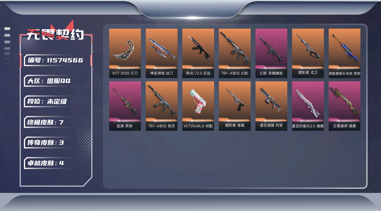 [11574566]【套装】:VCT 2025 赛季套装 【英雄】:幻棱,炼狱,维斯,暮蝶,钛狐,壹决,捷风,幽影,不死鸟,贤者,猎枭,零,芮娜,奇乐,尚勃勒,霓虹,斯凯,夜露,K/O,钢锁 【近战 武器】:近战武器-VCT 2025 爪刀,近战武器-神圣领域 战刀 【狂徒】:狂徒-奇点//2.0,狂徒-诡秘蛇影 【幻影】:幻影-781-A协议,幻影-异鳞魔蛇,幻影-神圣领域 【戍卫】:戍卫-噬影者,戍卫-月球哨兵,戍卫-折光棱晶 【獠犬】:獠犬-神圣领域 【冥驹】:冥驹-源能者娱乐系统,冥驹-起源,冥驹-星云暗涌 【飞将】:飞将-末日之翼 【莽侠】:莽侠-诡秘蛇影,莽侠-月球哨兵 【战神】:战神-神圣领域 【奥丁】:奥丁-末日之翼 【判官】:判官-虚空遗器,判官-诡秘蛇影 【雄鹿】:雄鹿-盖亚的复仇//2.0,雄鹿-日冕雄师,雄鹿-月球哨兵 【骇灵】:骇灵-781-A协议,骇灵-星云暗涌 【蜂刺】:蜂刺-星云暗涌,蜂刺-折光棱晶 【标配】:标配-折光棱晶 【VCT手枪】:标配-VCT25 x BLG 【正义】:正义-月球哨兵 【鬼魅】:鬼魅-噬影者,鬼魅-星云暗涌 【狂怒】:狂怒-神圣领域 【短炮】:短炮-末日之翼 【卡面】:修车达人 卡面,正义的化身 卡面,时间到 卡面,最高舞台 卡面,梦幻奶茶 卡面,无畏契约GO!第一卷:芮娜 卡面,无畏契约GO!第一卷:零 卡面,代号红色 卡面,新兵报到 卡面,V契约 卡面,无畏契约 卡面 【喷漆】:熊抱 喷漆,超级粉丝 喷漆,捷风差距 喷漆,审判之爪 喷漆,拼一枪 喷漆,买装还是存钱 喷漆,关门放狗 喷漆,放下武器 喷漆,胜利属于无畏契约 喷漆,GLHF 喷漆,无畏契约 喷漆 【挂饰】:无畏契约GO!第一卷 芮娜 挂饰,熔岩灯 挂饰,第九季//第二幕 纪念币 挂饰,袖珍捷风 挂饰,第九季//第一幕 纪念币 挂饰,天外飞客 挂饰,无畏契约 纪念币 挂饰