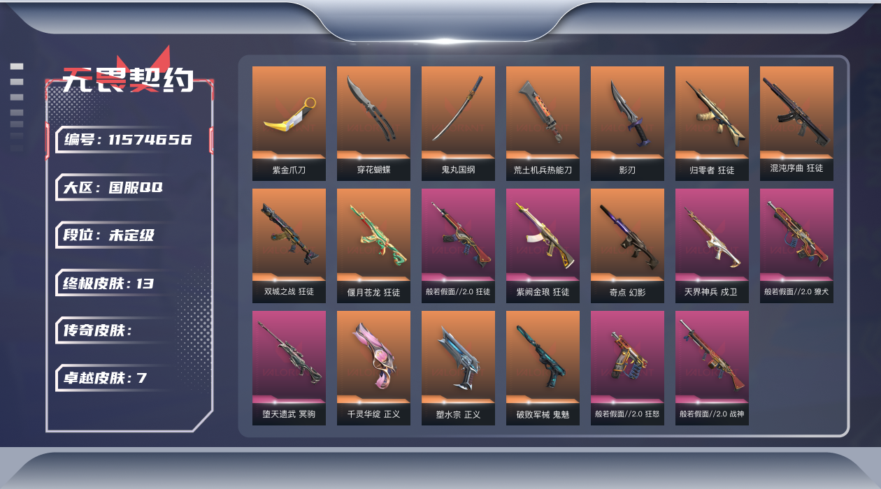 [11574656]【套装】:般若假面//2.0套装 【英雄】:炼狱,壹决,捷风,雷兹,幽影,不死鸟,贤者,猎枭,零,芮娜,霓虹,斯凯,盖可 【近战 武器】:近战武器-紫金爪刀,近战武器-穿花蝴蝶,近战武器-鬼丸国纲,近战武器-荒土机兵 热能刀,近战武器-影刃 【狂徒】:狂徒-归零者,狂徒-混沌序曲,狂徒-双城之战,狂徒-偃月苍龙,狂徒-般若假面//2.0,狂徒-紫阙金琅,狂徒-荒土机兵 【幻影】:幻影-奇点,幻影-纳米打击 【戍卫】:戍卫-天界神兵,戍卫-逆冲蛮牛 【獠犬】:獠犬-般若假面//2.0,獠犬-逆冲蛮牛 【冥驹】:冥驹-堕天遗武,冥驹-荒土机兵 【战神】:战神-般若假面//2.0 【奥丁】:奥丁-纳米打击 【判官】:判官-纳米打击x 【雄鹿】:雄鹿-逆冲蛮牛 【骇灵】:骇灵-荒土机兵 【标配】:标配-荒土机兵 【正义】:正义-千灵华绽,正义-塑水宗,正义-纳米打击 【鬼魅】:鬼魅-破败军械 【狂怒】:狂怒-般若假面//2.0,狂怒-逆冲蛮牛 【卡面】:终章:激斗汉堡 卡面,进入射程 卡面,分崩离析 卡面,纳米打击 卡面,抑制技术 卡面,激斗汉堡 卡面,瓦娃脸雪糕 P2 卡面,从黄昏到黎明 卡面,荒土机兵 卡面,银弹猎手 卡面,逆冲蛮牛 卡面,《双城之战》拥抱 卡面,精灵大战 卡面,欢迎来到底城 卡面,南瓜盛典 卡面,树懒大作战 卡面,无垠星环 卡面,《双城之战》金克丝 卡面,代号红色 卡面,新兵报到 卡面,V契约 卡面,无畏契约 卡面 【喷漆】:小小心意 喷漆,战“素”兔 喷漆,宇宙的指引 喷漆,请求重启 喷漆,逆冲蛮牛 喷漆,纳米打击 喷漆,鼻尖上的蝴蝶 喷漆,简笔画黯兽 喷漆,独守蝰腹 喷漆,他们将落荒而逃 喷漆,通缉:战术企鹅 喷漆,荒土机兵 喷漆,别挡我吃球! 喷漆,嗨宝南瓜灯 喷漆,嘭! 喷漆,都算到了 喷漆,控场勿近 喷漆,放下武器 喷漆,胜利属于无畏契约 喷漆,GLHF 喷漆,无畏契约 喷漆 【挂饰】:终章:猫猫木乃伊 挂饰,荒土机兵 挂饰,悠闲鸡块 挂饰,猫猫木乃伊 挂饰,水壶 挂饰,纳米打击 挂饰,逆冲蛮牛 挂饰,可爱糖糖 挂饰,伞绳 挂饰,《双城之战》小蛋糕 挂饰,第九季//第三幕 纪念币 挂饰,Z世代特饮 挂饰,动力机箱 挂饰,无畏契约 纪念币 挂饰
