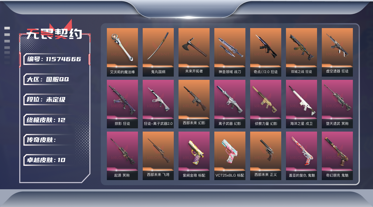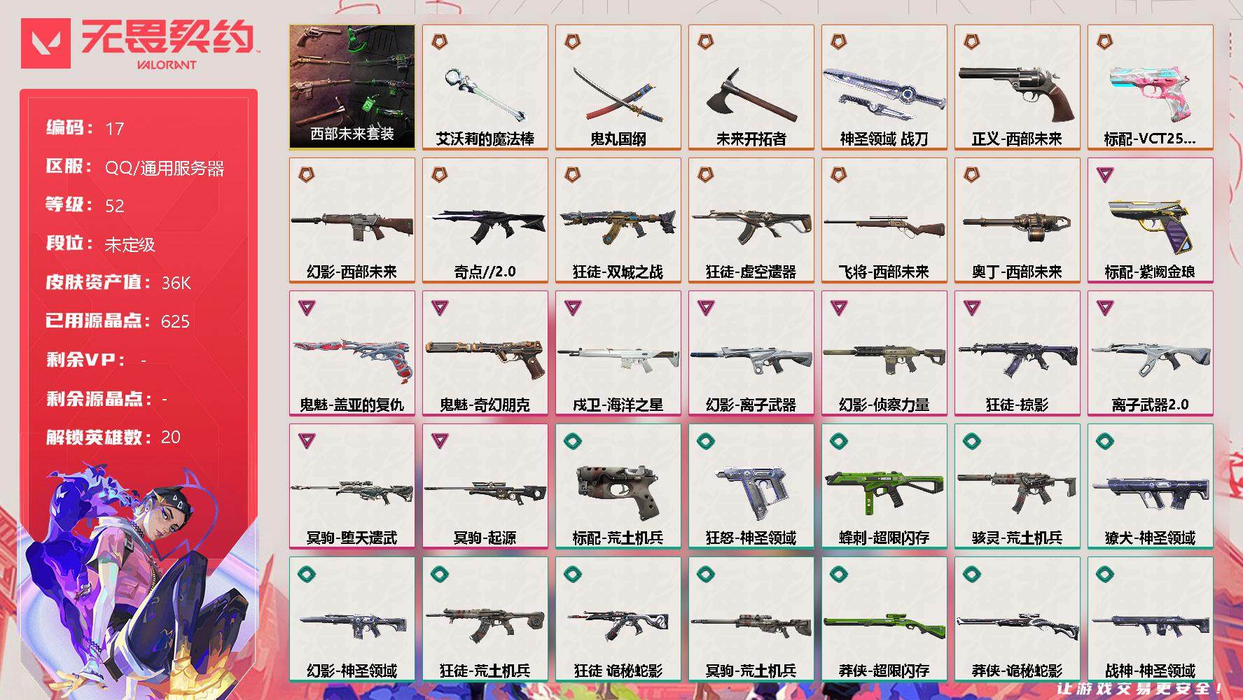 [11574666]【套装】:西部未来套装 【英雄】:幻棱,炼狱,维斯,暮蝶,钛狐,捷风,雷兹,幽影,不死鸟,贤者,猎枭,零,芮娜,奇乐,尚勃勒,霓虹,斯凯,星礈,K/O,钢锁 【近战 武器】:近战武器-艾沃莉的魔法棒,近战武器-鬼丸国纲,近战武器-未来开拓者,近战武器-神圣领域 战刀 【狂徒】:狂徒-奇点//2.0,狂徒-双城之战,狂徒-虚空遗器,狂徒-掠影,狂徒-离子武器//2.0,狂徒-荒土机兵,狂徒-诡秘蛇影 【幻影】:幻影-西部未来,幻影-离子武器,幻影-侦察力量,幻影-神圣领域,幻影-纳米打击,幻影-西部未来 【戍卫】:戍卫-海洋之星,戍卫-浮光跃金,戍卫-逆冲蛮牛,戍卫-月球哨兵,戍卫-折光棱晶 【獠犬】:獠犬-神圣领域,獠犬-模拟赫兹,獠犬-逆冲蛮牛 【冥驹】:冥驹-堕天遗武,冥驹-起源,冥驹-荒土机兵,冥驹-模拟赫兹,冥驹-星云暗涌 【飞将】:飞将-西部未来,飞将-末日之翼 【莽侠】:莽侠-超限闪存,莽侠-诡秘蛇影,莽侠-月球哨兵 【战神】:战神-神圣领域,战神-浮光跃金 【奥丁】:奥丁-西部未来,奥丁-纳米打击,奥丁-末日之翼 【判官】:判官-诡秘蛇影,判官-纳米打击x 【雄鹿】:雄鹿-模拟赫兹,雄鹿-逆冲蛮牛,雄鹿-月球哨兵 【骇灵】:骇灵-荒土机兵,骇灵-浮光跃金,骇灵-星云暗涌 【蜂刺】:蜂刺-超限闪存,蜂刺-星云暗涌,蜂刺-折光棱晶 【标配】:标配-紫阙金琅,标配-荒土机兵,标配-浮光跃金,标配-折光棱晶 【VCT手枪】:标配-VCT25 x BLG 【正义】:正义-西部未来,正义-月球哨兵 【鬼魅】:鬼魅-盖亚的复仇,鬼魅-奇幻朋克,鬼魅-模拟赫兹,鬼魅-星云暗涌 【狂怒】:狂怒-神圣领域,狂怒-逆冲蛮牛 【短炮】:短炮-末日之翼 【卡面】:纳米打击 卡面,抑制技术 卡面,激斗汉堡 卡面,瓦娃脸雪糕 P2 卡面,从黄昏到黎明 卡面,荒土机兵 卡面,银弹猎手 卡面,逆冲蛮牛 卡面,《双城之战》拥抱 卡面,精灵大战 卡面,欢迎来到底城 卡面,南瓜盛典 卡面,钢弓与箭弦 卡面,排除故障 卡面,战术桌游 卡面,悠享食光 卡面,修车达人 卡面,模拟赫兹 卡面,浮光跃金 卡面,超限闪存 卡面,维斯工牌 卡面,正义的化身 卡面,红鳞松叶 卡面,无畏契约GO!第一卷:芮娜 卡面,无畏契约GO!第一卷:零 卡面,《双城之战》金克丝 卡面,代号红色 卡面,新兵报到 卡面,V
