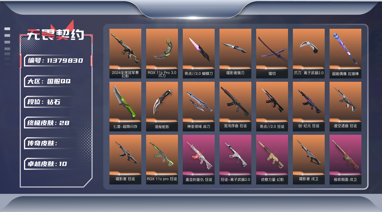[11379830]【套装】:创·纪元套装,噬影者套装,奇点//2.0套装,离子武器//2.0套装 【英雄】:幻棱,炼狱,维斯,暮蝶,钛狐,壹决,铁臂,捷风,雷兹,幽影,不死鸟,贤者,猎枭,蝰蛇,零,芮娜,奇乐,尚勃勒,霓虹,斯凯,夜露,星礈,K/O,海神,盖可,黑梦,钢锁 【近战 武器】:近战武器-RGX 11z Pro//3.0 爪刀,近战武器-奇点//2.0 蝴蝶刀,近战武器-噬影者 簇刃,近战武器-镭切,近战武器-离子武器//2.0 爪刀,近战武器-超能偶像 应援棒,近战武器-超限闪存 匕首,近战武器-诡秘蛇影 军刀,近战武器-神圣领域 战刀 【狂徒】:狂徒-混沌序曲,狂徒-奇点//2.0,狂徒-创·纪元,狂徒-虚空遗器,狂徒-噬影者,狂徒-RGX 11z Pro,狂徒-盖亚的复仇,狂徒-离子武器//2.0,狂徒-超能偶像,狂徒-诡秘蛇影 【幻影】:幻影-2024全球冠军赛,幻影-侦察力量,幻影-超限闪存,幻影-神圣领域,幻影-聚合之力,幻影-末日之翼 【戍卫】:戍卫-噬影者,戍卫-般若假面,戍卫-超能偶像,戍卫-浮光跃金,戍卫-月球哨兵,戍卫-折光棱晶 【獠犬】:獠犬-黯夜怪谈,獠犬-神圣领域,獠犬-采蜜小蜂队,獠犬-模拟赫兹 【冥驹】:冥驹-堕天遗武,冥驹-模拟赫兹,冥驹-星云暗涌 【飞将】:飞将-聚合之力,飞将-末日之翼 【莽侠】:莽侠-创·纪元,莽侠-超限闪存,莽侠-诡秘蛇影,莽侠-月球哨兵 【战神】:战神-离子武器//2.0,战神-神圣领域,战神-采蜜小蜂队,战神-浮光跃金 【奥丁】:奥丁-末日之翼 【判官】:判官-超能偶像,判官-诡秘蛇影,判官-采蜜小蜂队 【雄鹿】:雄鹿-模拟赫兹,雄鹿-月球哨兵 【骇灵】:骇灵-创·纪元,骇灵-离子武器//2.0,骇灵-浮光跃金,骇灵-星云暗涌 【蜂刺】:蜂刺-噬影者,蜂刺-超限闪存,蜂刺-聚合之力,蜂刺-星云暗涌,蜂刺-折光棱晶 【标配】:标配-超能偶像,标配-浮光跃金,标配-折光棱晶 【VCT手枪】:标配-VCT25 x EDG 【正义】:正义-创·纪元,正义-西部未来,正义-离子武器,正义-超限闪存,正义-纳米打击,正义-月球哨兵 【鬼魅】:鬼魅-奇点//2.0,鬼魅-噬影者,鬼魅-耀鳞威龙,鬼魅-流星兵团,鬼魅-诡秘蛇影,鬼魅-采蜜小蜂队,鬼魅-灵魂消声者,鬼魅-模拟赫兹,鬼魅-扑棱扑棱,鬼魅-星云暗涌 【狂怒】:狂怒-