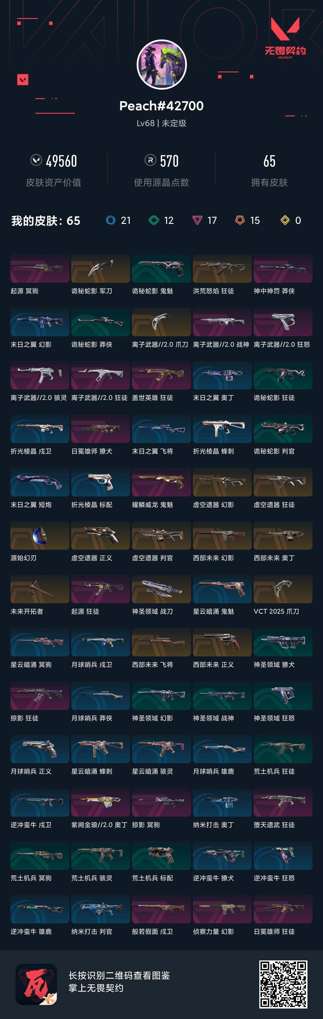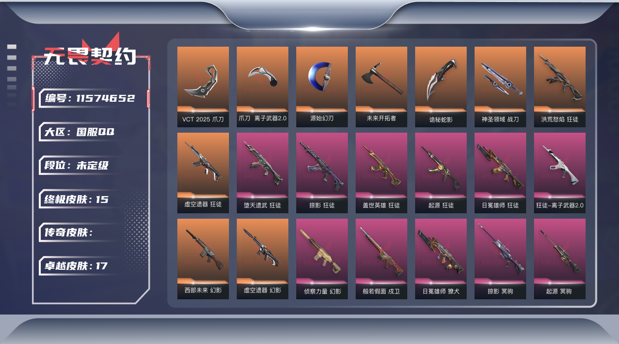- [12316708]39橙皮 2金皮 13紫皮 112皮肤 27英雄 98卡面 1110已用源晶 未定级 优质装备:千灵华绽套装,紫阙金琅套装,奇点套装,2023全球冠军赛套装,离火刃,正义-双城之战,正义-奇点,冥驹-偃月苍龙,狂徒-2023全球冠军赛,狂徒-归零者,幻影-781-A协议,幻影-千灵华绽,冥驹-千灵华绽,狂徒-混沌序曲,幻影-奇点,幻影-砰砰X特攻队,狂徒-紫阙金琅,幻影-侦察力量,狂徒-机动狂飙,正义-千灵华绽,冥驹-全息波普//2.0,奥丁-艾沃莉的梦之翼,标配-紫阙金琅,骇灵-奇点,奥丁-砰砰X特攻队,军刀-合金战车,金琅斧,军刀-奇点,撬棍-白日幻梦,鬼魅-盖亚的复仇,机动狂飙战刀,奥丁-紫阙金琅2.0,骇灵-塑水宗,判官-千灵华绽,落英飞旋,标配-全息波普//2.0,鬼丸国纲,VCT 2025 爪刀,噬影者簇刃,离子武器2.0 爪刀,骇灵-紫阙金琅,戍卫-紫阙金琅 亮点皮肤:苦无-2023全球冠军赛 套装:白日幻梦套装,离子武器2.0,噬影者,VCT 2025赛季礼包,VCTCN2025套装 佩枪皮肤:狂怒-离子武器2.0,鬼魅-噬影者,标配-VCT25xT1,正义-猩红猛兽 冲锋枪皮肤:骇灵-离子武器2.0,蜂刺-噬影者 步枪皮肤:狂徒-创·纪元,戍卫-噬影者,狂徒-噬影者,狂徒-离子武器2.0,狂徒-海洋之星 狙击枪皮肤:飞将-黯夜怪谈 机枪皮肤:战神-奇点,战神-离子武器2.0 近战武器皮肤:短剑-流星兵团