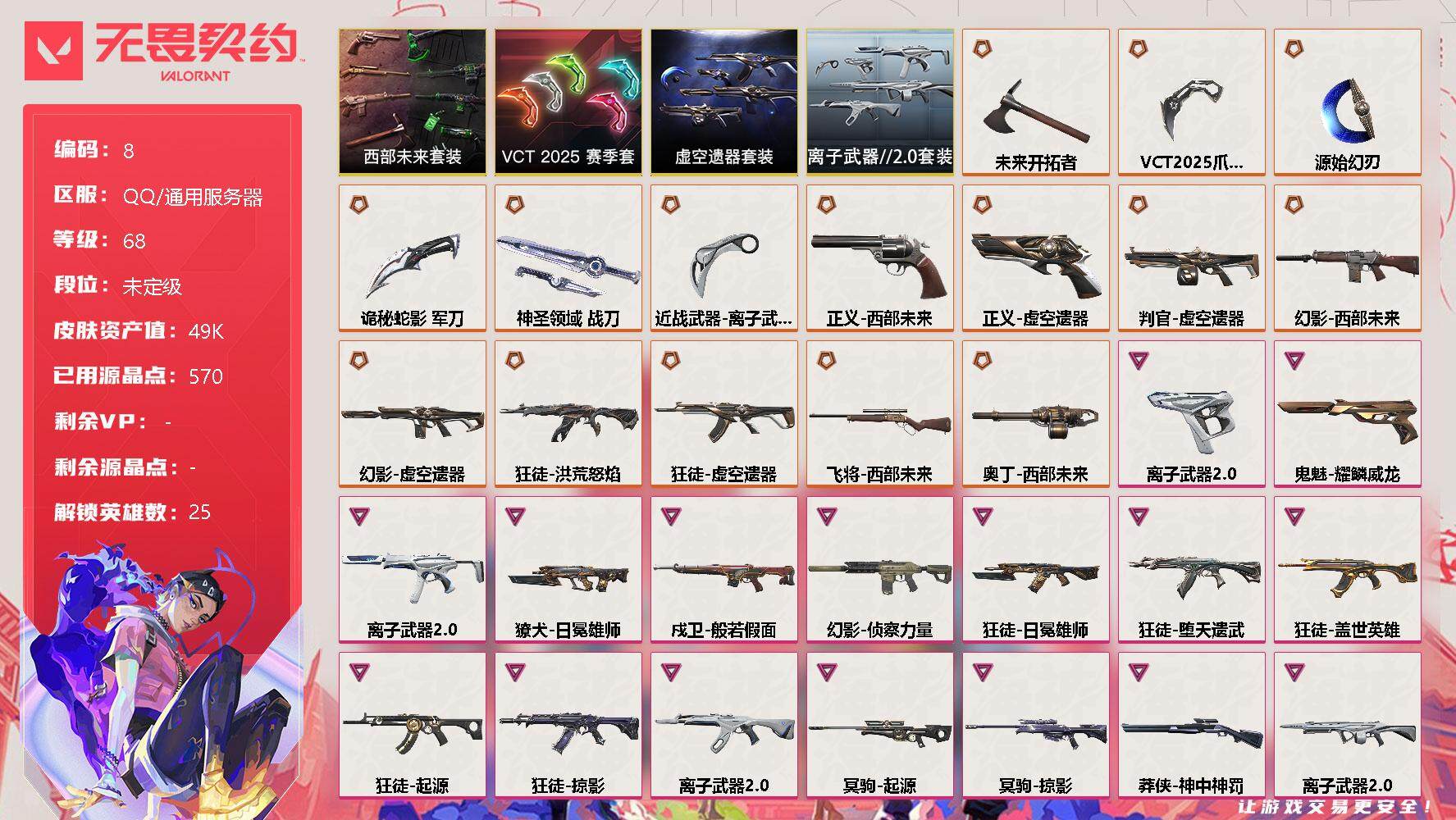 [11574652]【套装】:西部未来套装,VCT 2025 赛季套装,虚空遗器套装,离子武器//2.0套装 【英雄】:幻棱,炼狱,暮蝶,钛狐,壹决,铁臂,捷风,雷兹,幽影,不死鸟,贤者,猎枭,蝰蛇,零,芮娜,奇乐,尚勃勒,霓虹,斯凯,星礈,K/O,海神,盖可,黑梦,钢锁 【近战 武器】:近战武器-VCT 2025 爪刀,近战武器-离子武器//2.0 爪刀,近战武器-源始幻刃,近战武器-未来开拓者,近战武器-诡秘蛇影 军刀,近战武器-神圣领域 战刀 【狂徒】:狂徒-洪荒怒焰,狂徒-虚空遗器,狂徒-堕天遗武,狂徒-掠影,狂徒-盖世英雄,狂徒-起源,狂徒-日冕雄师,狂徒-离子武器//2.0,狂徒-荒土机兵,狂徒-诡秘蛇影 【幻影】:幻影-西部未来,幻影-虚空遗器,幻影-侦察力量,幻影-神圣领域,幻影-末日之翼,幻影-西部未来 【戍卫】:戍卫-般若假面,戍卫-逆冲蛮牛,戍卫-月球哨兵,戍卫-折光棱晶 【獠犬】:獠犬-日冕雄师,獠犬-神圣领域,獠犬-逆冲蛮牛 【冥驹】:冥驹-掠影,冥驹-起源,冥驹-荒土机兵,冥驹-星云暗涌 【飞将】:飞将-西部未来,飞将-末日之翼 【莽侠】:莽侠-神中神罚,莽侠-诡秘蛇影,莽侠-月球哨兵 【战神】:战神-离子武器//2.0,战神-神圣领域 【奥丁】:奥丁-西部未来,奥丁-紫阙金琅//2.0,奥丁-纳米打击,奥丁-末日之翼 【判官】:判官-虚空遗器,判官-诡秘蛇影,判官-纳米打击x 【雄鹿】:雄鹿-逆冲蛮牛,雄鹿-月球哨兵 【骇灵】:骇灵-离子武器//2.0,骇灵-荒土机兵,骇灵-星云暗涌 【蜂刺】:蜂刺-星云暗涌,蜂刺-折光棱晶 【标配】:标配-荒土机兵,标配-折光棱晶 【正义】:正义-西部未来,正义-虚空遗器,正义-月球哨兵 【鬼魅】:鬼魅-耀鳞威龙,鬼魅-诡秘蛇影,鬼魅-星云暗涌 【狂怒】:狂怒-离子武器//2.0,狂怒-神圣领域,狂怒-逆冲蛮牛 【短炮】:短炮-末日之翼 【卡面】:纳米打击 卡面,抑制技术 卡面,激斗汉堡 卡面,瓦娃脸雪糕 P2 卡面,从黄昏到黎明 卡面,荒土机兵 卡面,银弹猎手 卡面,逆冲蛮牛 卡面,精灵大战 卡面,南瓜盛典 卡面,正义的化身 卡面,树懒大作战 卡面,无畏契约GO!第一卷:芮娜 卡面,无畏契约GO!第一卷:零 卡面,无畏契约GO!第一卷:贤者 卡面,代号红色 卡面,新兵报到 卡面,V契约 卡面,无畏契约 卡面 【喷漆】