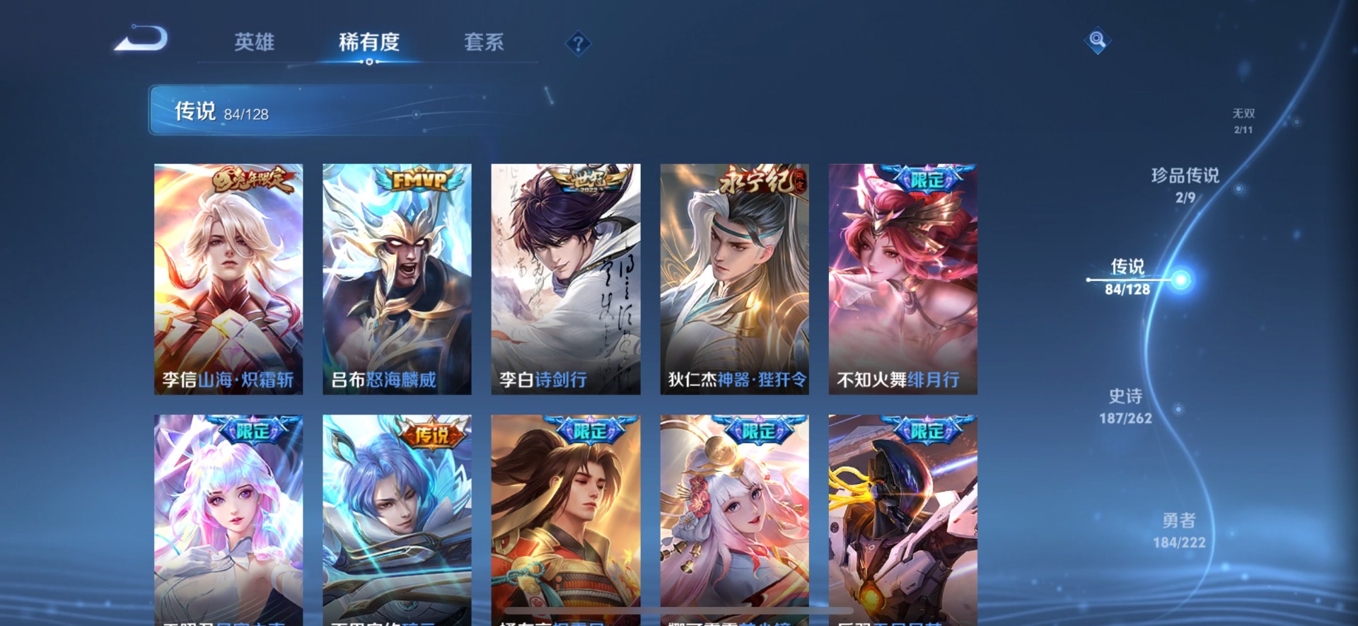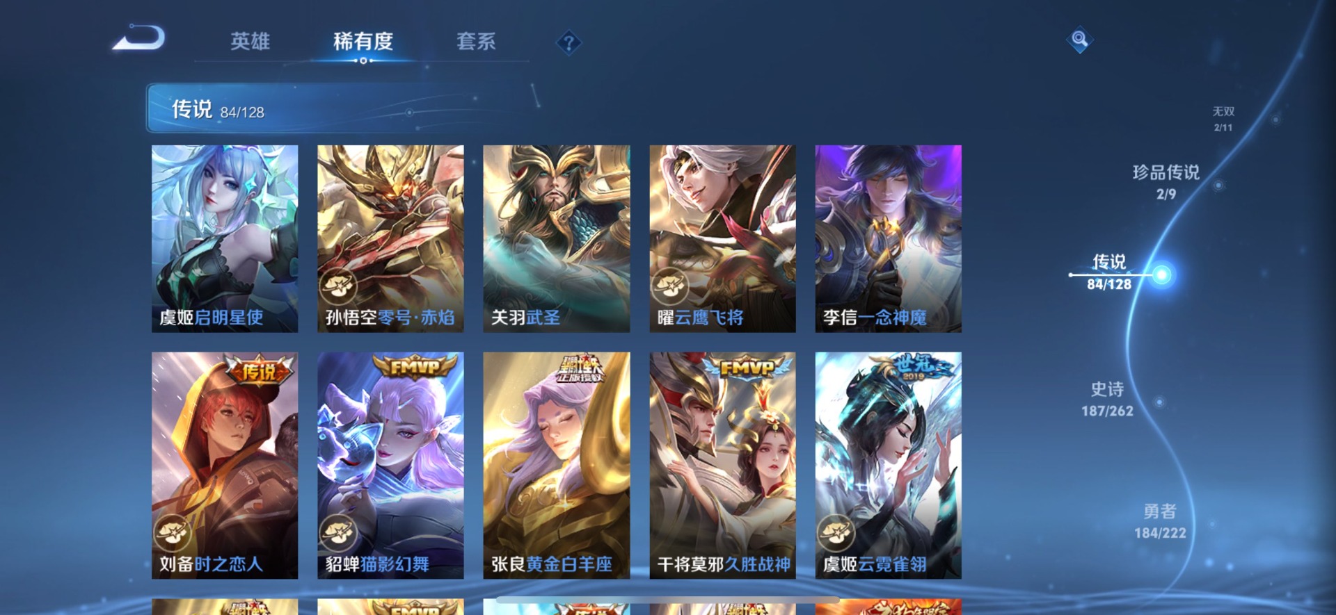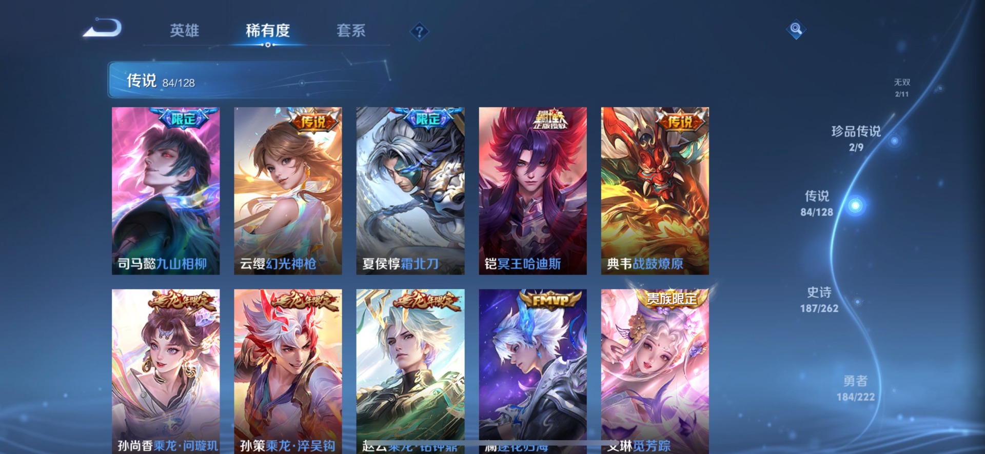 金蝉唐三藏,夏侯惇霜北刀,黄忠烈魂,苏烈玄武志,小乔纯白花嫁,孙尚香异界灵契,不知火舞绯月行,牛魔奔雷神使,项羽霸王别姬,露娜启示之音,露娜一生所爱,庄周玄嵩,镜匿光追影者,庄周云端筑梦师,周瑜真爱至上,诸葛亮时雨天司,杨玉环寅虎·心曲,裴擒虎李小龙,裴擒虎天狼狩猎者,裴擒虎寅虎·赤拳,东皇太一逐梦之光,上官婉儿神器·万象笔,上官婉儿天狼绘梦者,花木兰默契交锋,花木兰瑞麟志,花木兰青春决赛季,马可波罗逐梦之星,马可波罗山海·玄木吟,猪八戒猪悟能,孙悟空孙行者,孙悟空至尊宝,芈月白晶晶,云中君时之祈愿,韩信傲雪梅枪,百里守约朱雀志,墨子降魔,虞姬霸王别姬,嫦娥如梦令,王昭君凤凰于飞,王昭君星穹之声,橘右京枫霜尽,甄姬幽恒,甄姬女儿国国王,铠青龙志,廉颇寅虎·御盾,伽罗天狼溯光者,张飞虎魄,赵云百木心枪,赵云龙胆,孙膑寅虎·展翼,干将莫邪冰霜恋舞曲,典韦岱宗,鲁班七号寅虎·瑞焰,后羿无尽星芒,吕布御风骁将,后羿如梦令,后羿辉光之辰,兰陵王默契交锋,公孙离玉兔公主,兰陵王影龙天霄,李白诗剑行,安琪拉魔法小厨娘,女娲补天,马超神威,妲己时之彼端,妲己时之奇旅,瑶时之祈愿,瑶山海·碧波行,娜可露露前尘镜,关羽武圣,关羽冰锋战神