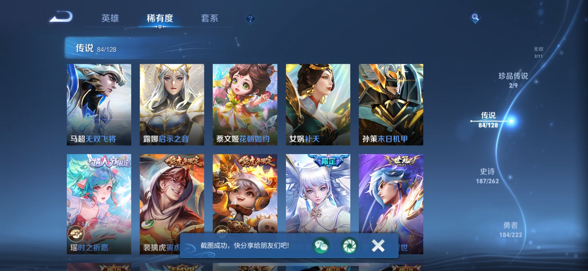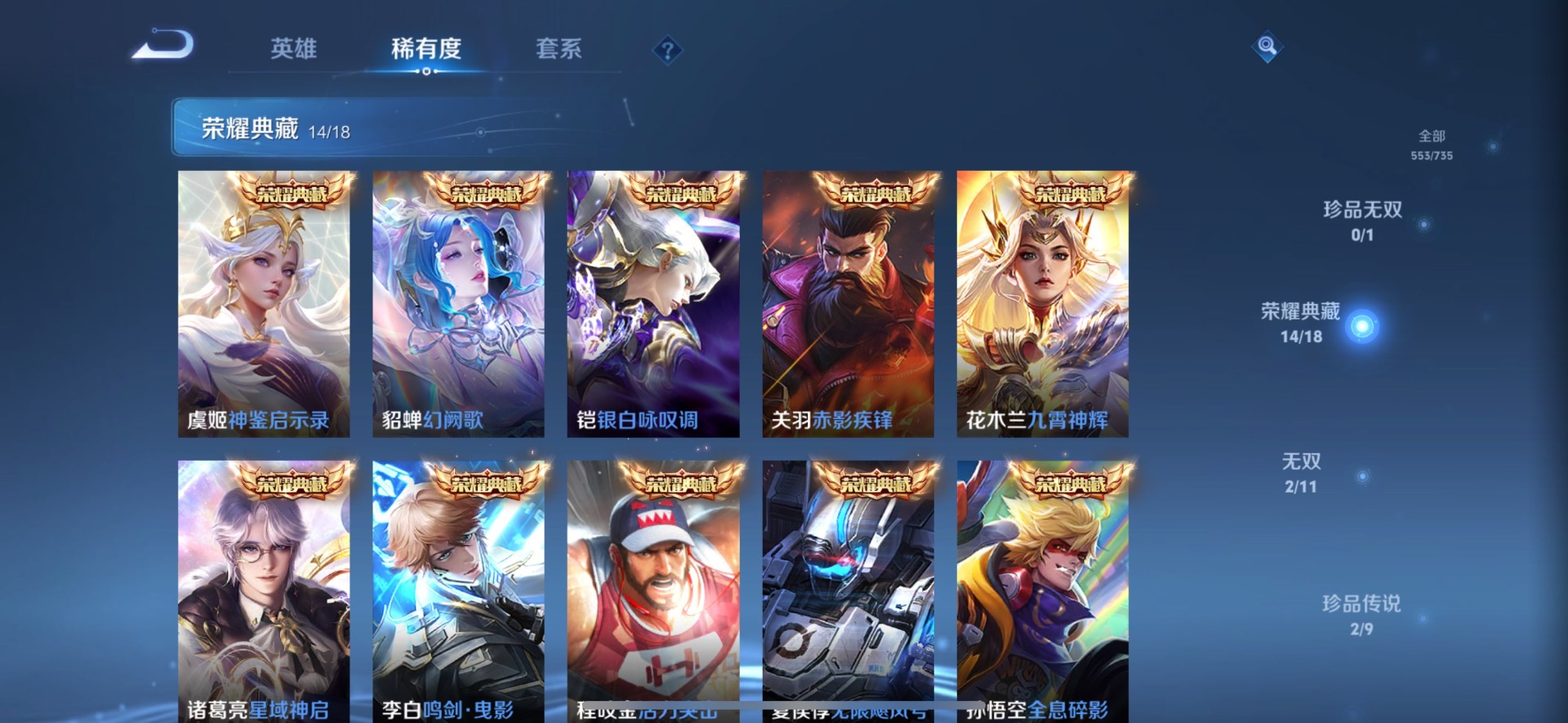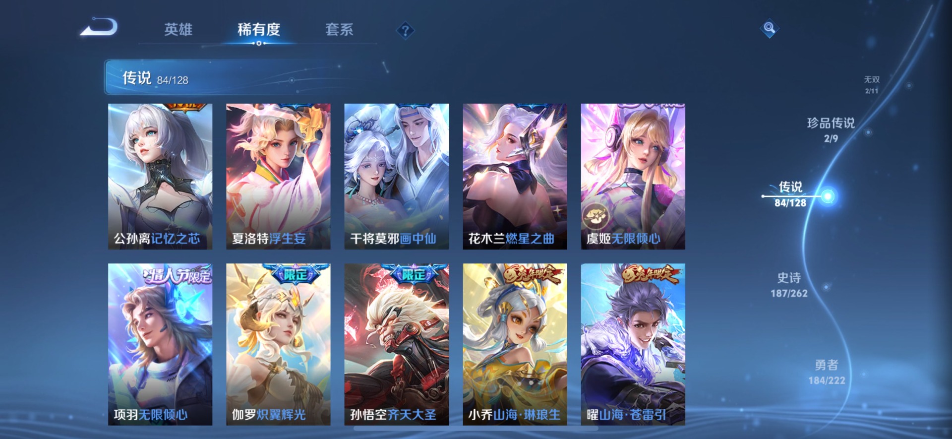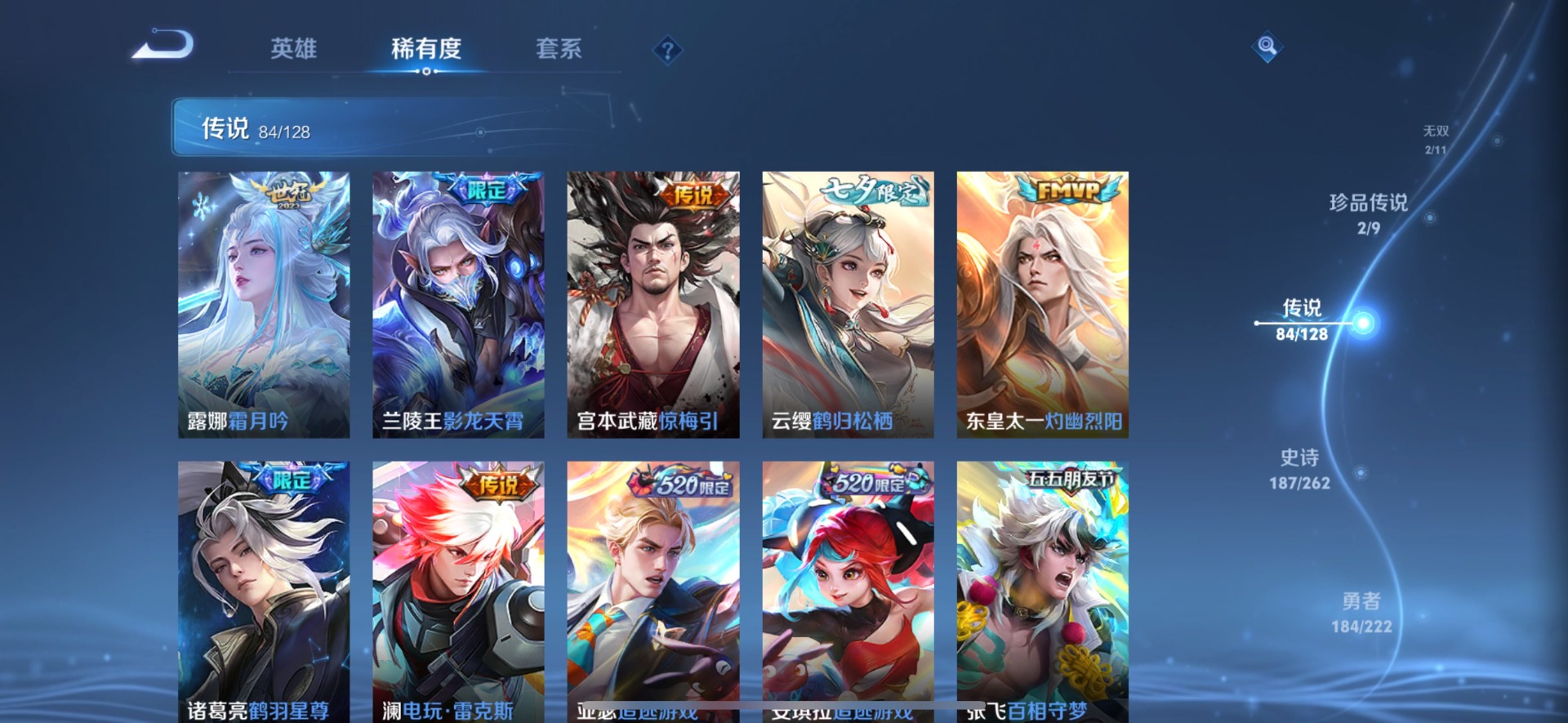 金蝉唐三藏,夏侯惇霜北刀,黄忠烈魂,苏烈玄武志,小乔纯白花嫁,孙尚香异界灵契,不知火舞绯月行,牛魔奔雷神使,项羽霸王别姬,露娜启示之音,露娜一生所爱,庄周玄嵩,镜匿光追影者,庄周云端筑梦师,周瑜真爱至上,诸葛亮时雨天司,杨玉环寅虎·心曲,裴擒虎李小龙,裴擒虎天狼狩猎者,裴擒虎寅虎·赤拳,东皇太一逐梦之光,上官婉儿神器·万象笔,上官婉儿天狼绘梦者,花木兰默契交锋,花木兰瑞麟志,花木兰青春决赛季,马可波罗逐梦之星,马可波罗山海·玄木吟,猪八戒猪悟能,孙悟空孙行者,孙悟空至尊宝,芈月白晶晶,云中君时之祈愿,韩信傲雪梅枪,百里守约朱雀志,墨子降魔,虞姬霸王别姬,嫦娥如梦令,王昭君凤凰于飞,王昭君星穹之声,橘右京枫霜尽,甄姬幽恒,甄姬女儿国国王,铠青龙志,廉颇寅虎·御盾,伽罗天狼溯光者,张飞虎魄,赵云百木心枪,赵云龙胆,孙膑寅虎·展翼,干将莫邪冰霜恋舞曲,典韦岱宗,鲁班七号寅虎·瑞焰,后羿无尽星芒,吕布御风骁将,后羿如梦令,后羿辉光之辰,兰陵王默契交锋,公孙离玉兔公主,兰陵王影龙天霄,李白诗剑行,安琪拉魔法小厨娘,女娲补天,马超神威,妲己时之彼端,妲己时之奇旅,瑶时之祈愿,瑶山海·碧波行,娜可露露前尘镜,关羽武圣,关羽冰锋战神
