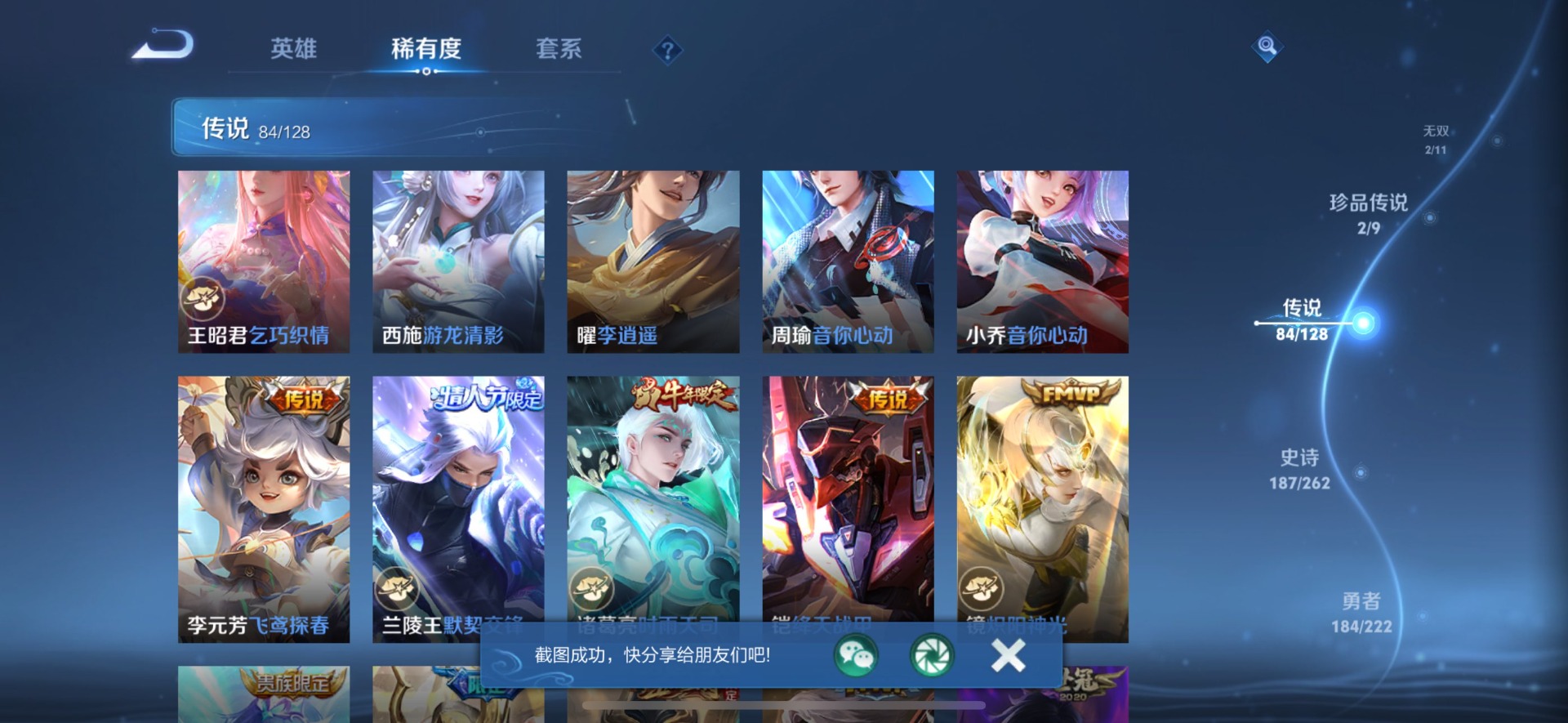 刘备时之恋人,小乔音你心动,李信一念神魔,孙尚香乘龙·问璇玑,露娜霜月吟,镜炽阳神光,周瑜音你心动,宫本武藏惊梅引,貂蝉猫影幻舞,张良黄金白羊座,孙悟空零号·赤焰,曜云鹰飞将,曜李逍遥,百里守约碎云,澜逐花归海,虞姬云霓雀翎,铠绛天战甲,铠冥王哈迪斯,赵云乘龙·铭钟鼎,张飞百相守梦,赵云淬星耀世,干将莫邪久胜战神,典韦战鼓燎原,干将莫邪画中仙,孙策末日机甲,孙策乘龙·淬吴钩,达摩黄金狮子座,王昭君乞巧织情,公孙离记忆之芯,夏洛特浮生妄,安琪拉追逃游戏,艾琳觅芳踪,西施游龙清影,亚瑟追逃游戏,狄仁杰神器·狴犴令,马超无双飞将,李元芳飞鸢探春,蔡文姬花朝如约,云缨幻光神枪